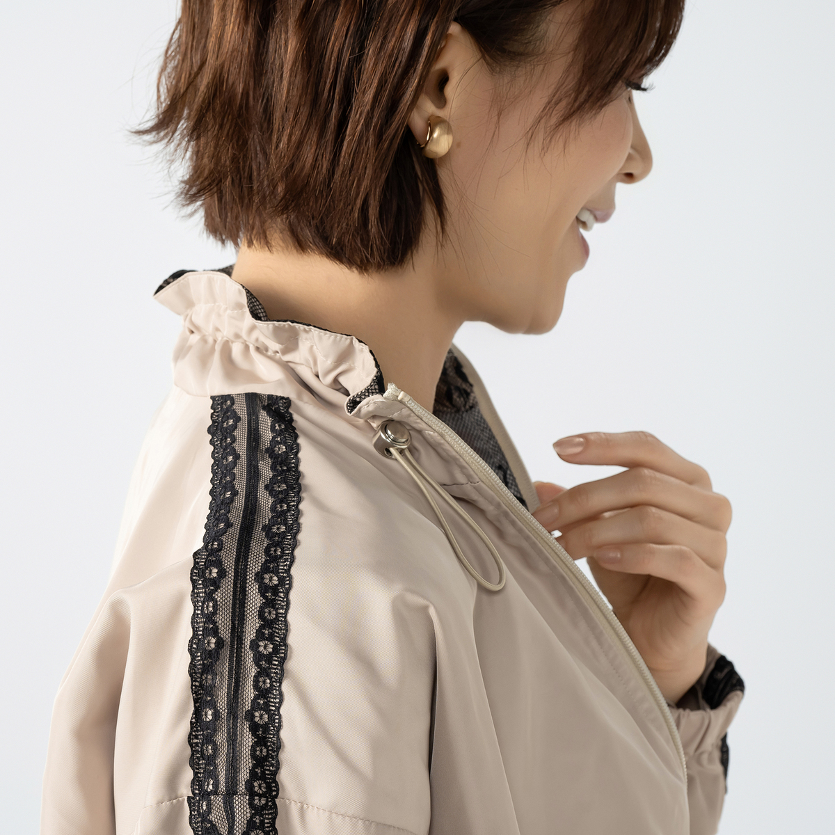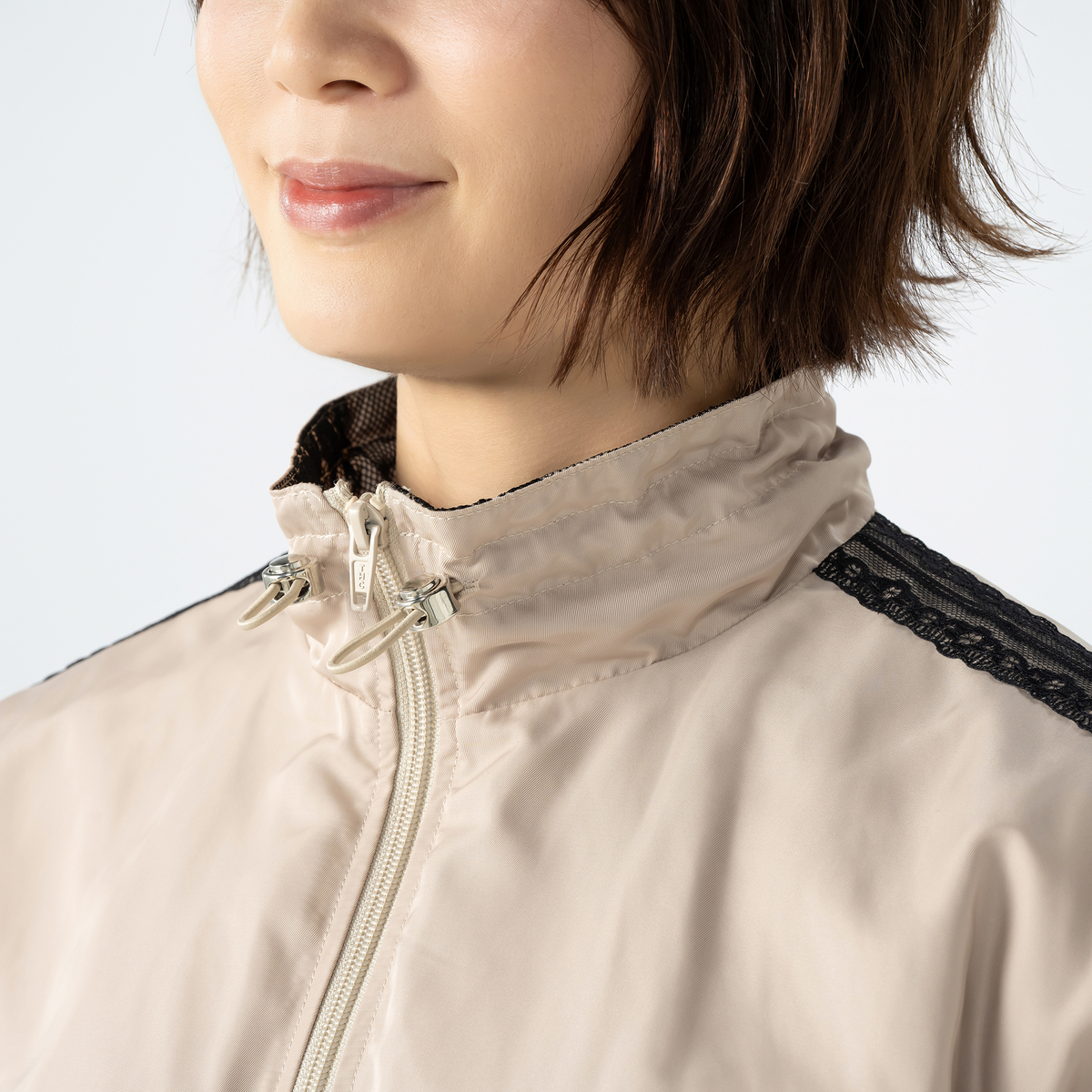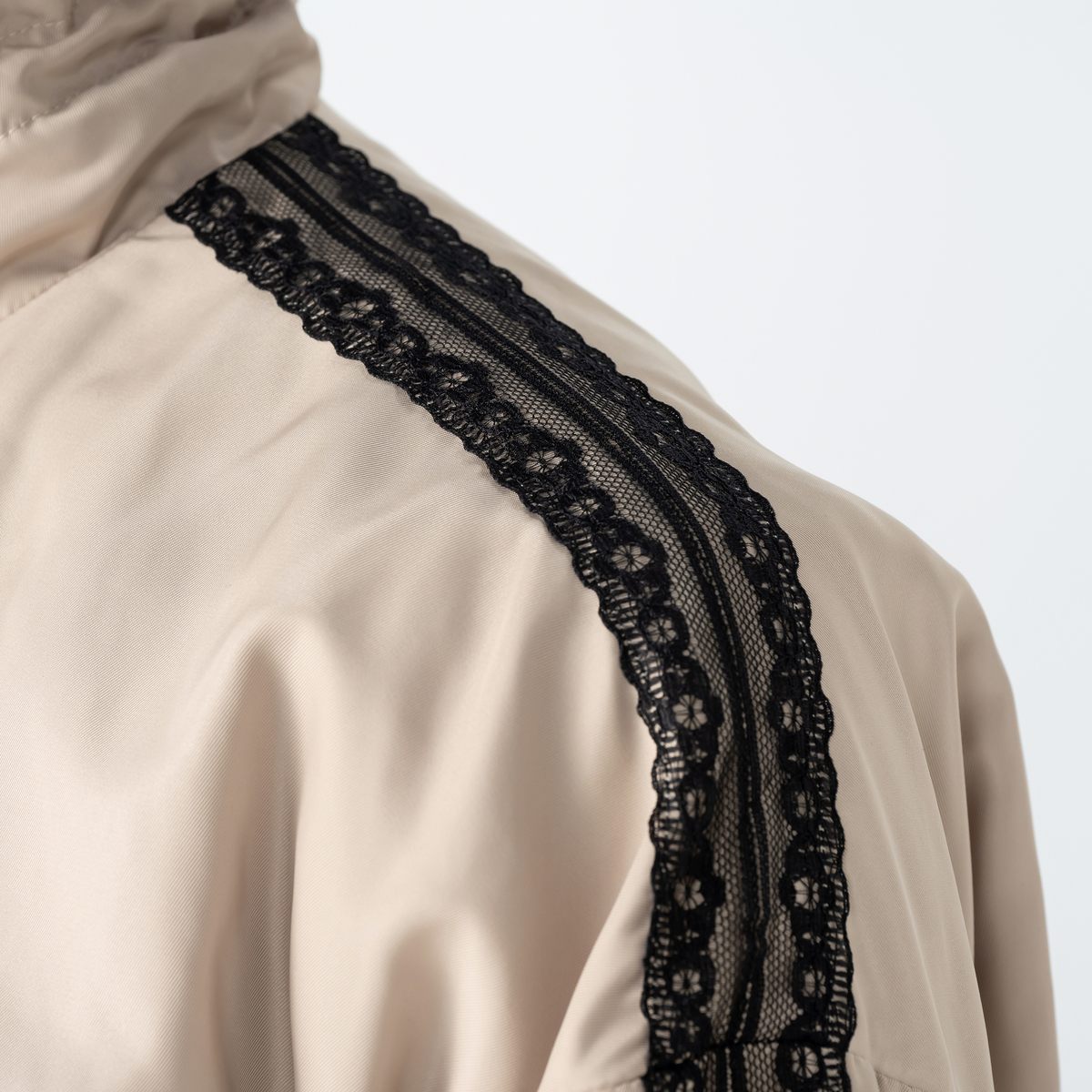 衿裏と身返しにもレースをあしらい、前を開けて着ることでさりげなくレースが見えるデザイン。スタンド衿には丸ゴムを通し、金属調のストッパーで調節できる仕様です