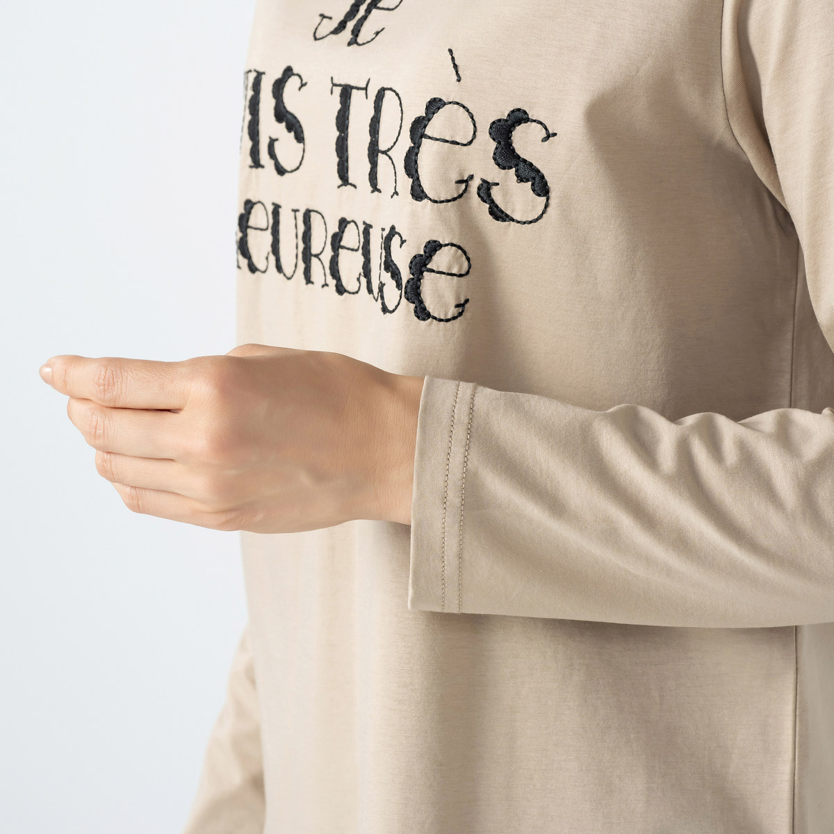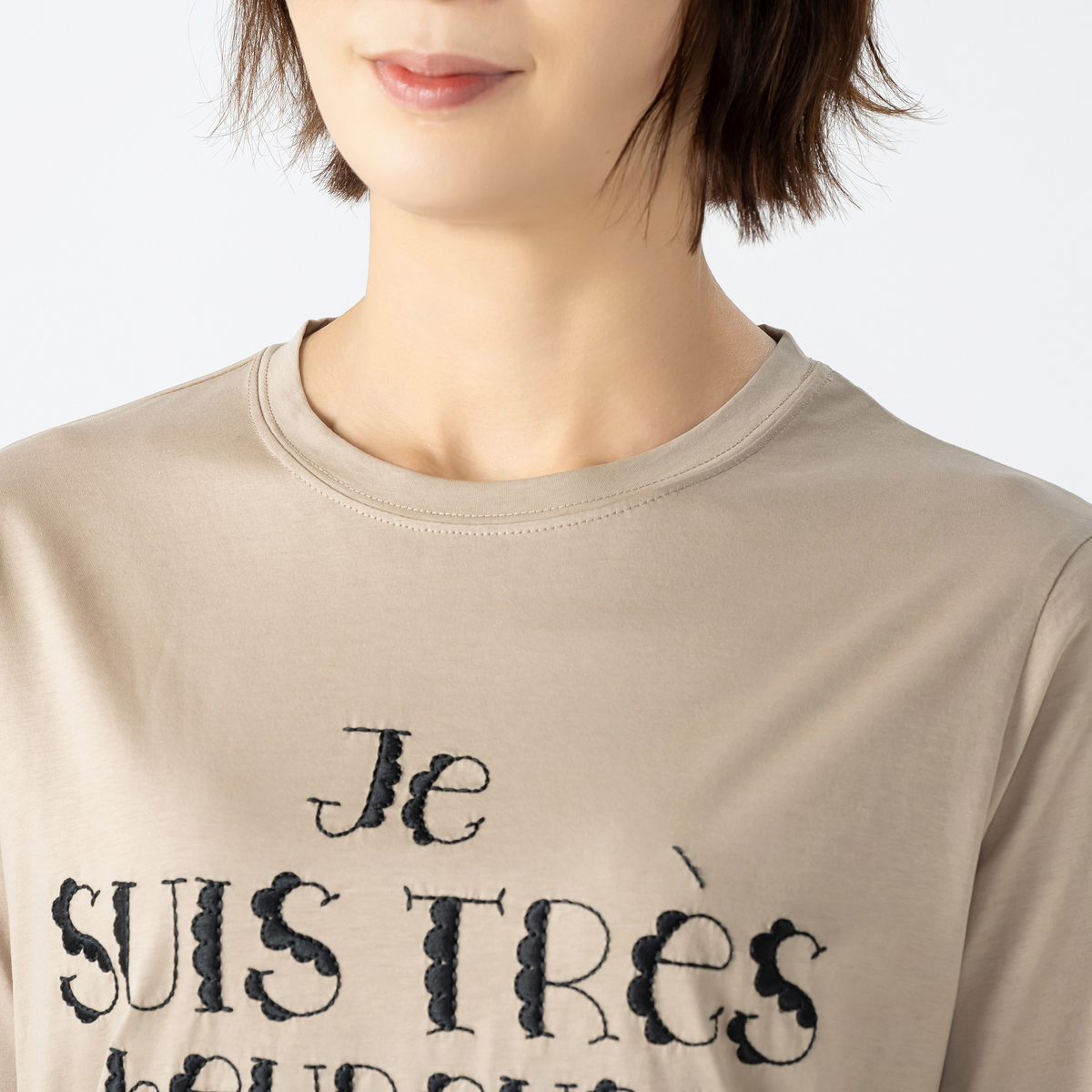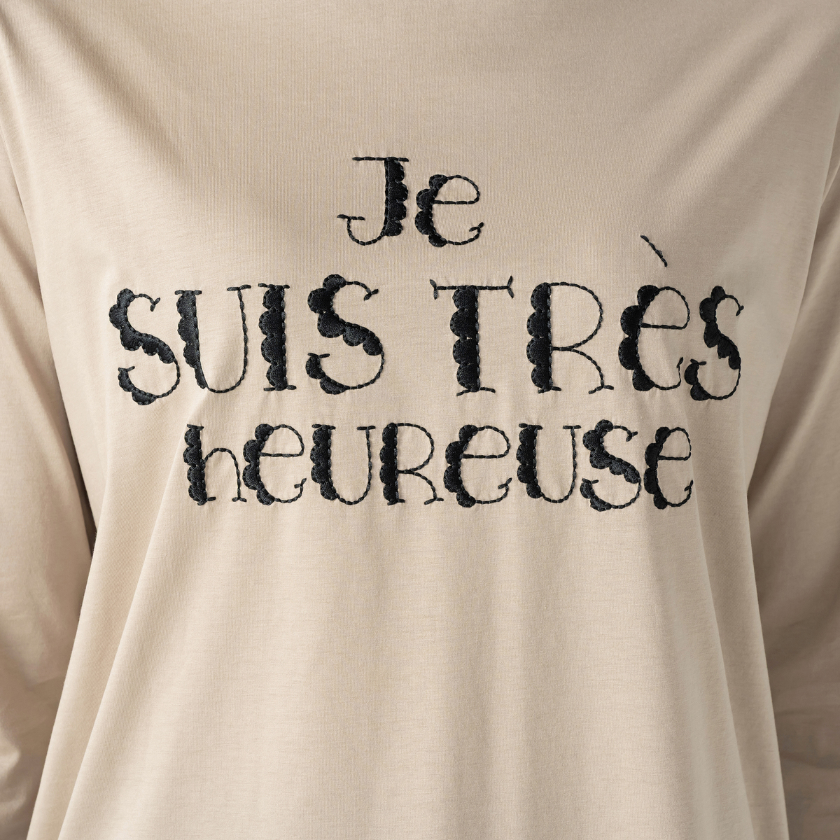 胸元の立体的な刺繍が目を引くプルオーバー。フランス語で"私はとても幸せだ"というメッセージが綴られています