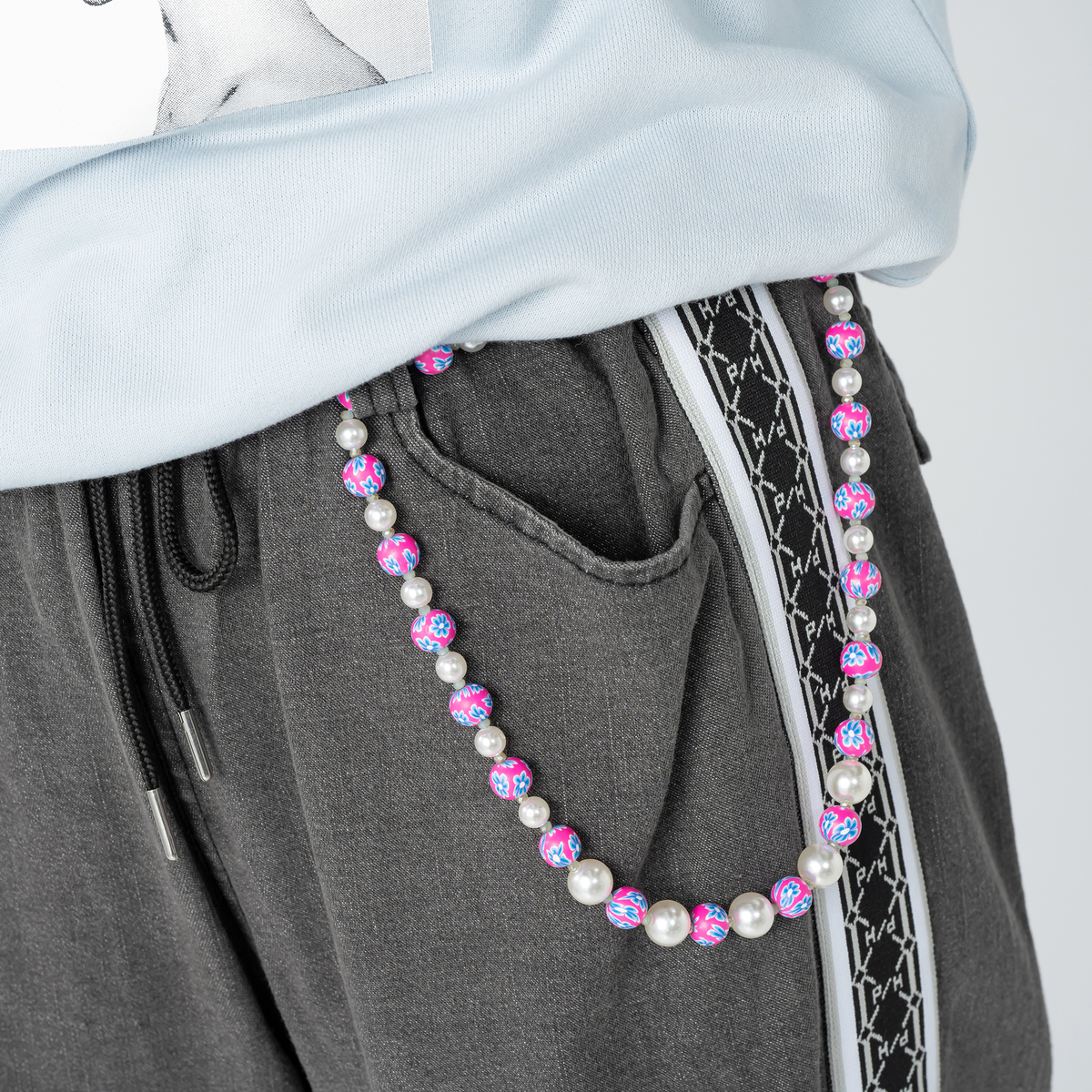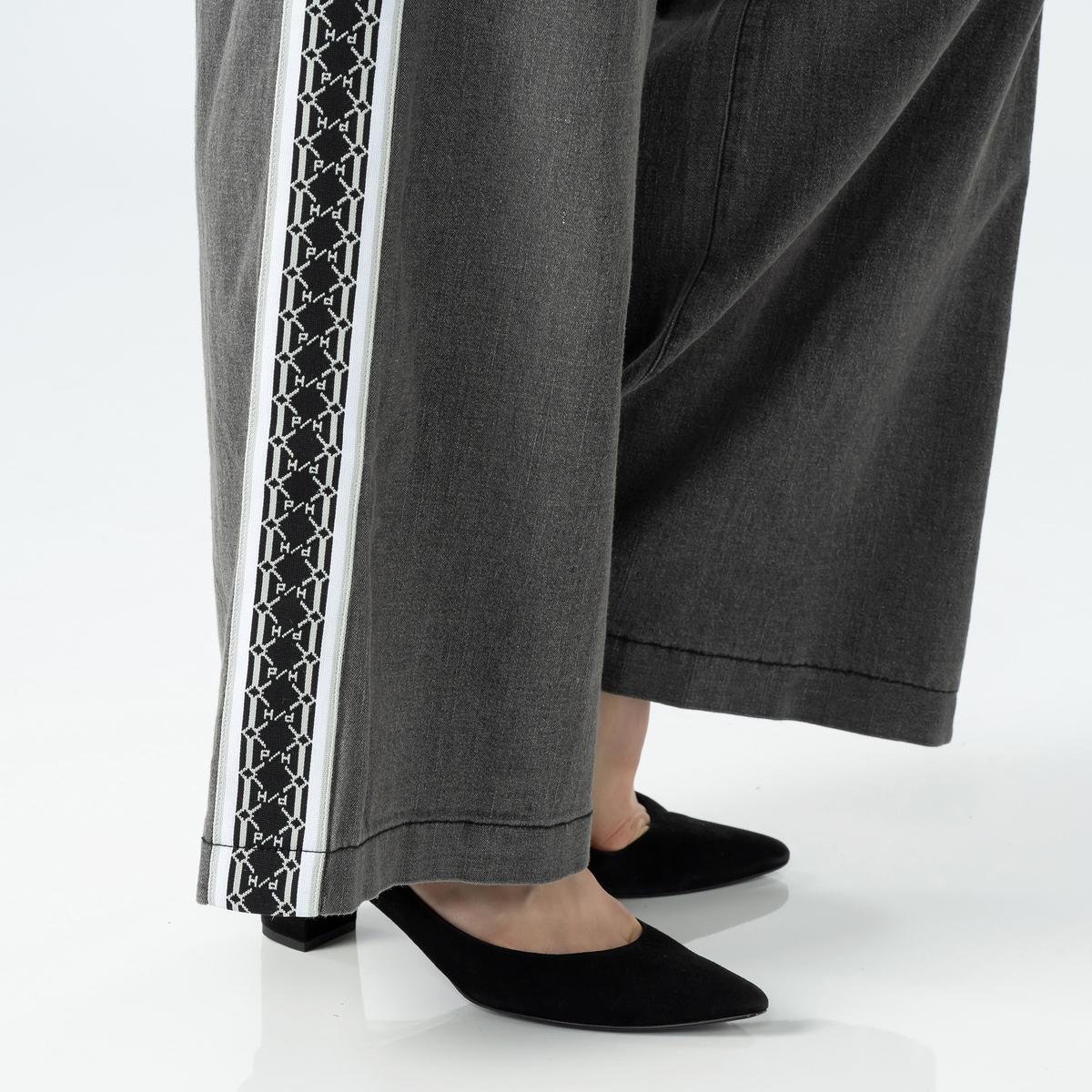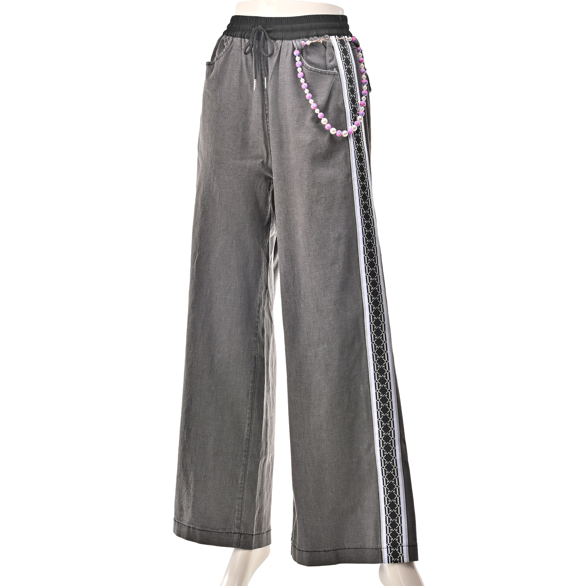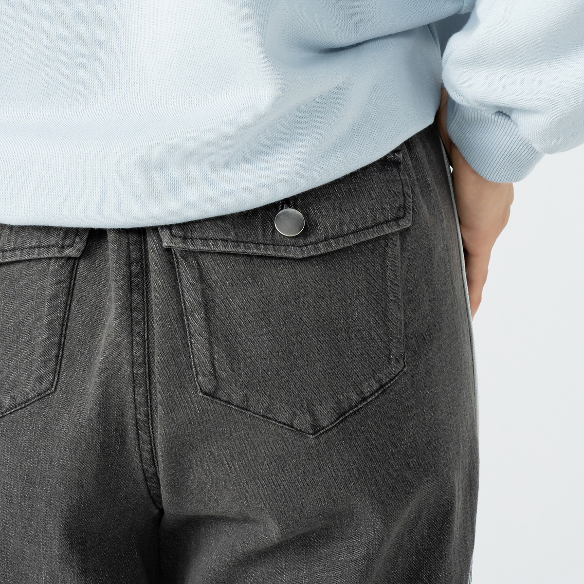 サイドにあしらった「PX」ロゴのジャカードニットテープがポイントのデニムワイドパンツ。左脇の前後に付けたタブに付属のネックレスを通して、遊び心のあるコーデが楽しめます