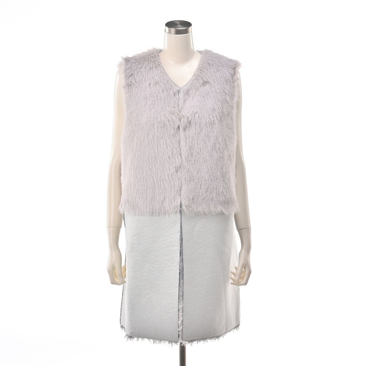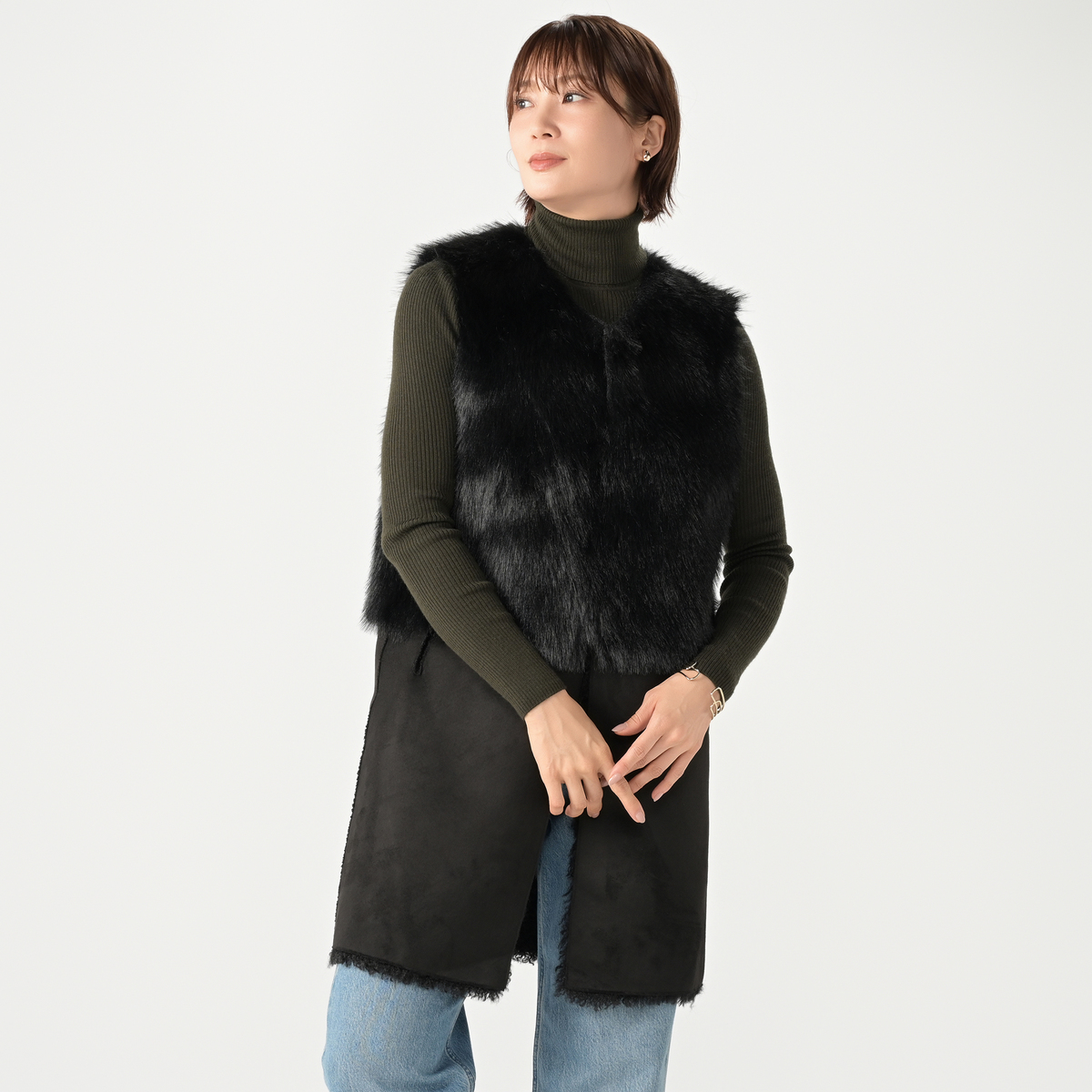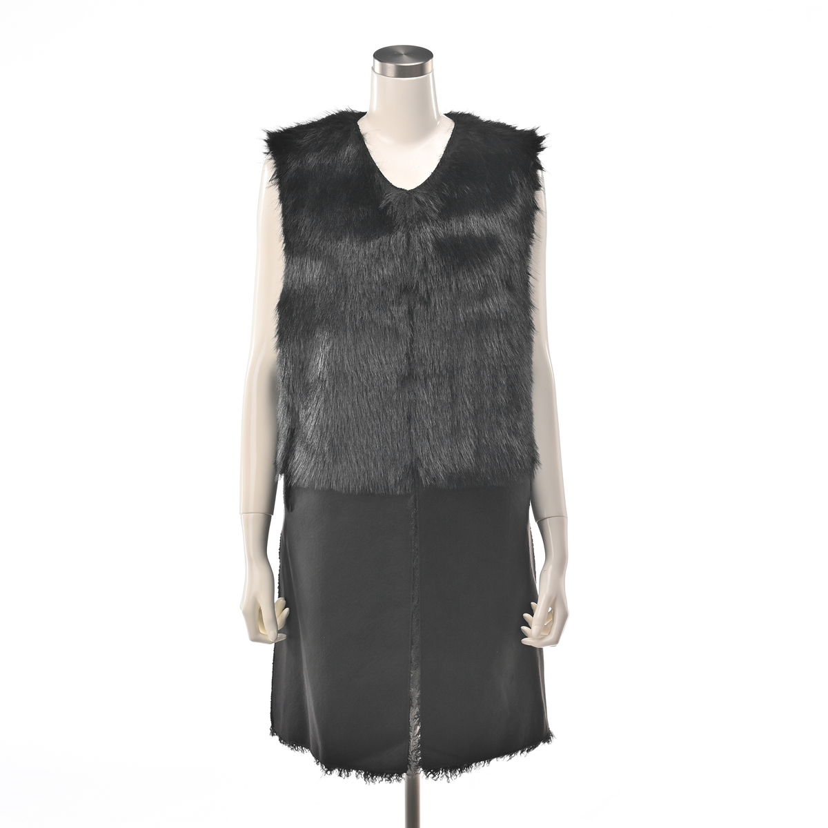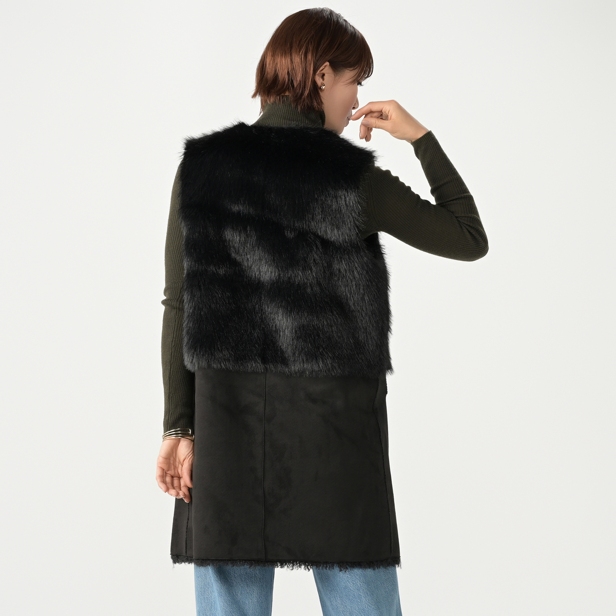 リアルファーのようなボリュームで、毛皮側とスエード側を切り替えたロングジレ。エコファーは主に化学繊維を原料として、動物の毛皮(リアルファー)に似せて生産・加工をした素材とされています