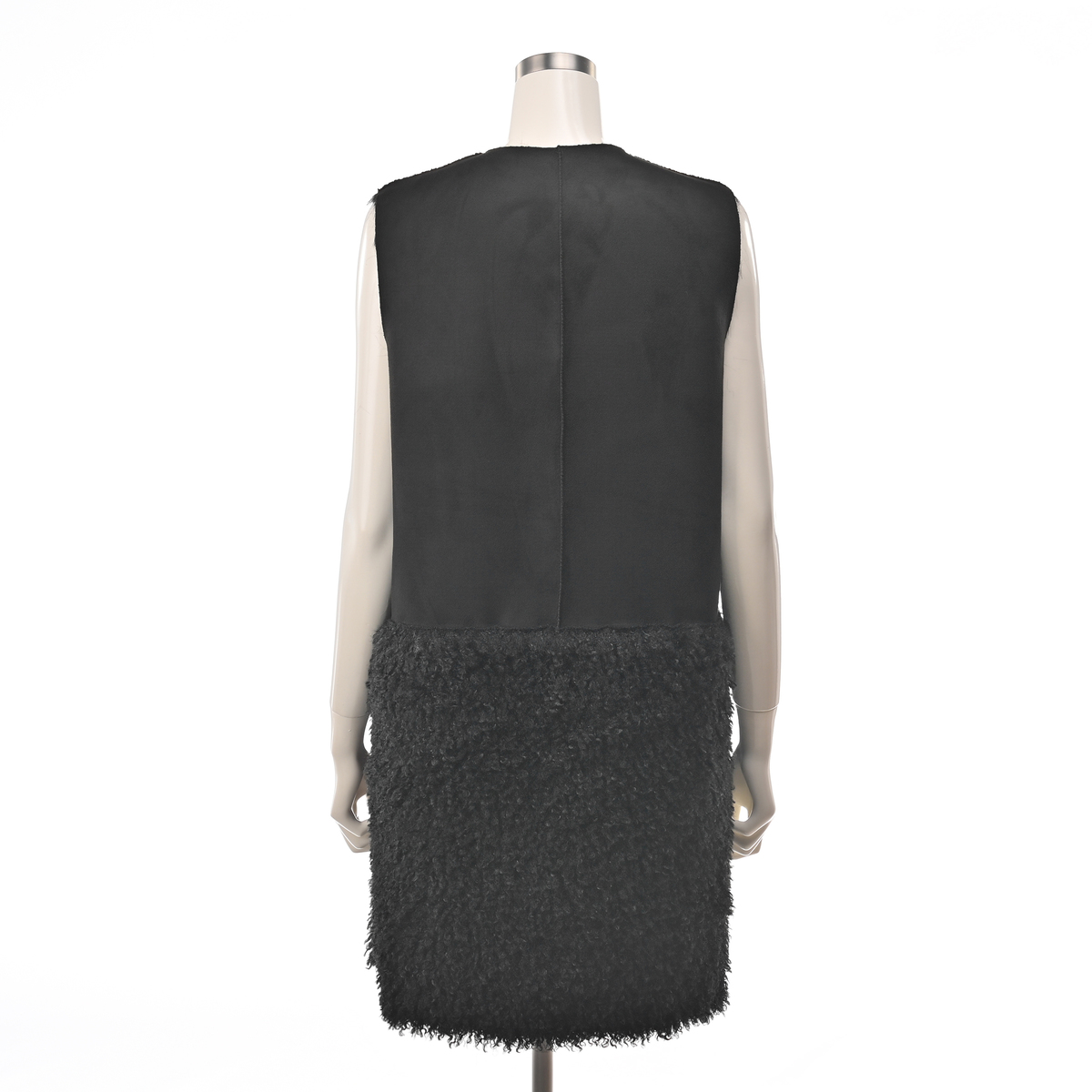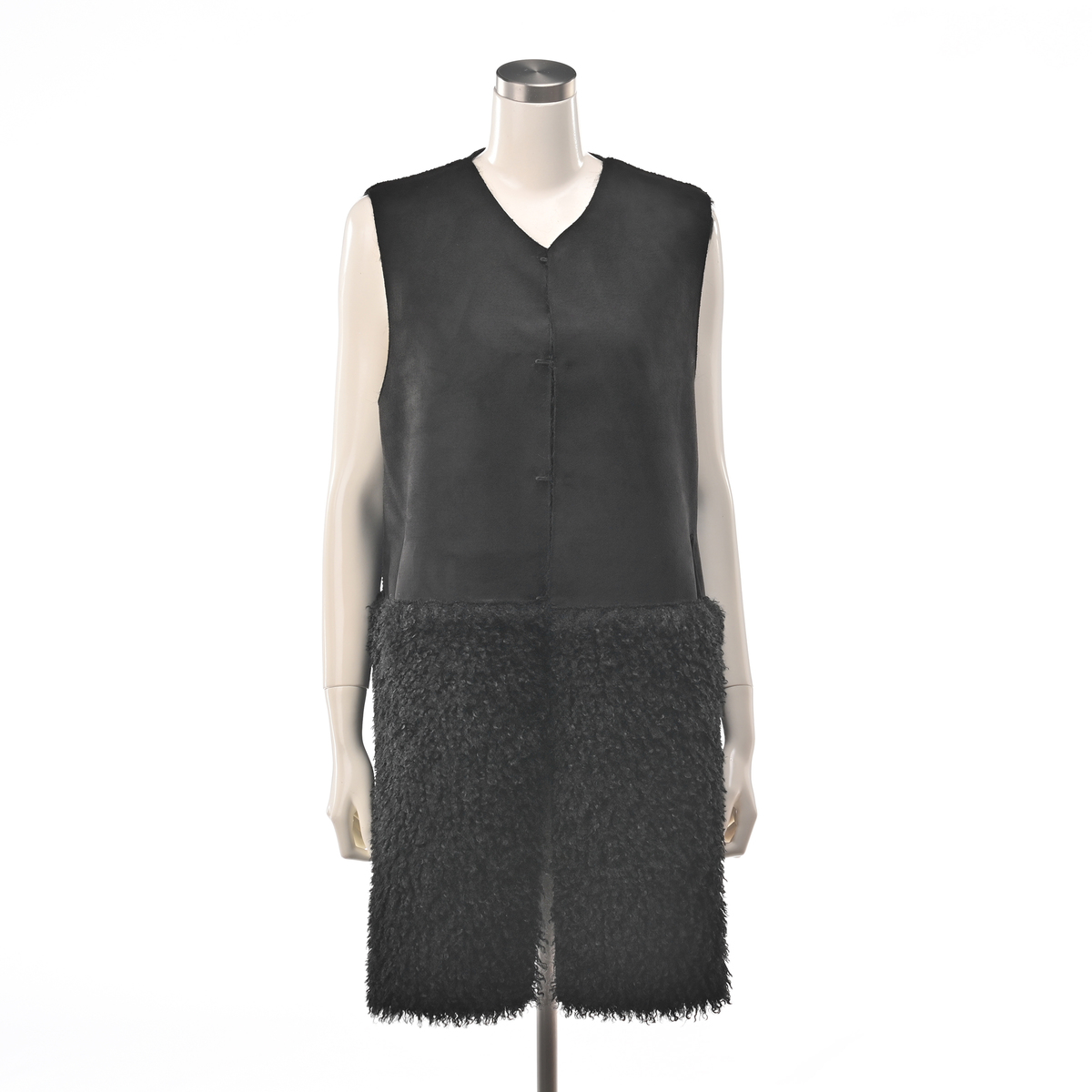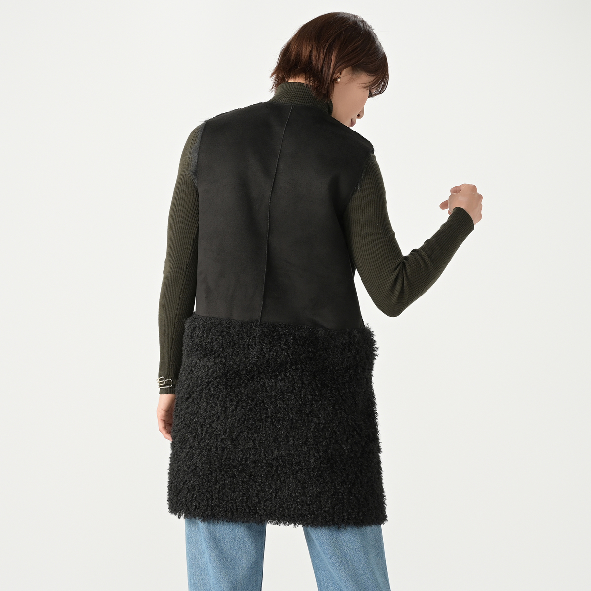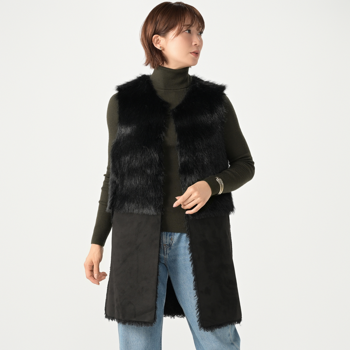 リアルファーのようなボリュームで、毛皮側とスエード側を切り替えたロングジレ。エコファーは主に化学繊維を原料として、動物の毛皮(リアルファー)に似せて生産・加工をした素材とされています