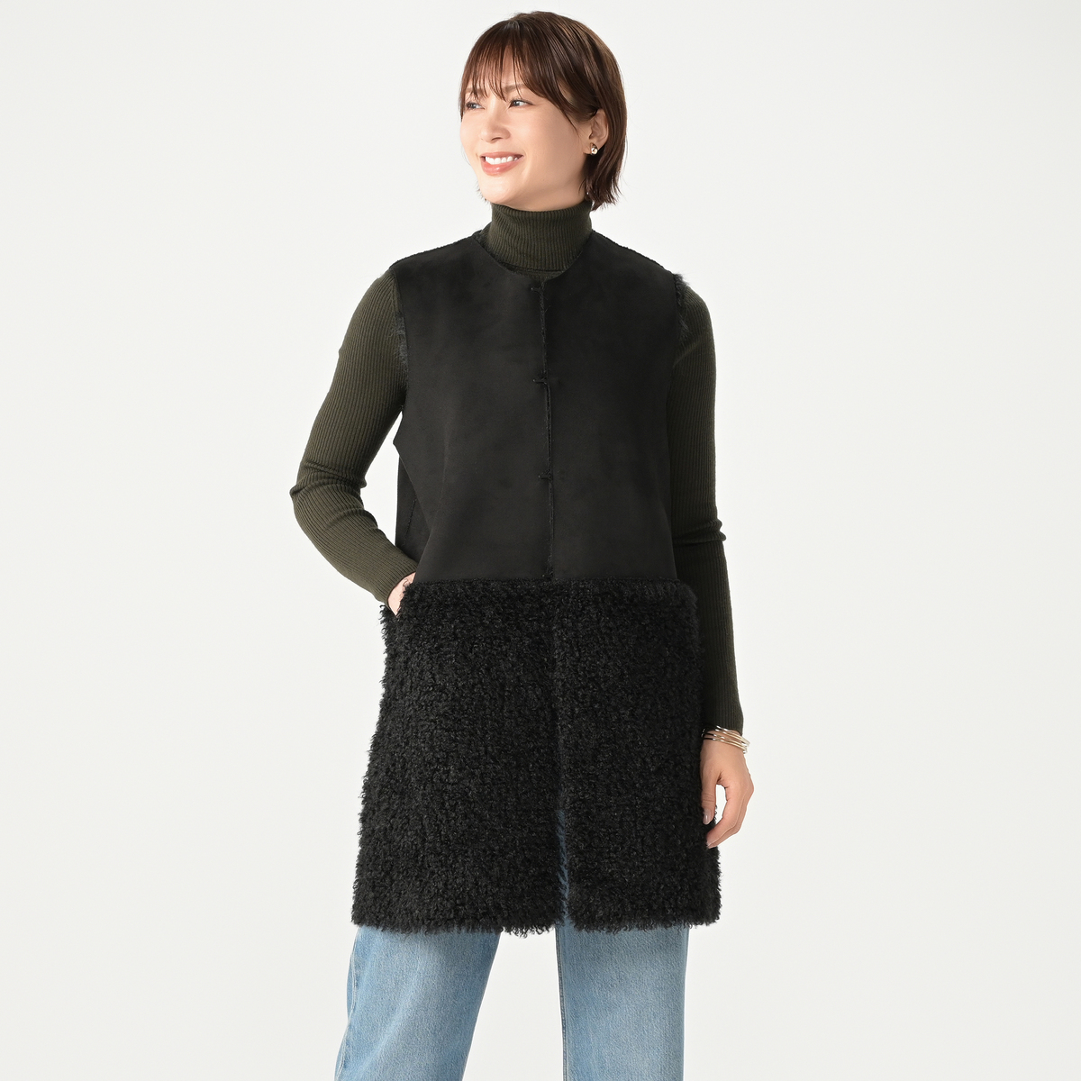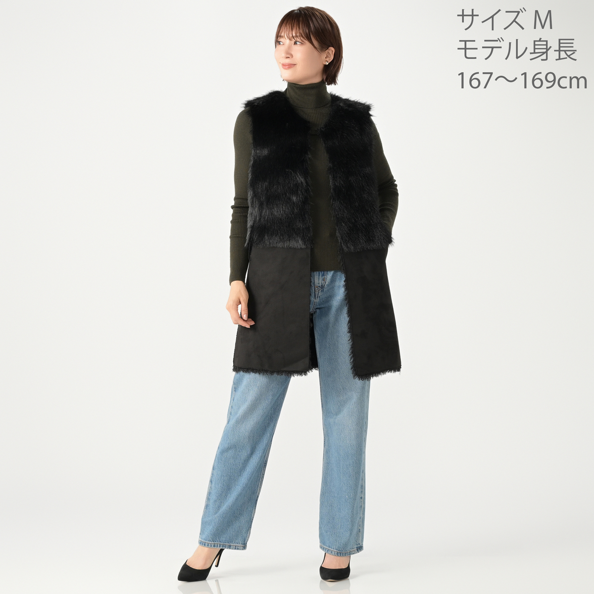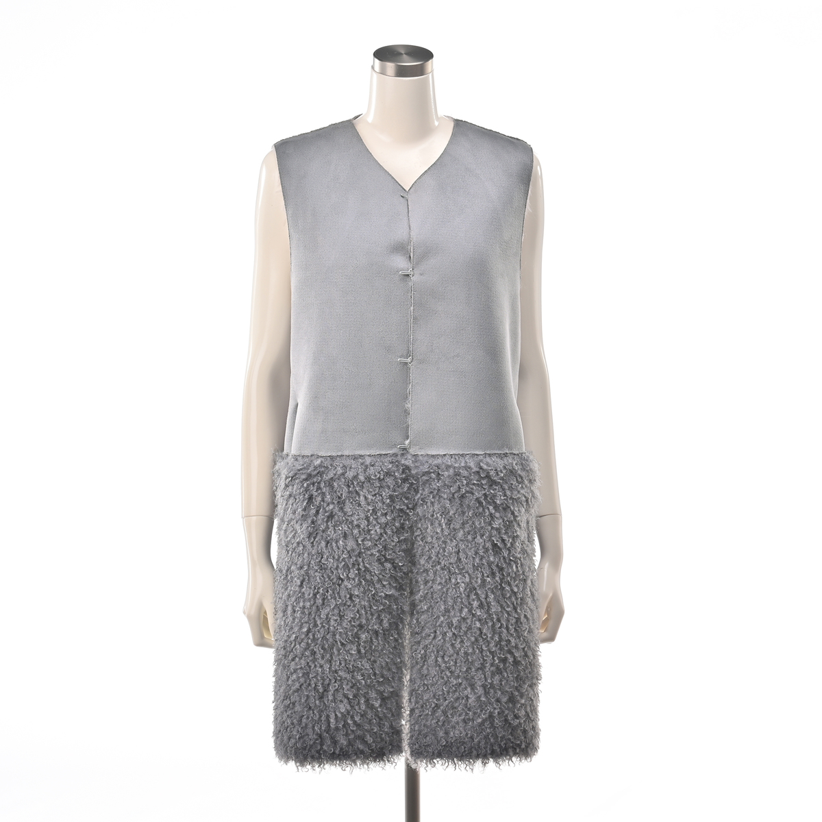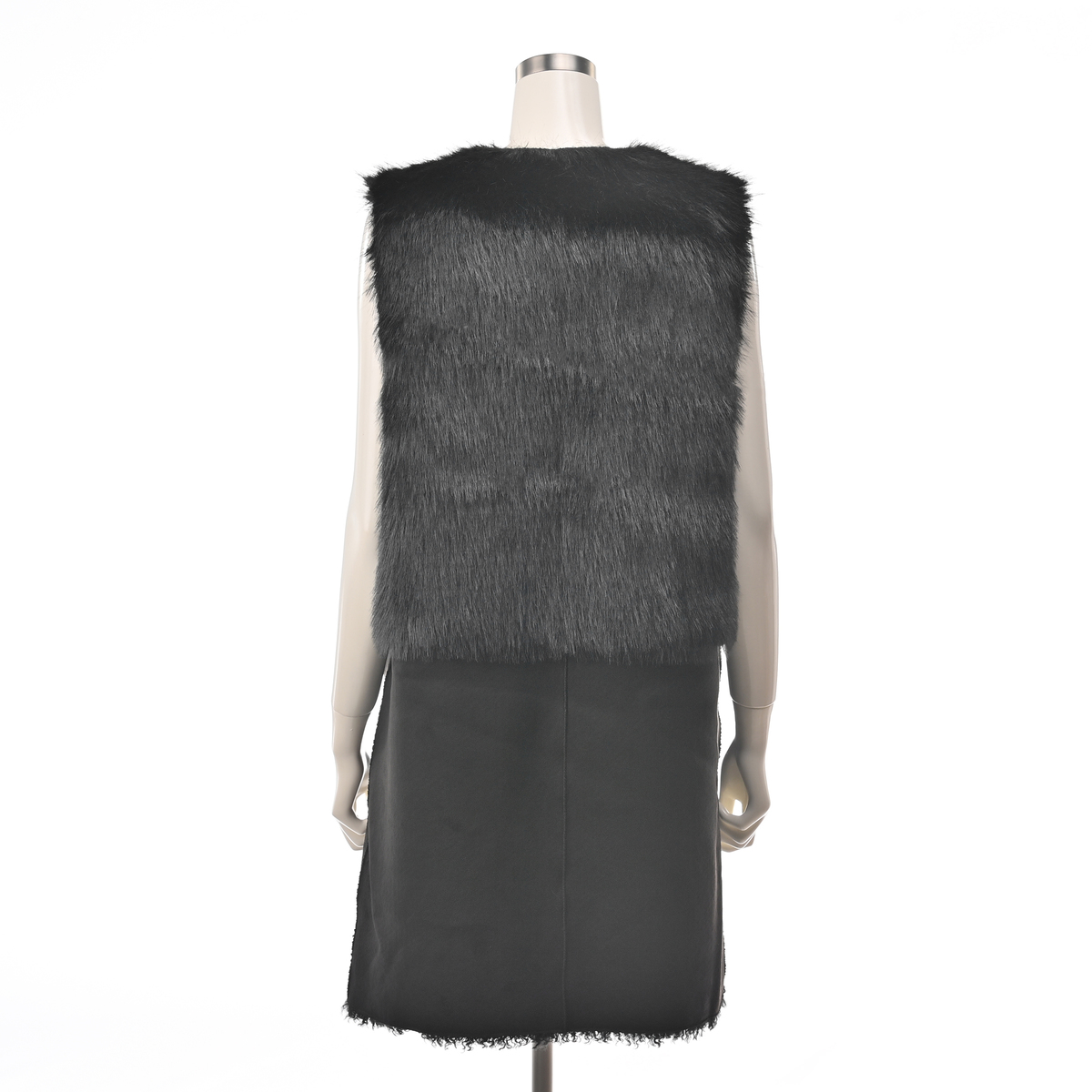 リアルファーのようなボリュームで、毛皮側とスエード側を切り替えたロングジレ。エコファーは主に化学繊維を原料として、動物の毛皮(リアルファー)に似せて生産・加工をした素材とされています