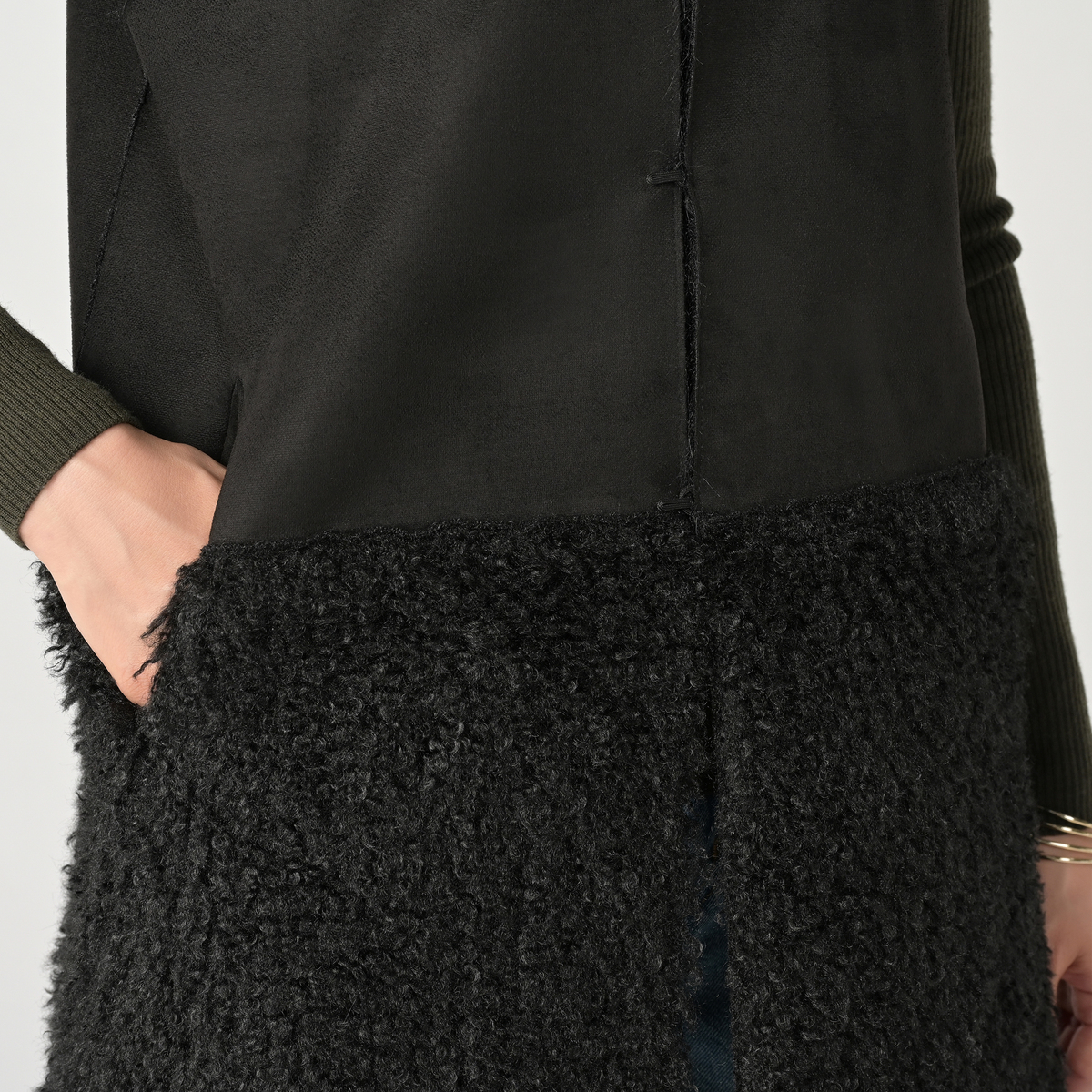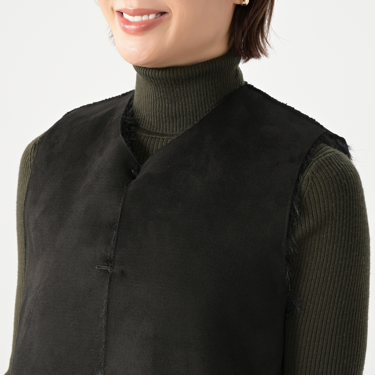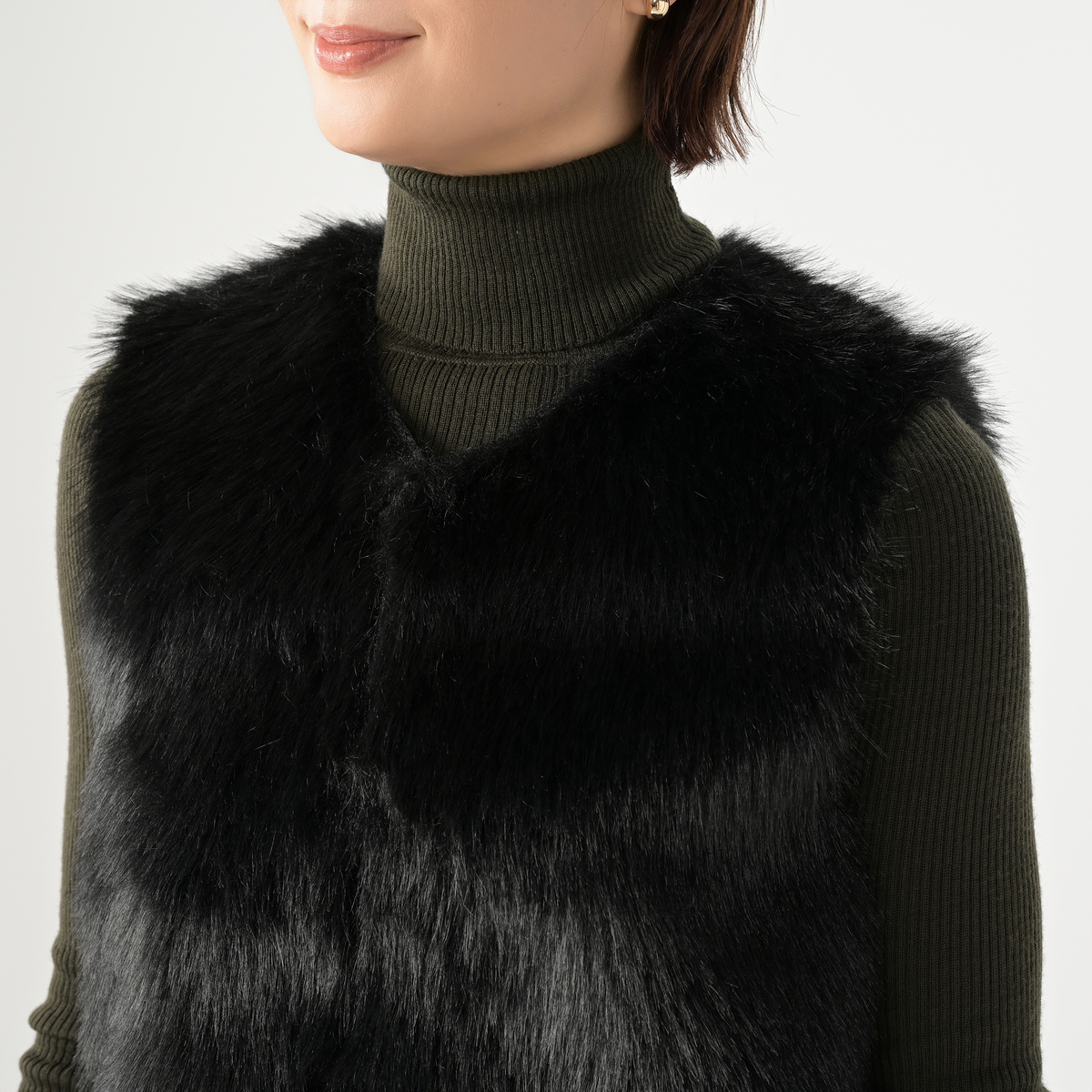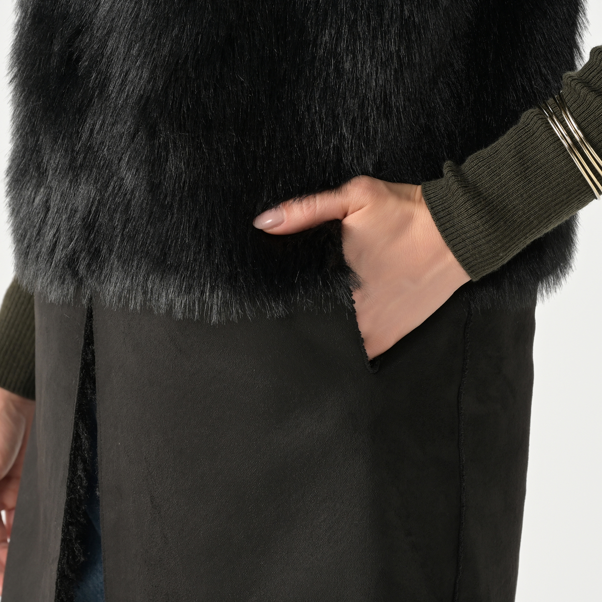 リアルファーのようなボリュームで、毛皮側とスエード側を切り替えたロングジレ。エコファーは主に化学繊維を原料として、動物の毛皮(リアルファー)に似せて生産・加工をした素材とされています