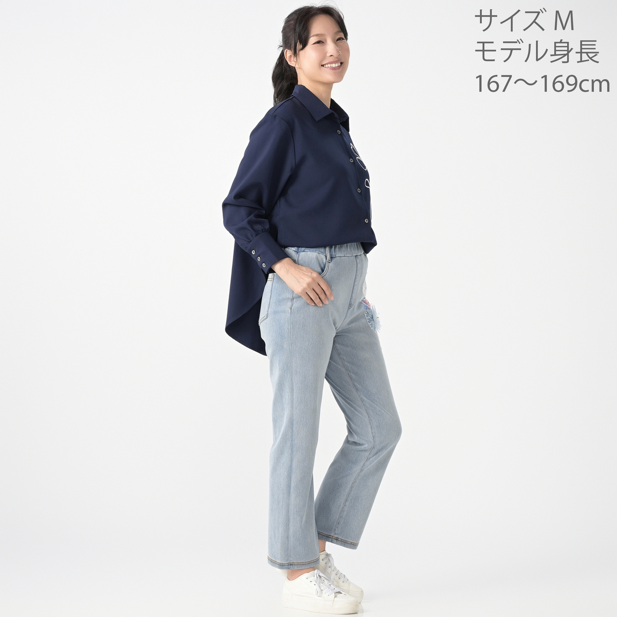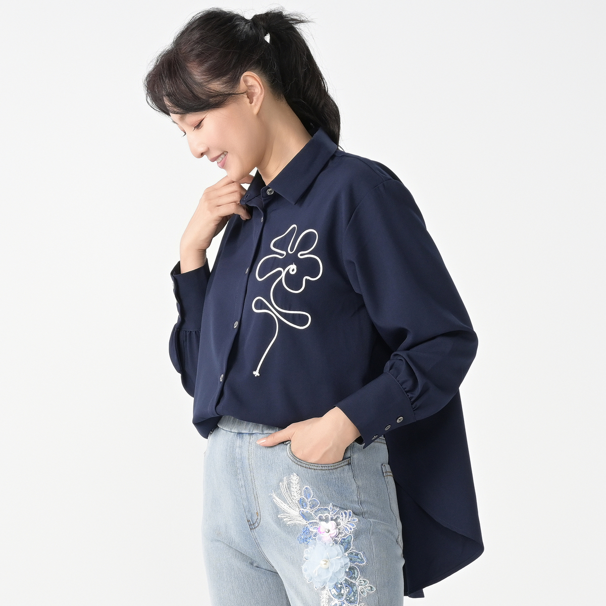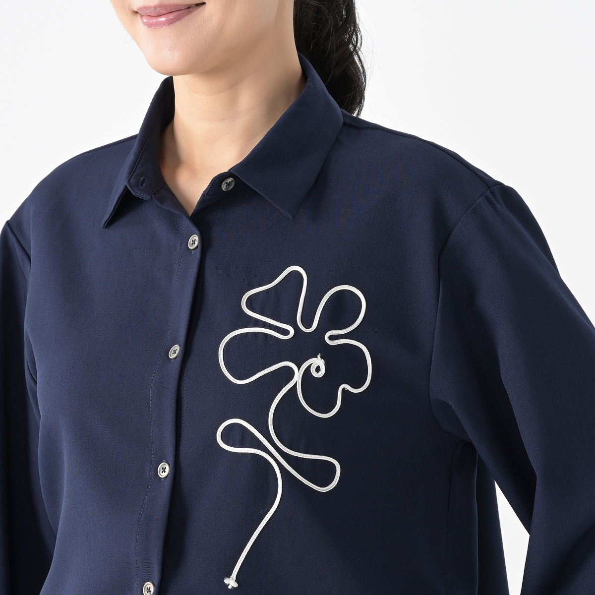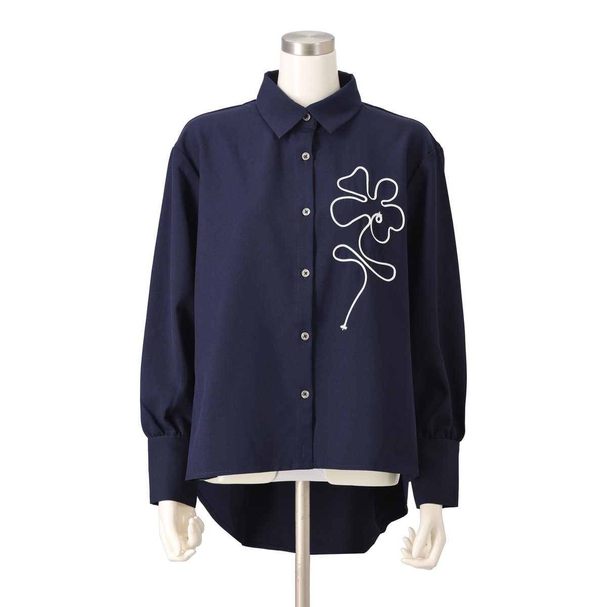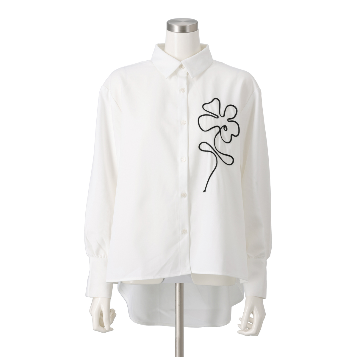 テープコード刺繍が印象的な2WAYシルエットシャツです。裾はボタンで形を変えられるので、気分やシーンに合わせてスタイリング。ニュアンスフラワーの刺繍模様が、抜け感をプラスします
