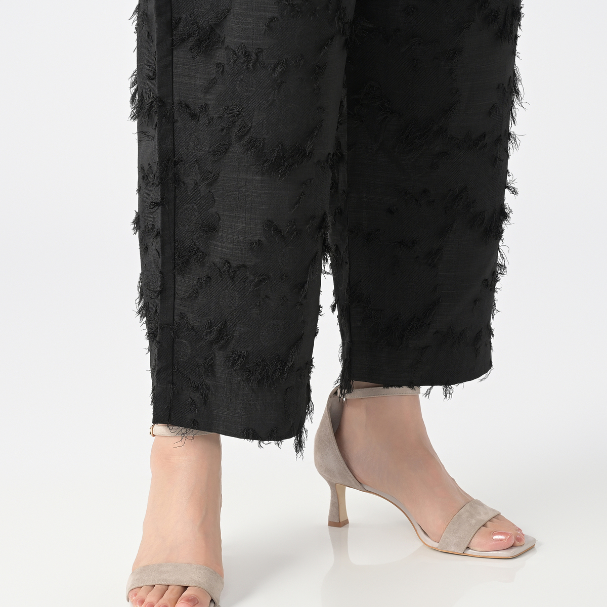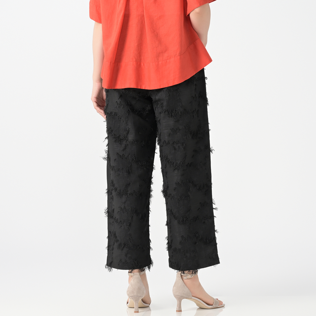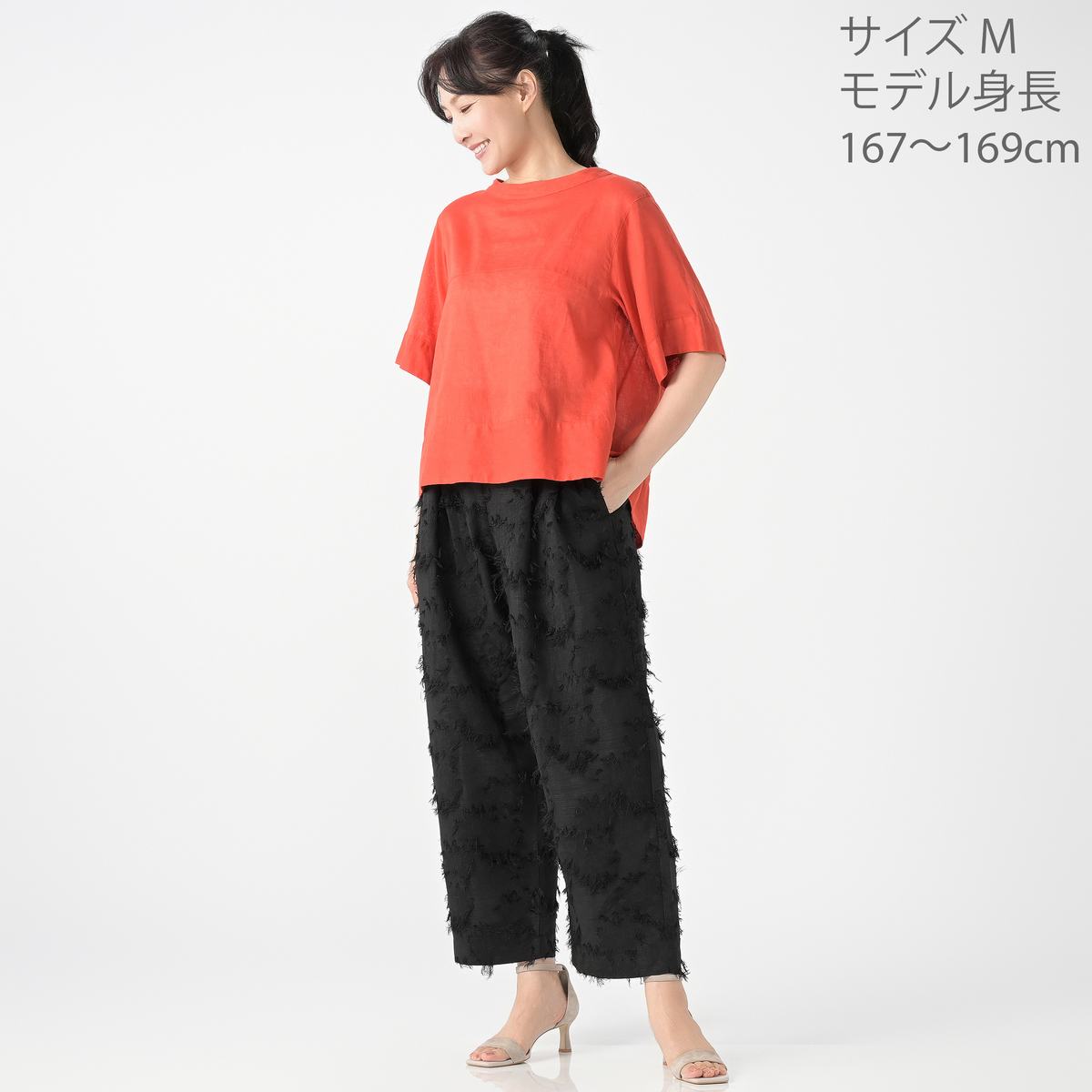 カットジャガード生地で立体感溢れる花柄が存在感を放つ、ゆったりとしたストレートパンツです。楽な穿き心地のウエストは幅広ゴムでナチュラルにウエストマーク。タック入りで動きやすさもプラスし、お腹まわりをカバーします