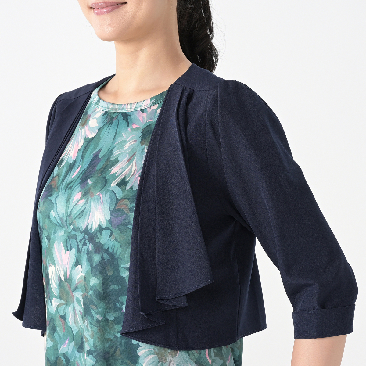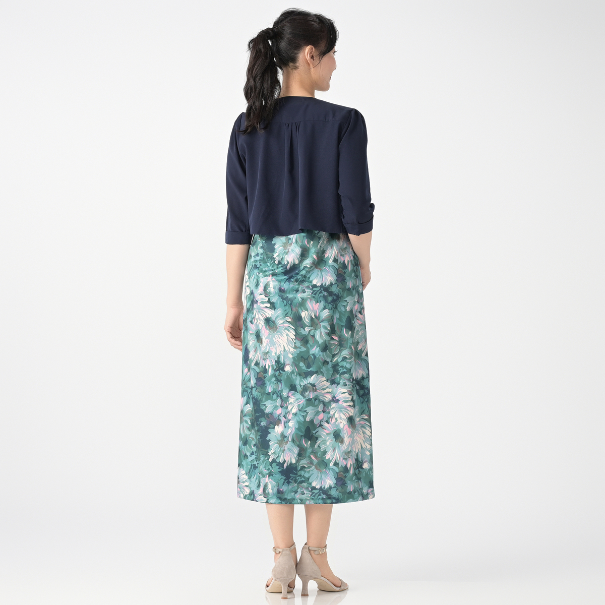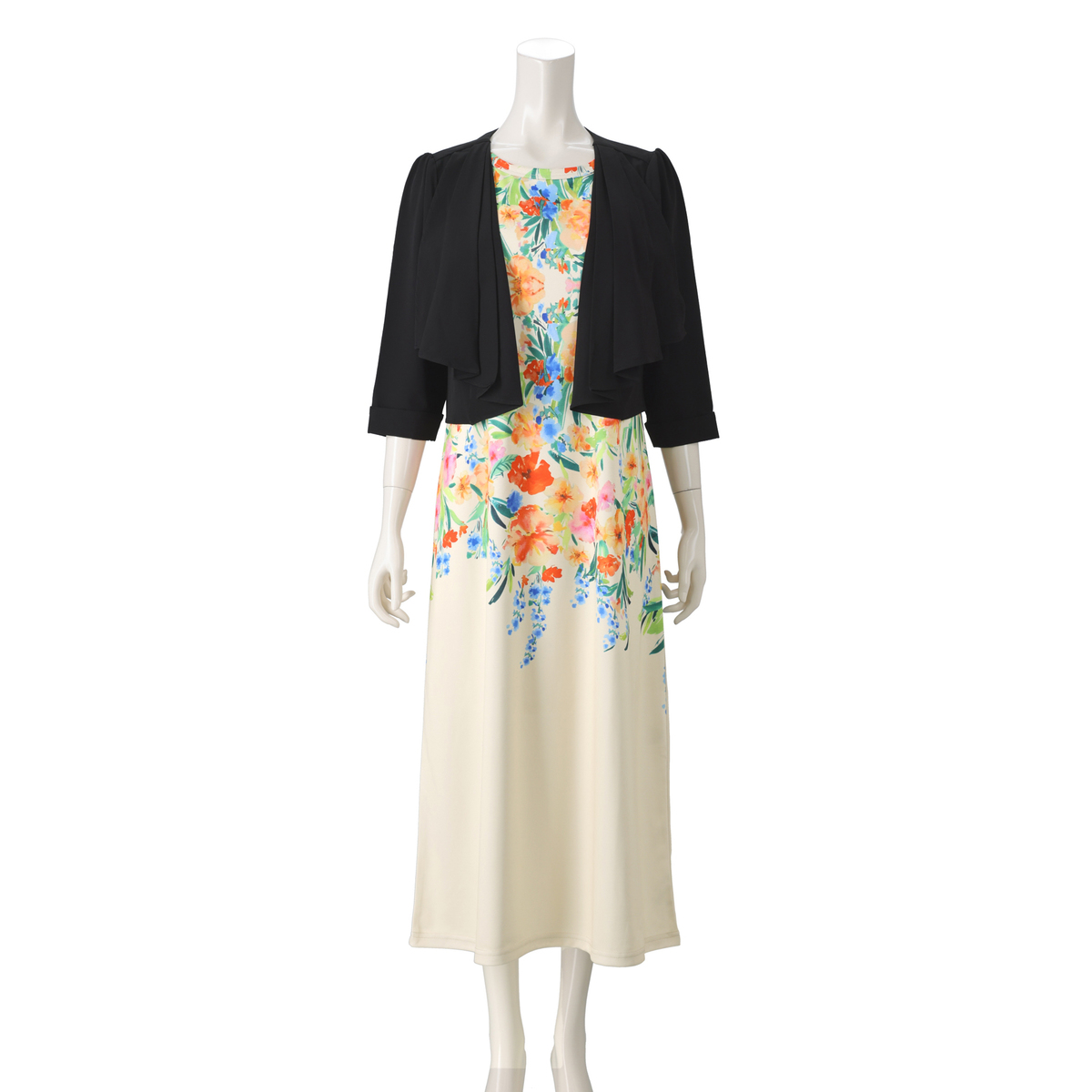 ボレロ付きの華やかなフローラルワンピースです。シンプルできれいなストレートラインに、鮮やかなプリントが目を引きます。単品でもセットでも着まわせるので、シーンに合わせてコーディネートをお楽しみいただけます