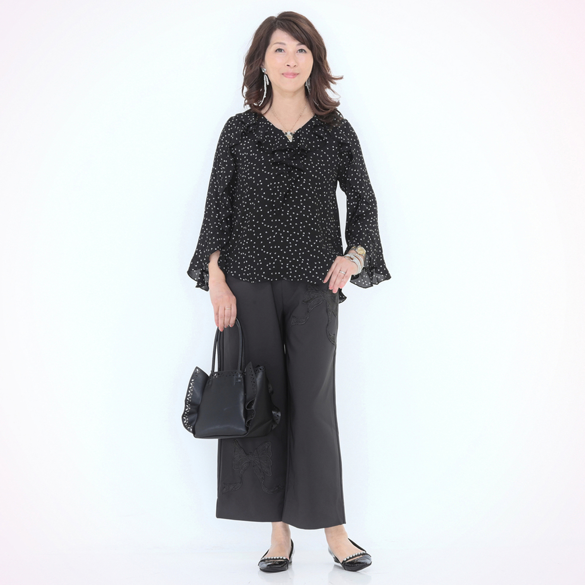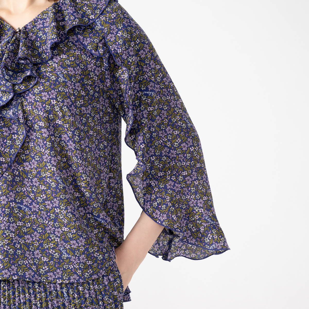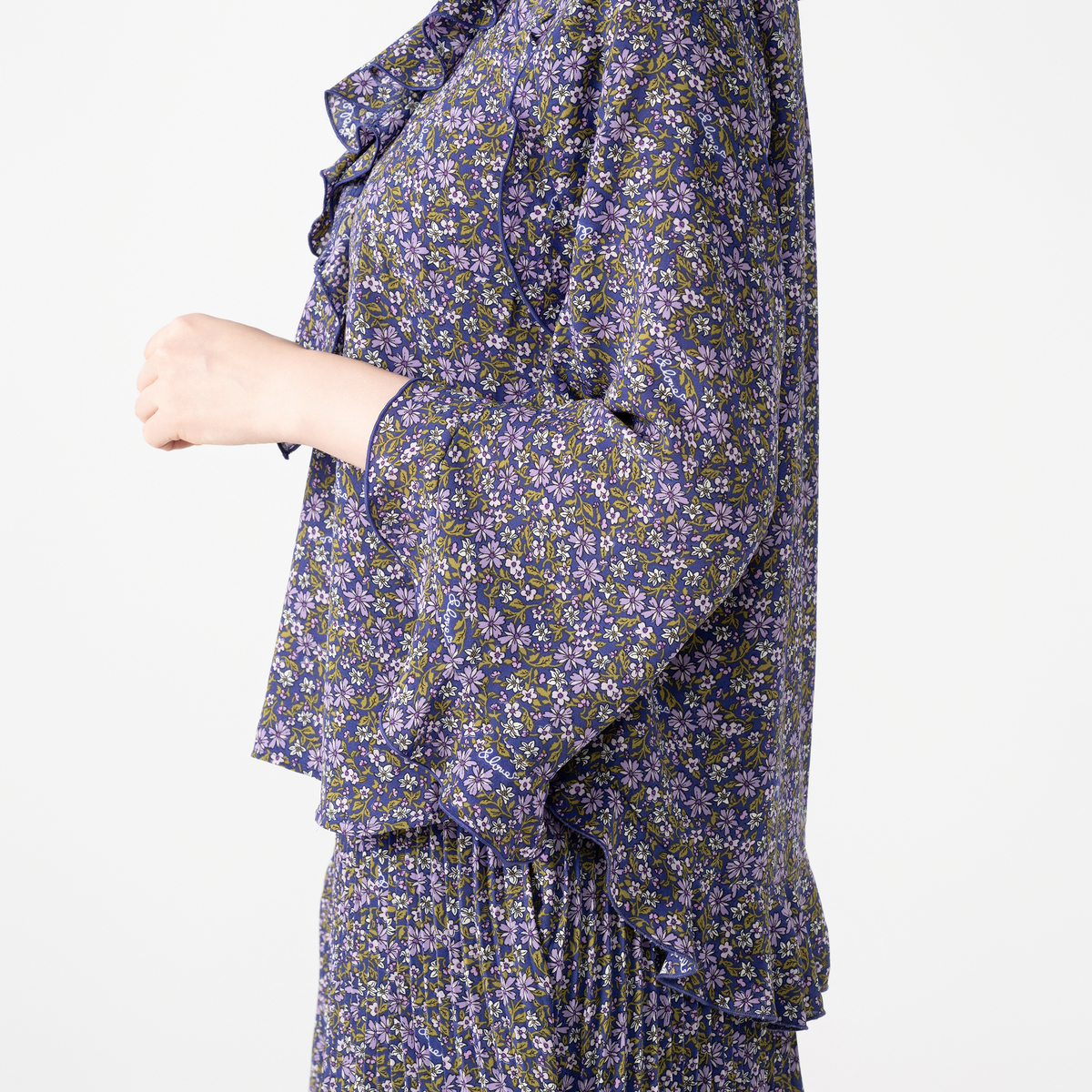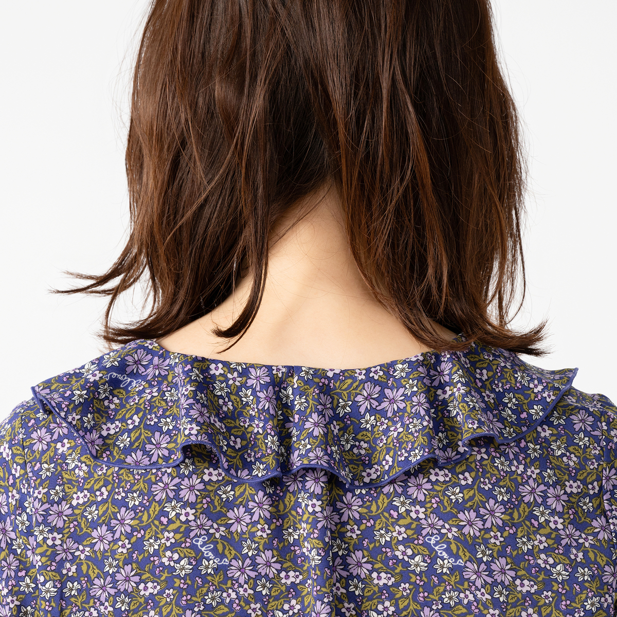 流れるようなフリルが印象的なブラウス。胸元と肩から袖先に流れるラッフルフリルが、動くたびに表情を変えてエレガントな印象に。後ろ身頃には裾のラウンドカーブに添ってポイントタックの入ったラッフルフリルをあしらい、後ろ姿にもこだわりました