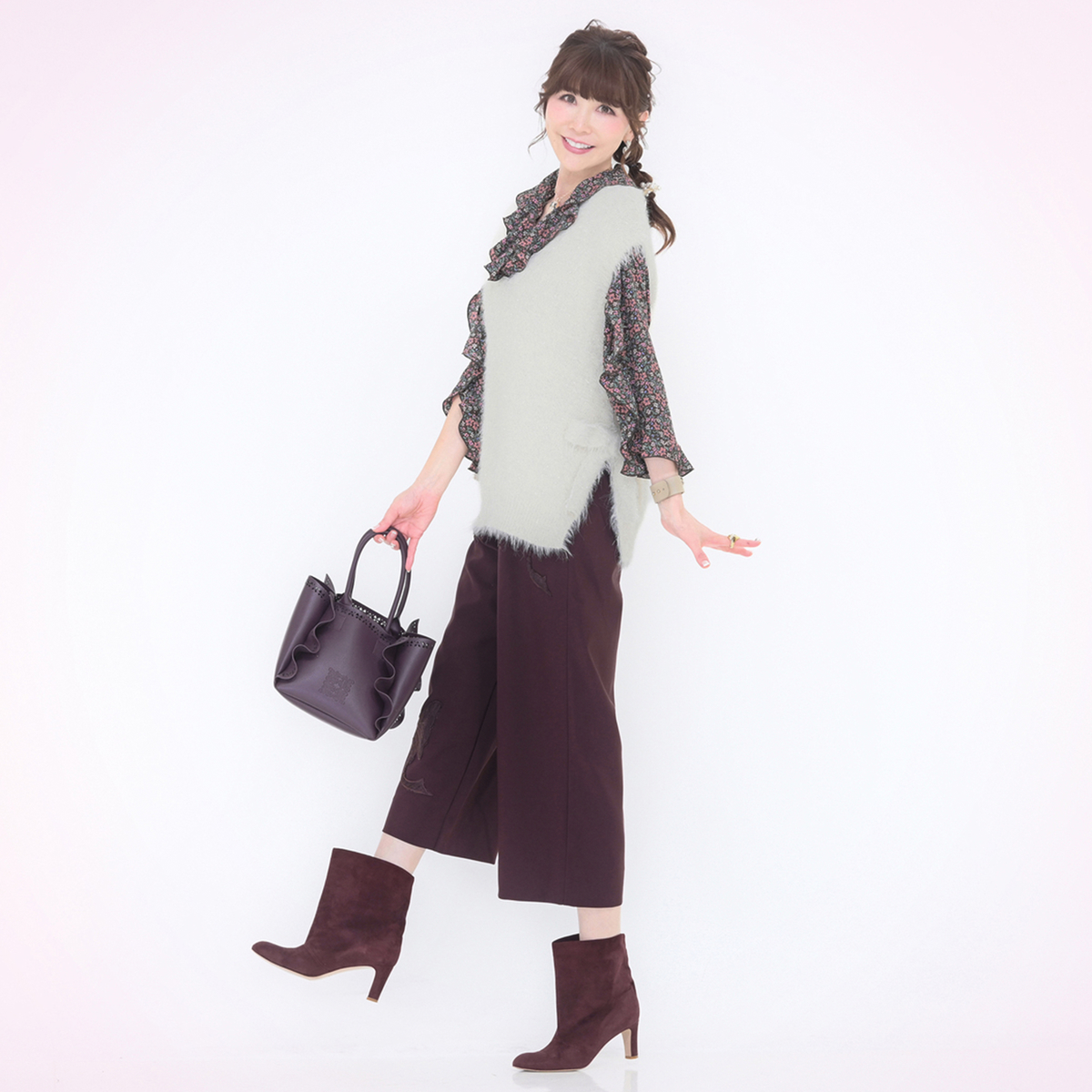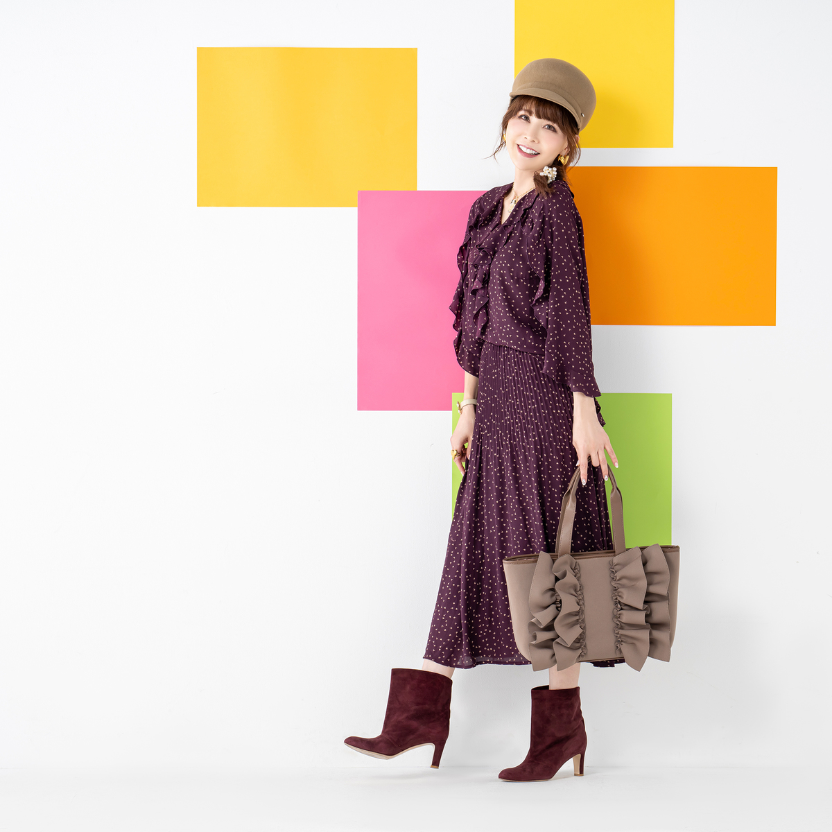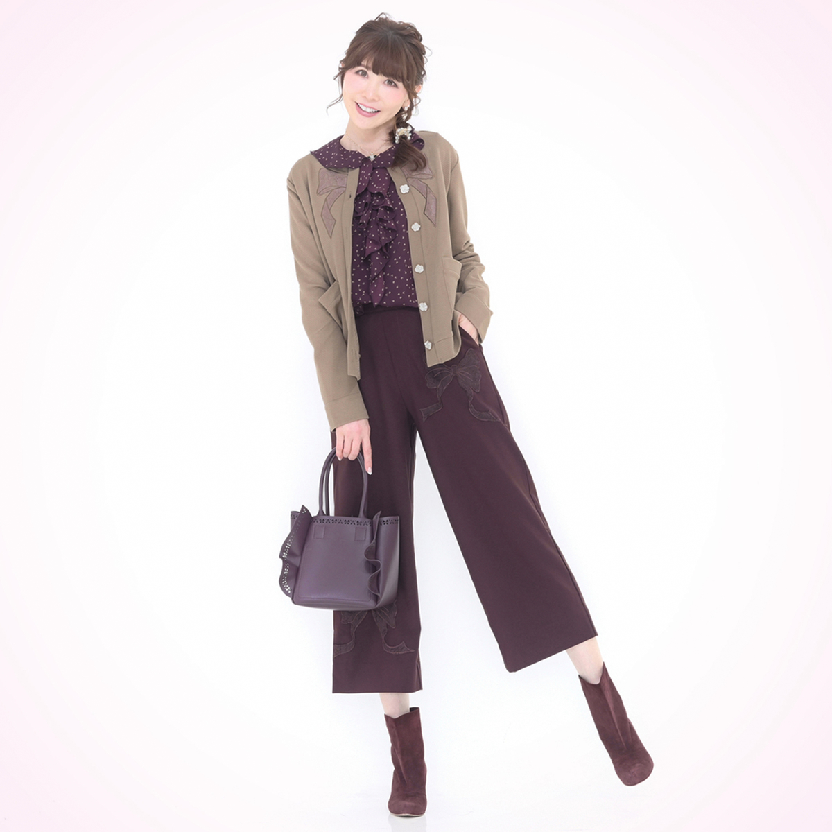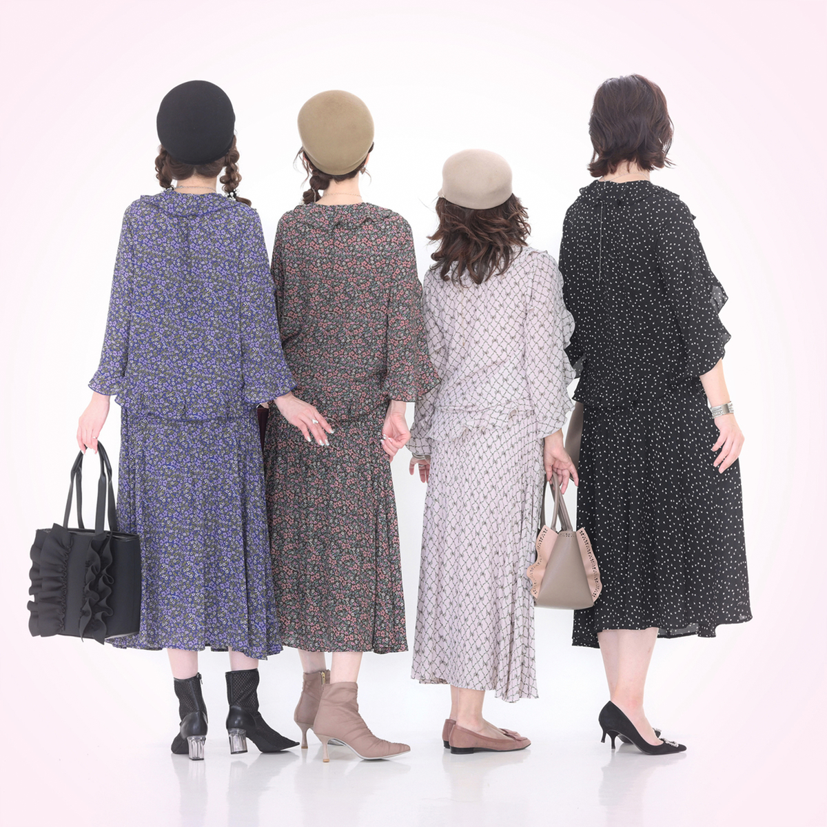 流れるようなフリルが印象的なブラウス。胸元と肩から袖先に流れるラッフルフリルが、動くたびに表情を変えてエレガントな印象に。後ろ身頃には裾のラウンドカーブに添ってポイントタックの入ったラッフルフリルをあしらい、後ろ姿にもこだわりました