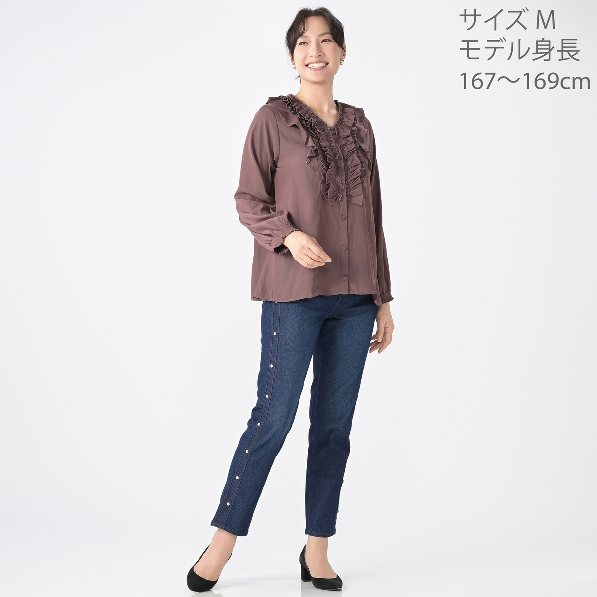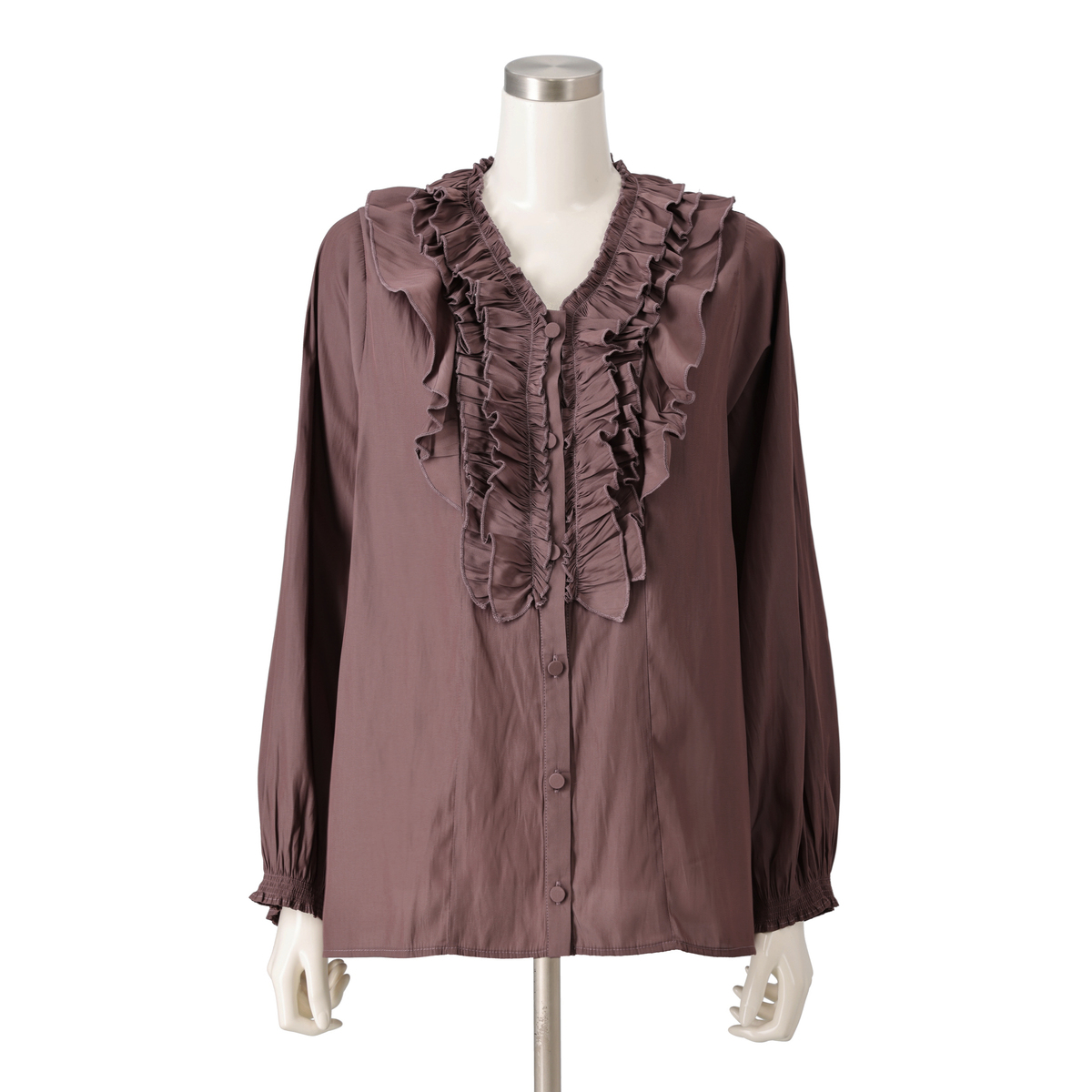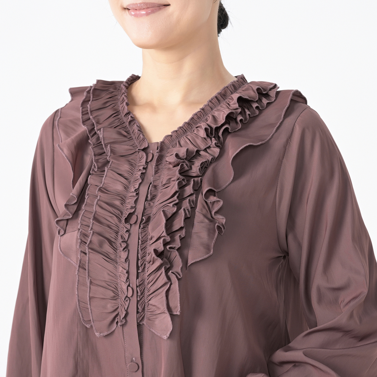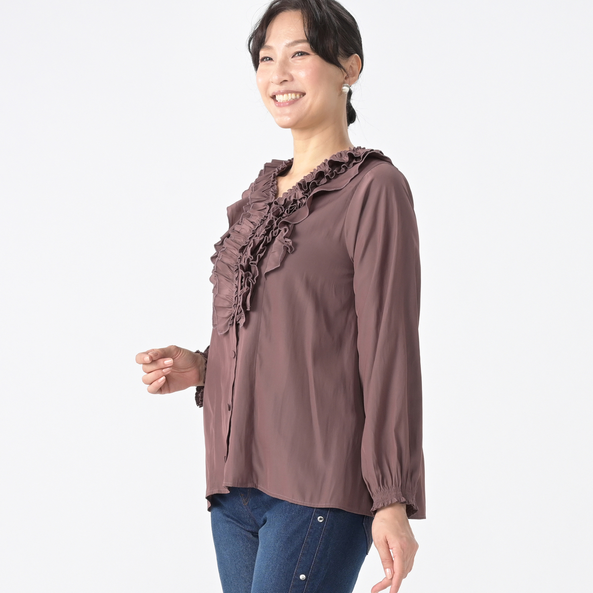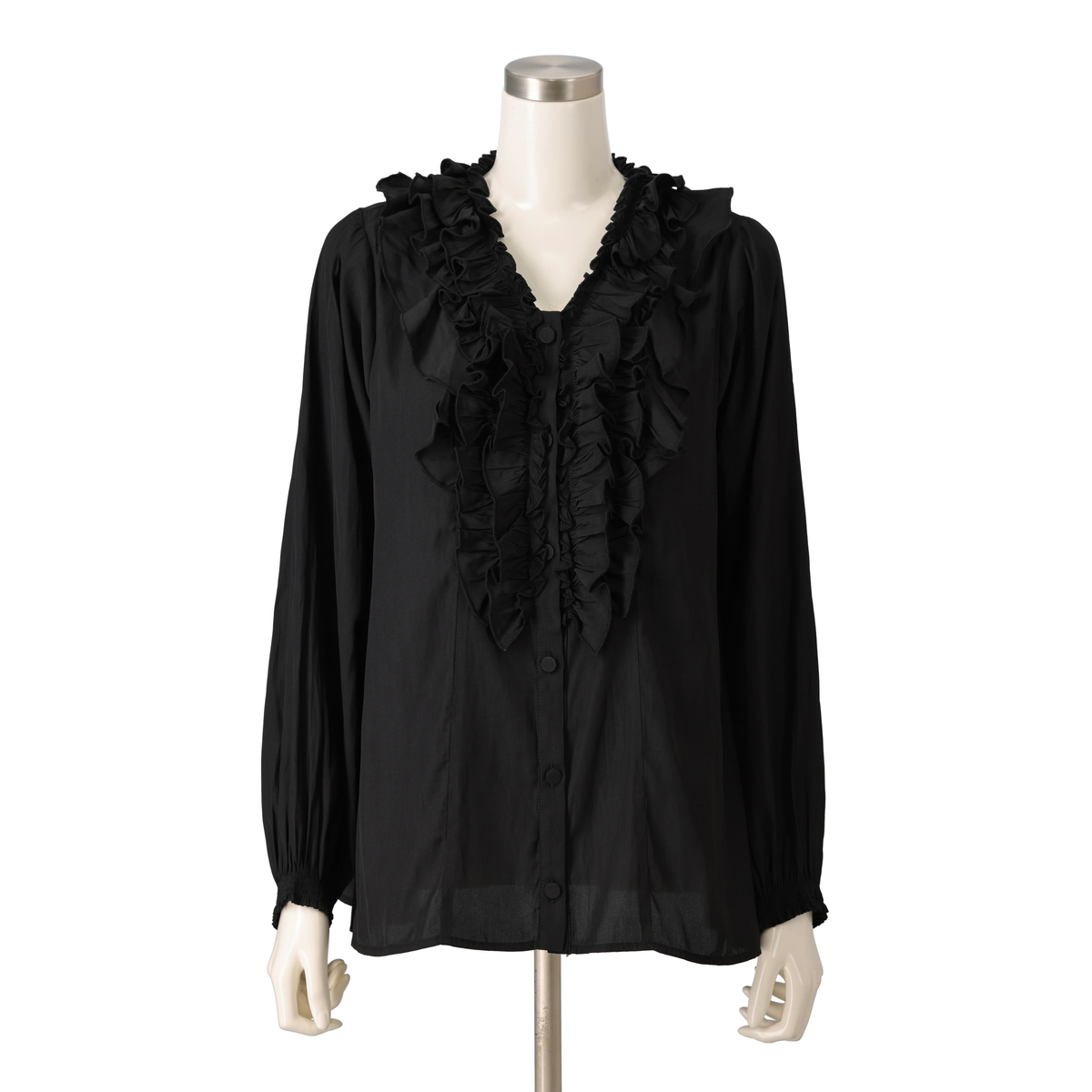 3段のラッフルフリルをフロントにあしらったブラウス。コーディネートの主役になってくれる華やかなデザインです