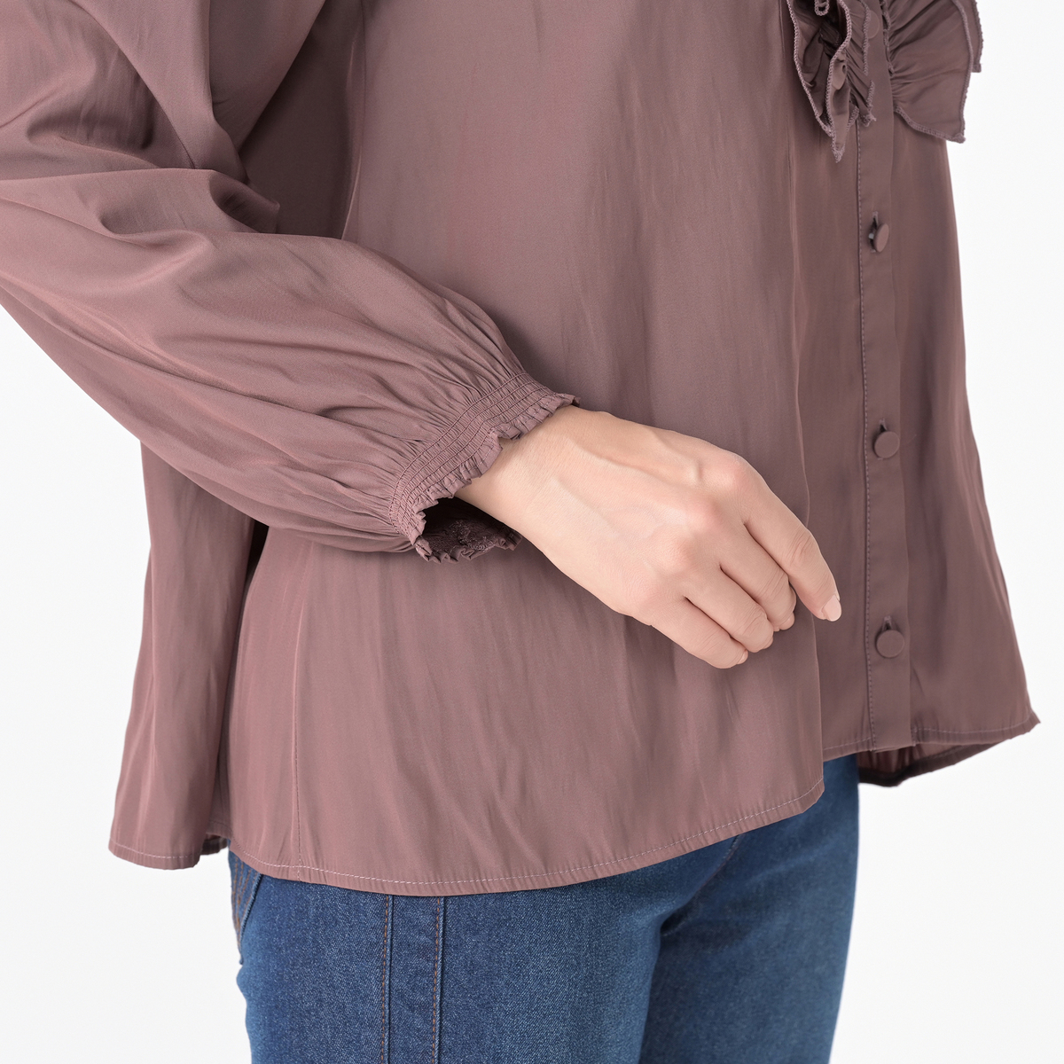 微光沢が上品な布帛素材を使用。軽やかさと華やかさを兼ね備えた素材感です