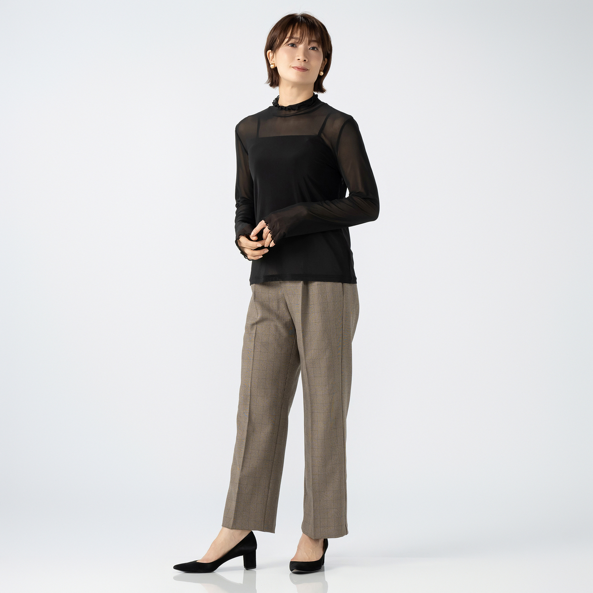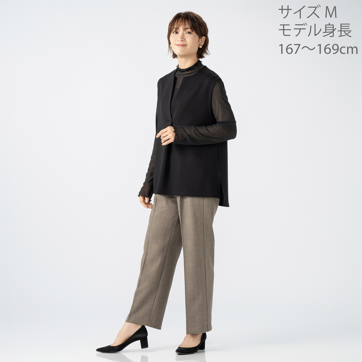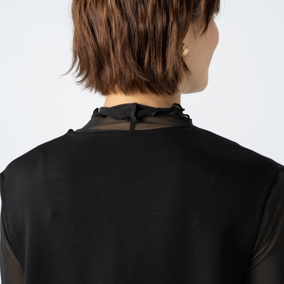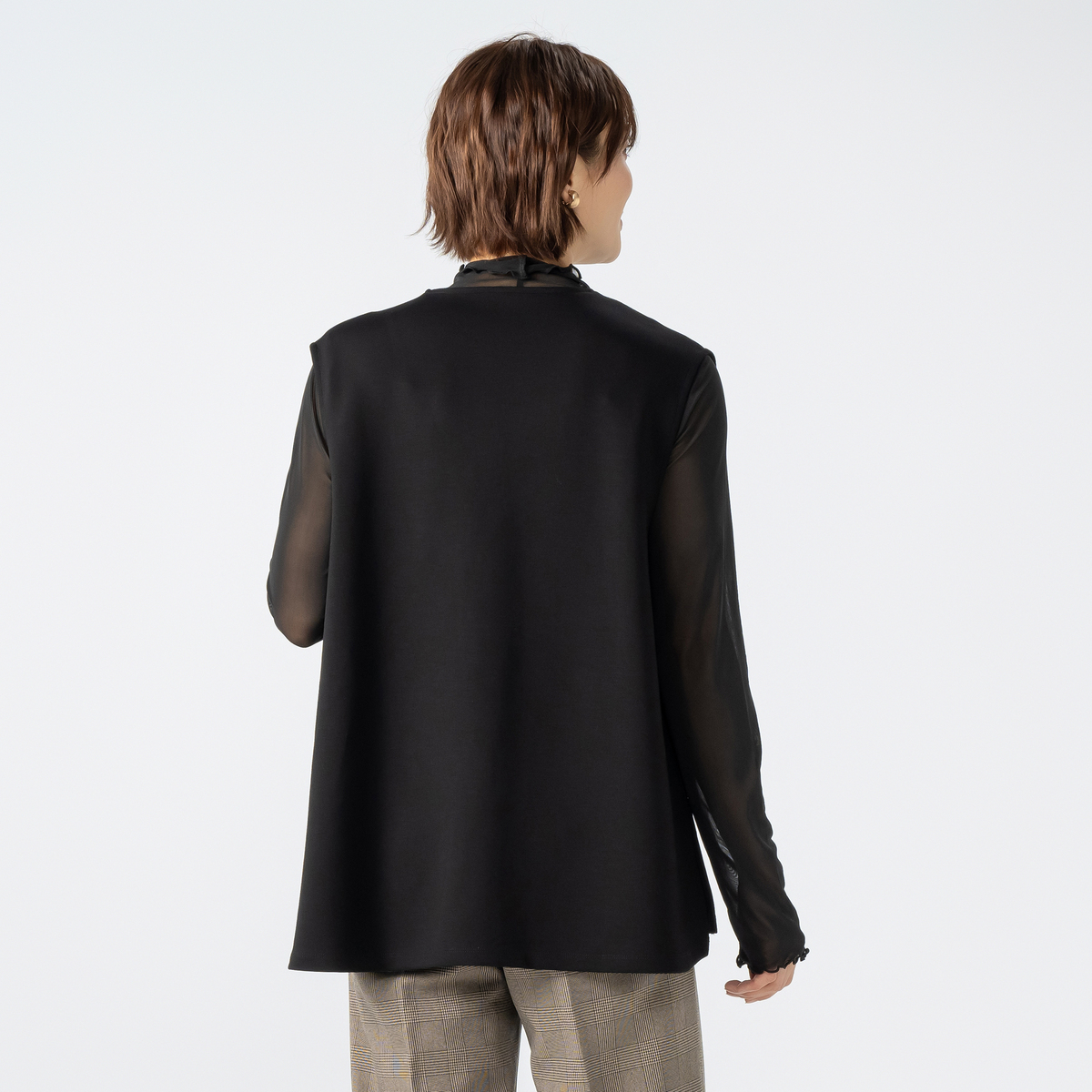 ジレはドレープ感のある艶やかな表面感の素材を使用。着用時しわになりにくいのもポイントです。プルオーバーはトレンドのシアーメッシュ素材を使用しています