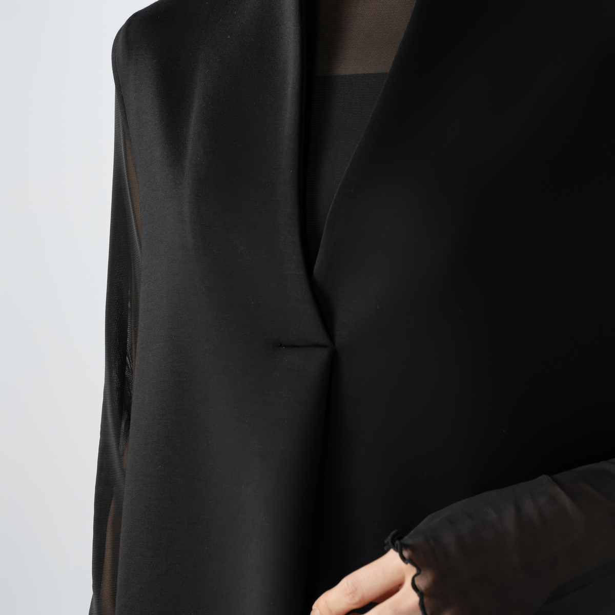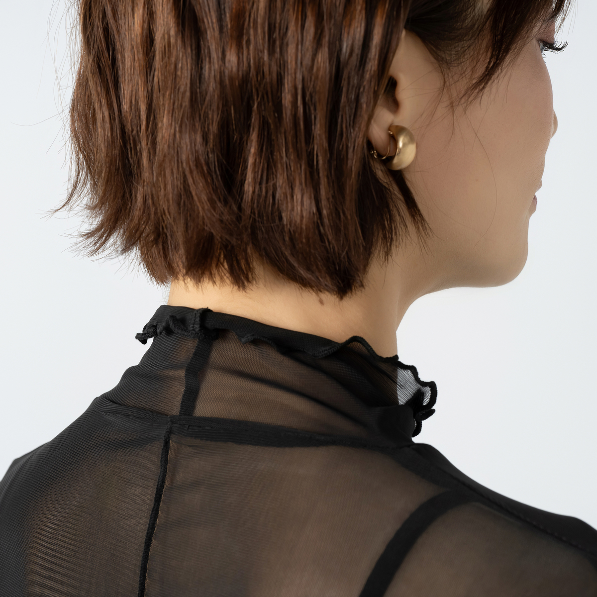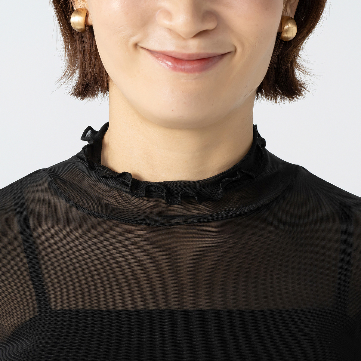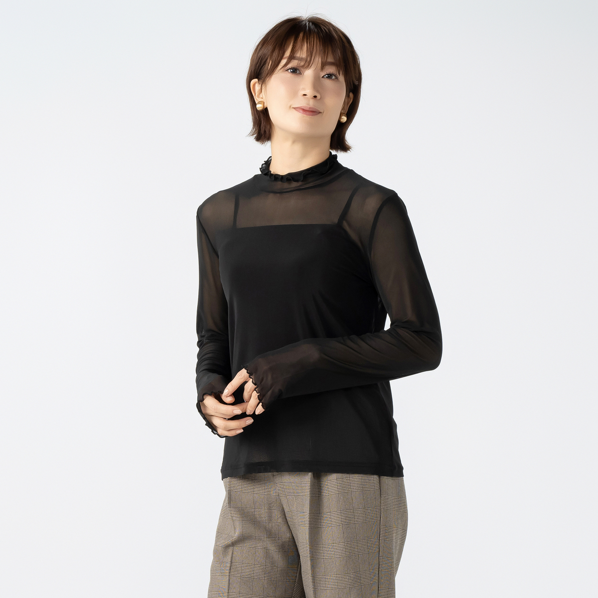 ジレはドレープ感のある艶やかな表面感の素材を使用。着用時しわになりにくいのもポイントです。プルオーバーはトレンドのシアーメッシュ素材を使用しています