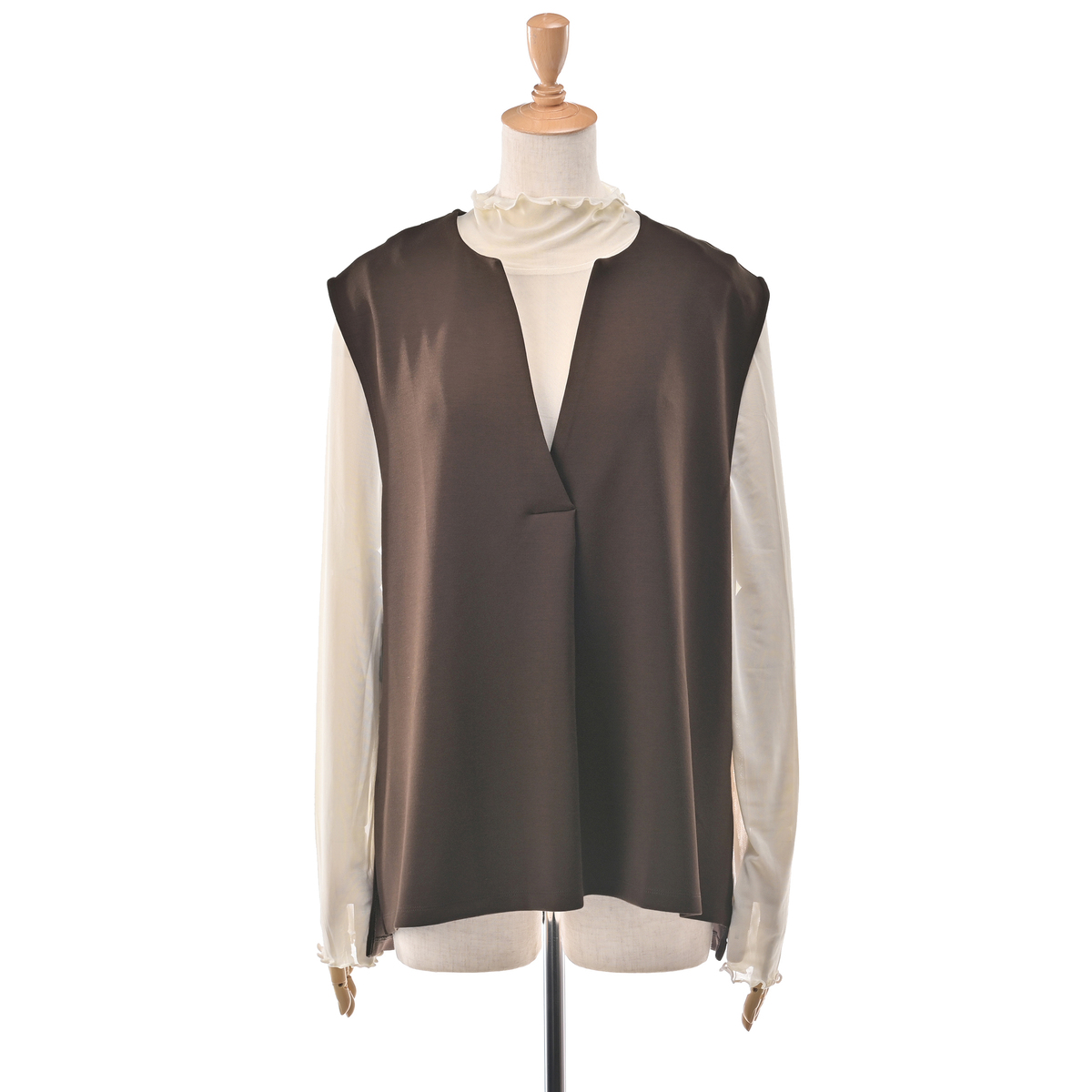 働く女性を応援するブランド「Beauty Fit」のアンサンブル。深めのV字スリットネックが特徴のジレと、メロー始末のフリル衿がポイントのインナープルオーバーを組合せました。セット使いはもちろん、それぞれ単体でも着回しに活躍してくれます