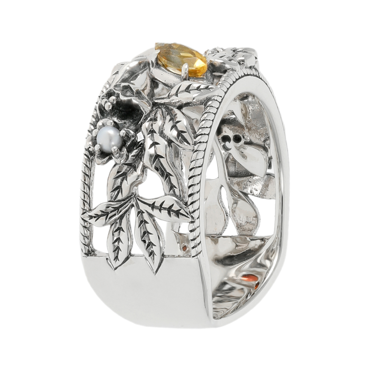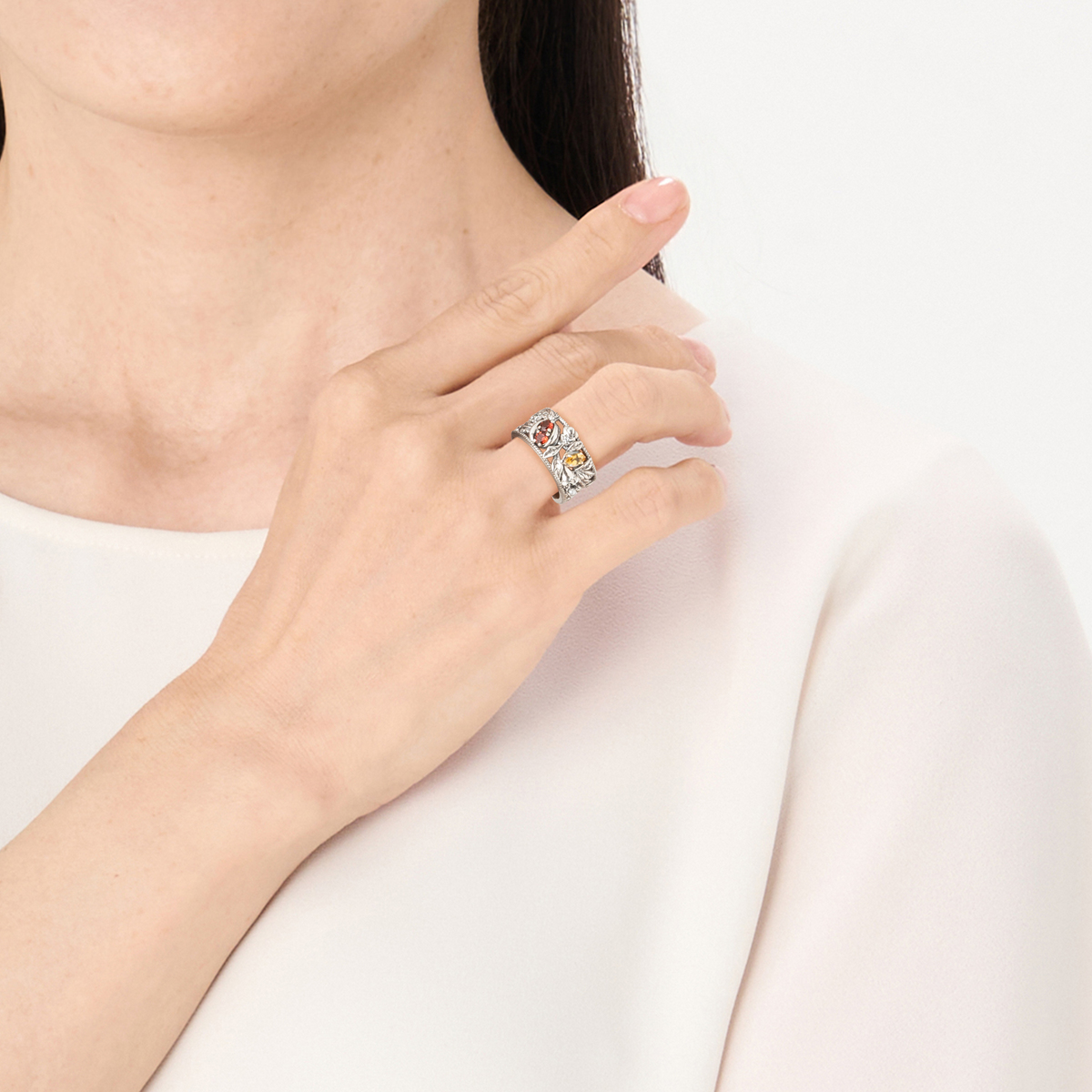 腕の部分に植物模様の繊細なオープンワークを施したデザイン。生き生きと生い茂る草花の中にガーネットとシトリンを留めて、バランスのよい透かし細工の仕上がりに。軽やかで着けやすく、気軽にデイリー使いしていただけます