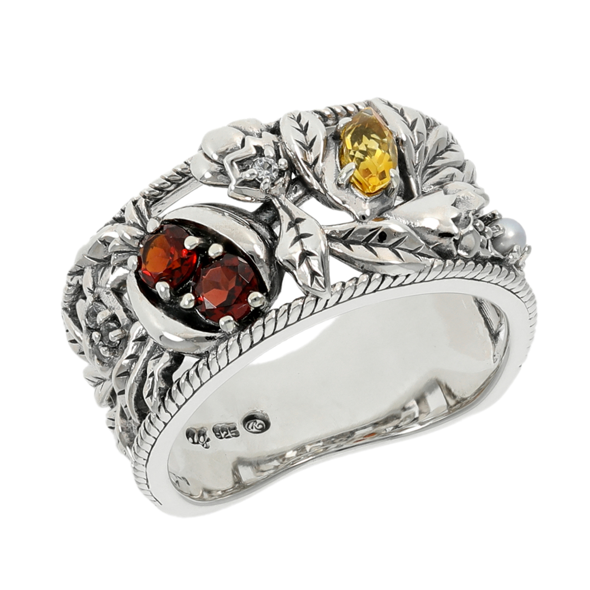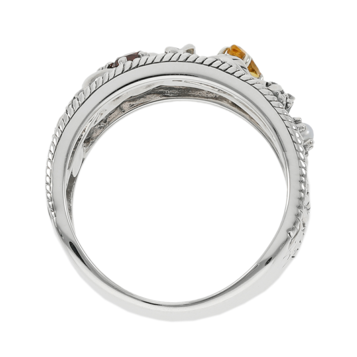 素材:[シトリン] マーキスカット 爪留め/接着 1石 [ガーネット] ラウンドカット 爪留め/接着 2石 [淡水パール(シードパール)] 不定形 爪留め/芯立て/接着 [ホワイトトパーズ] ラウンドカット 爪留め/接着 4石 最大幅(約) 9.5mm 最小幅(約) 5.0mm 総重量(約) 4.7g [地金] シルバー925 [仕上げ] アンティーク仕上げ ■素材の大きさ・形・色合い、製品のサイズは1点1点多少異なります ■専用ケース付 【タイ製】