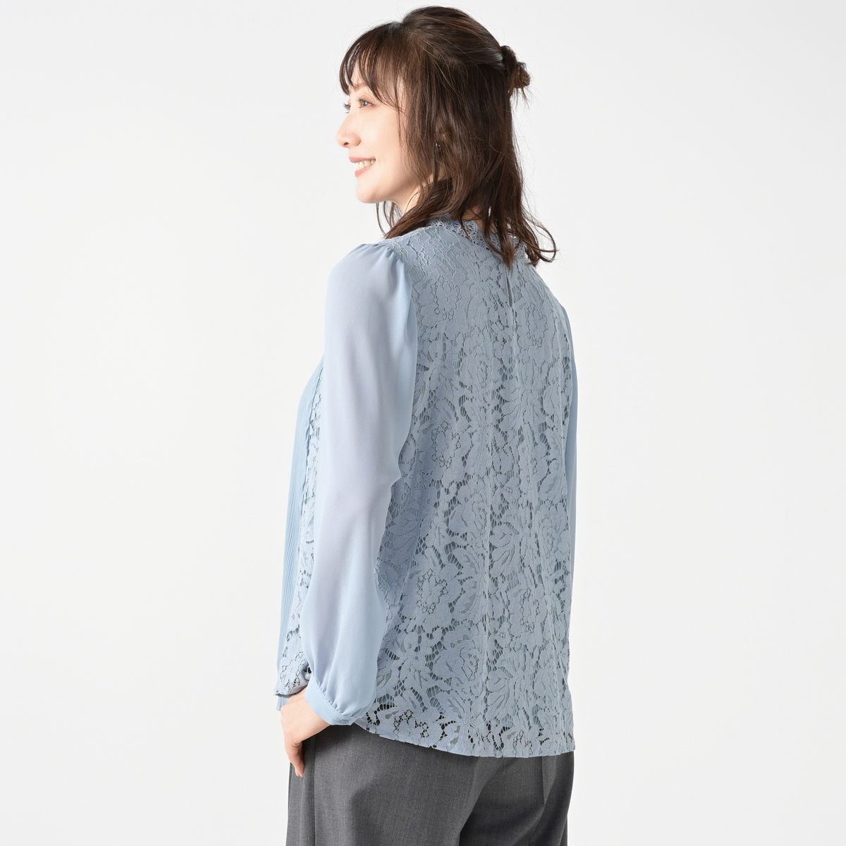 フラワーレースとプリーツを組合せた上品なプルオーバー。衿元のケミカルレースが顔周りを華やかに見せ、前身頃のプリーツが縦ラインを強調。切替部分とバックには大きめの花柄ラッセルレースを使い、大人っぽい印象に仕上げました
