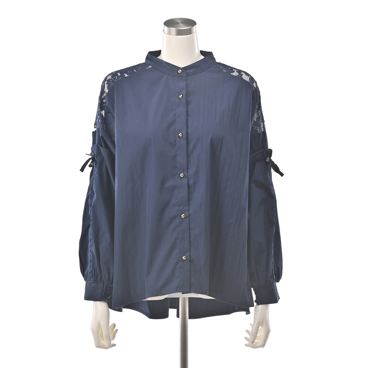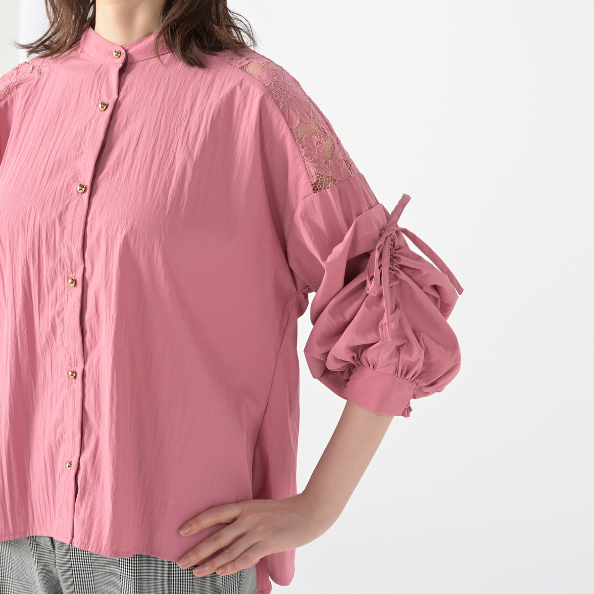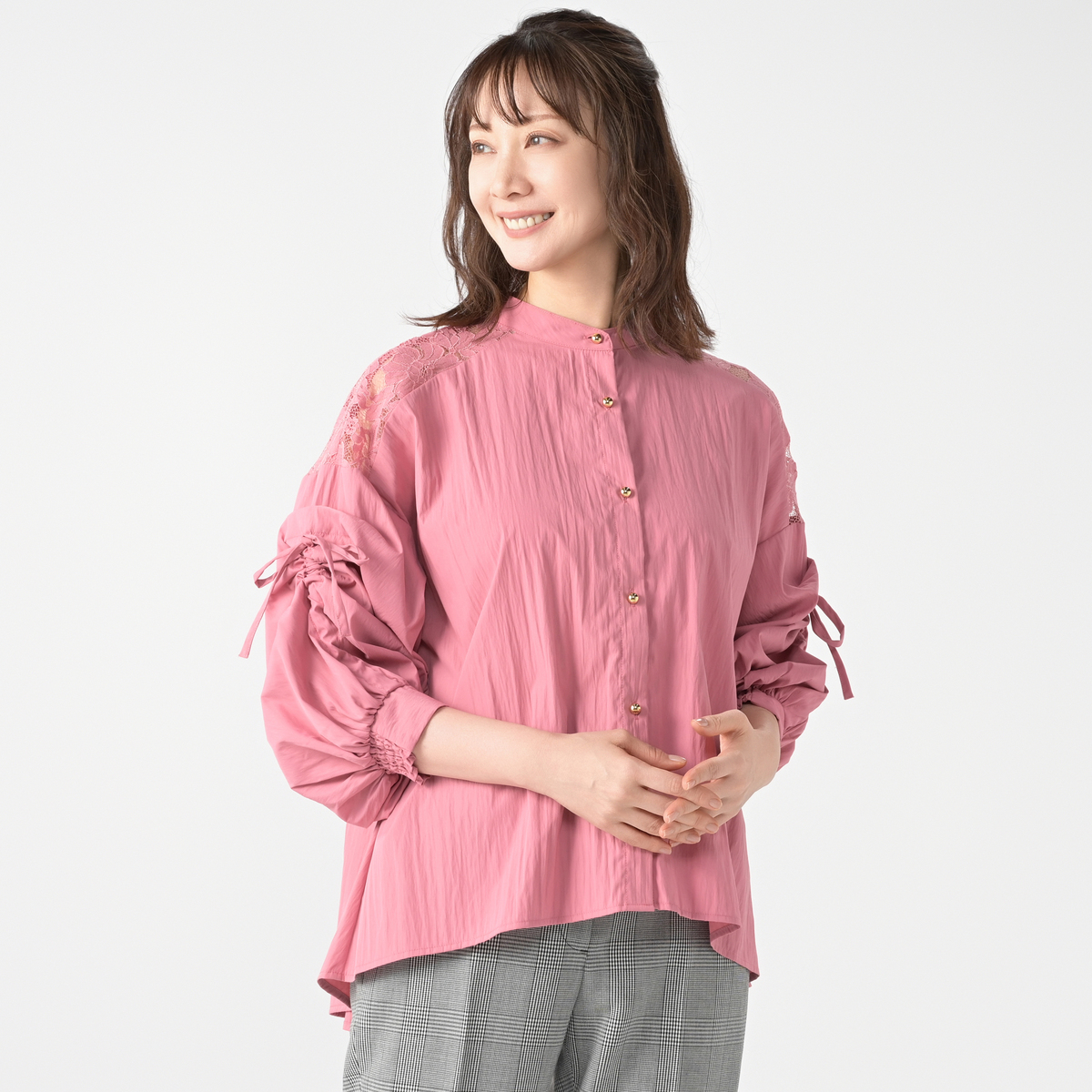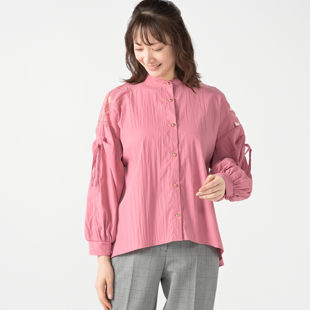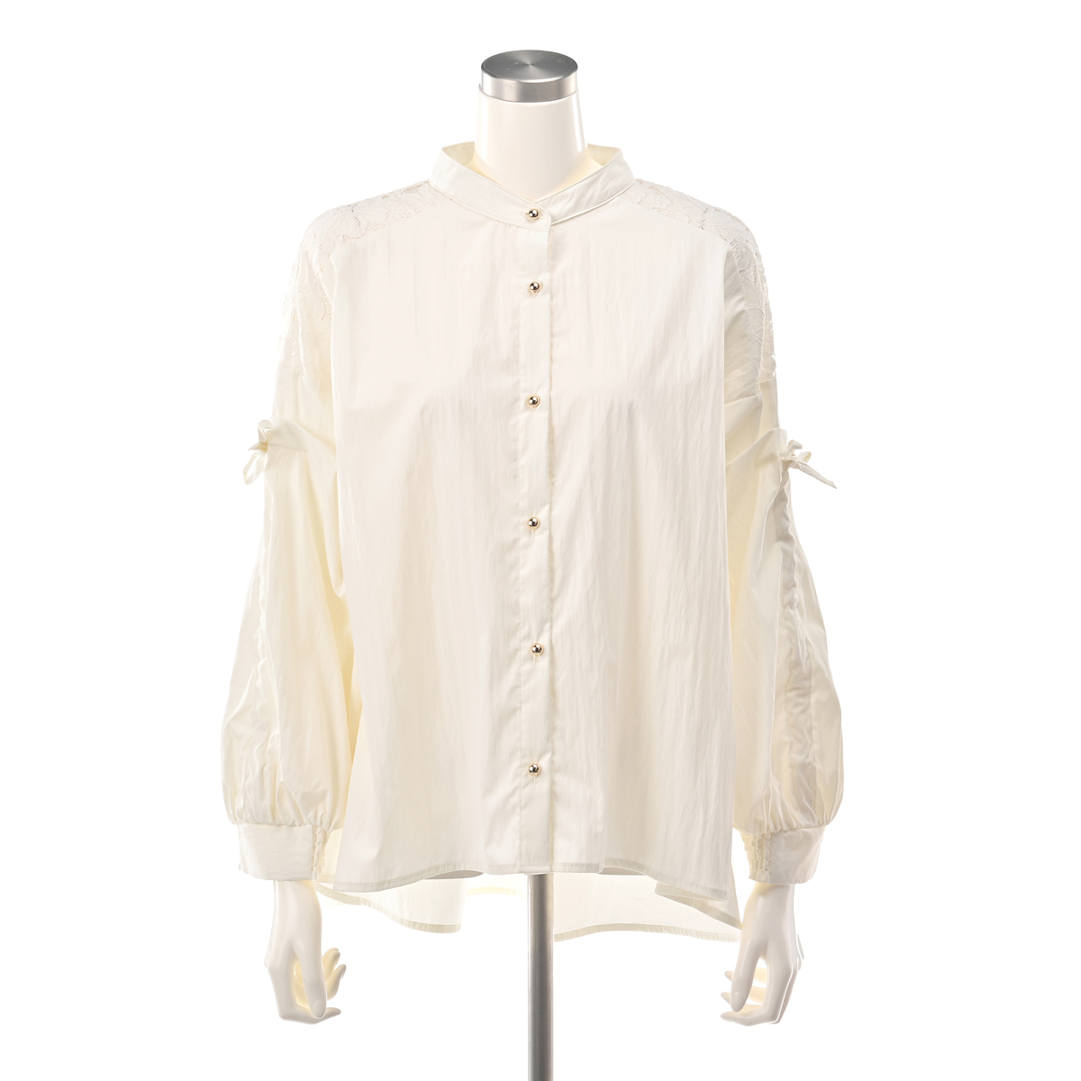 肩のレース切替やリボン仕様の袖など、細部までこだわったディテールが目を惹くノーカラーブラウス。エレガントなデザインで、オフィススタイルやきれいめなカジュアルコーデに活躍してくれます