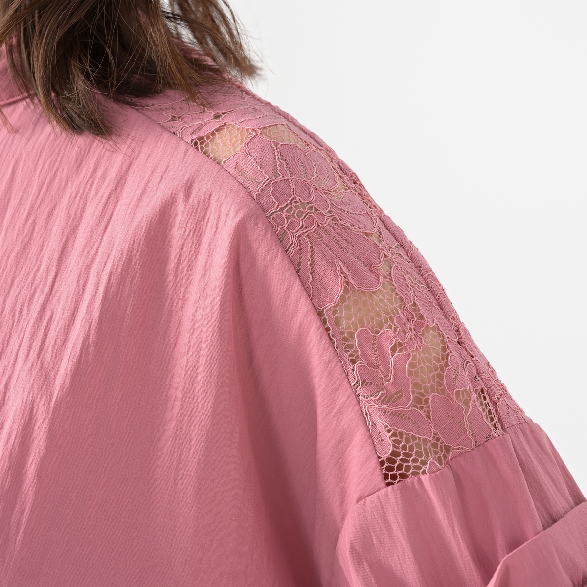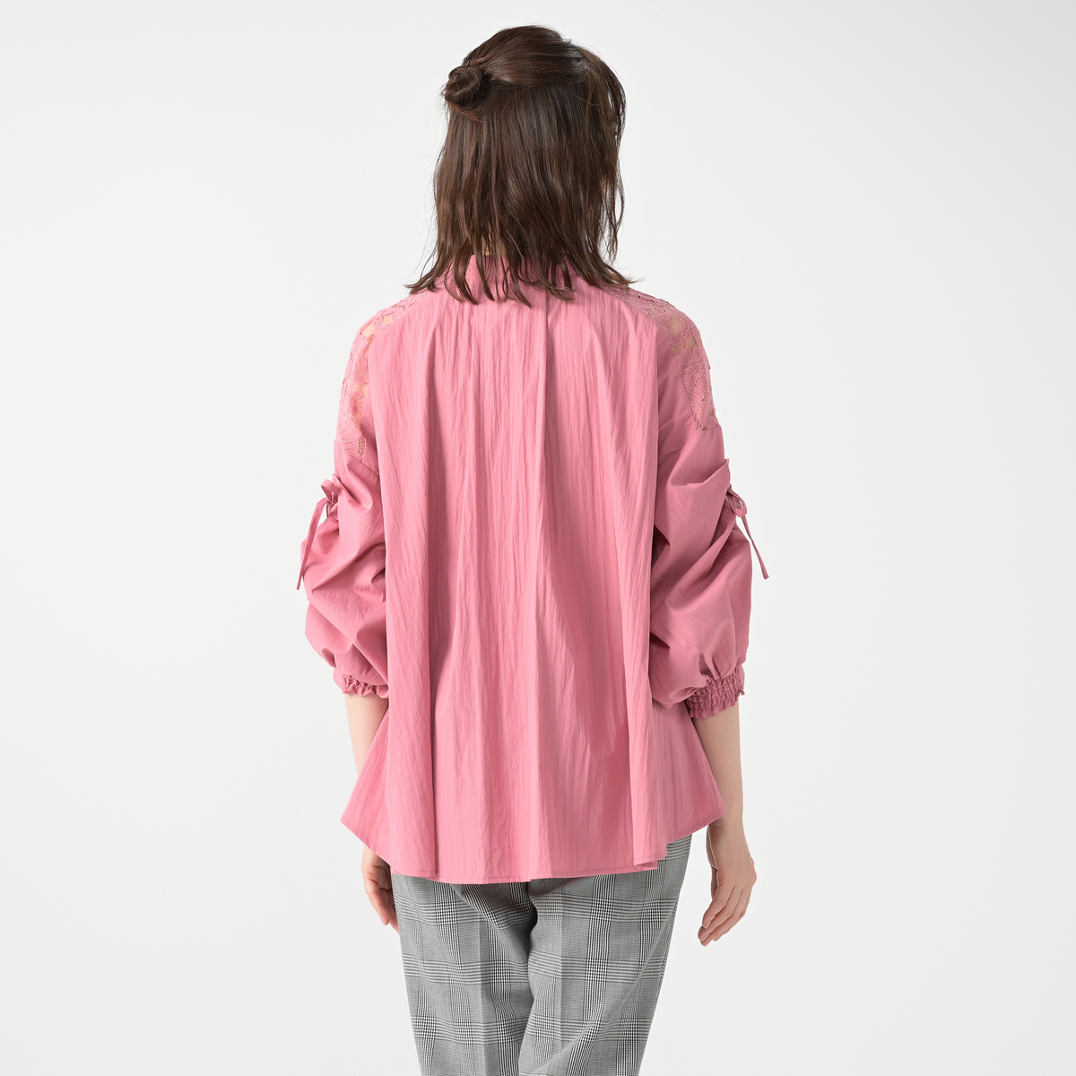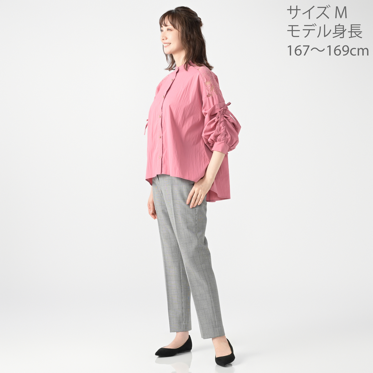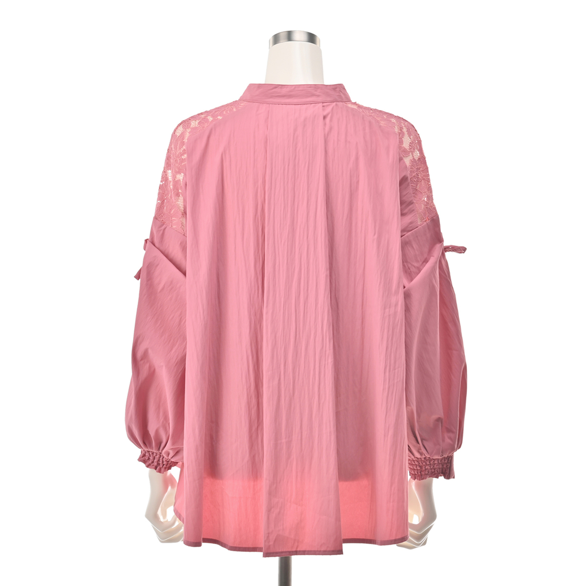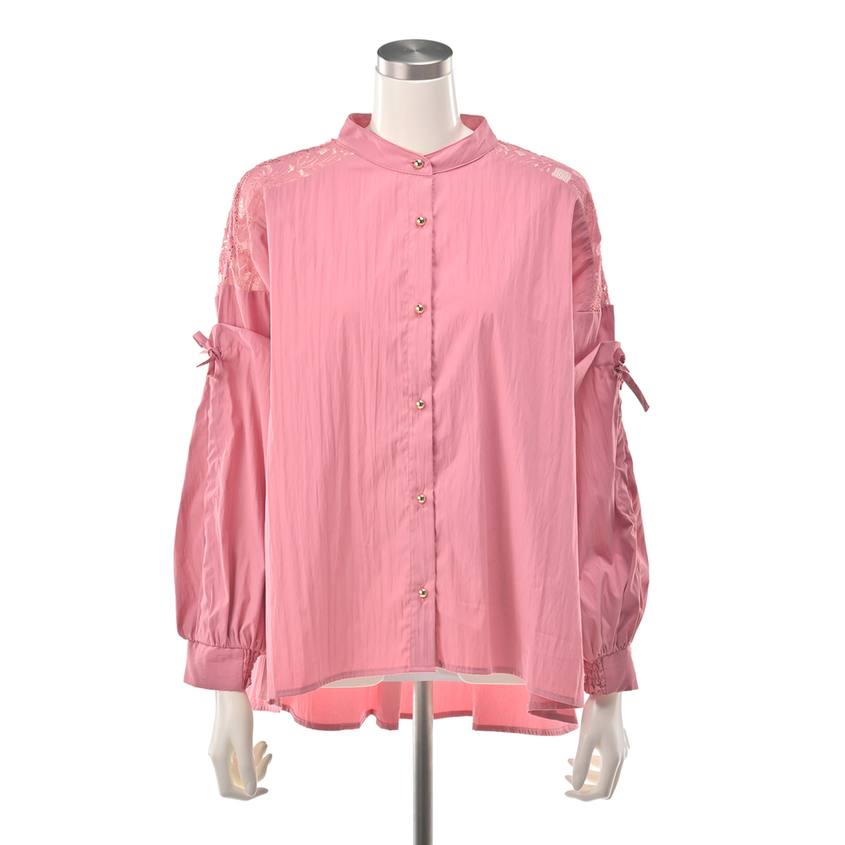 肩のレース切替やリボン仕様の袖など、細部までこだわったディテールが目を惹くノーカラーブラウス。エレガントなデザインで、オフィススタイルやきれいめなカジュアルコーデに活躍してくれます