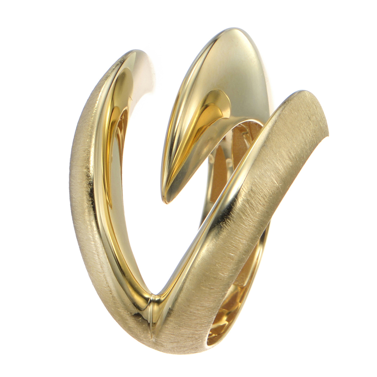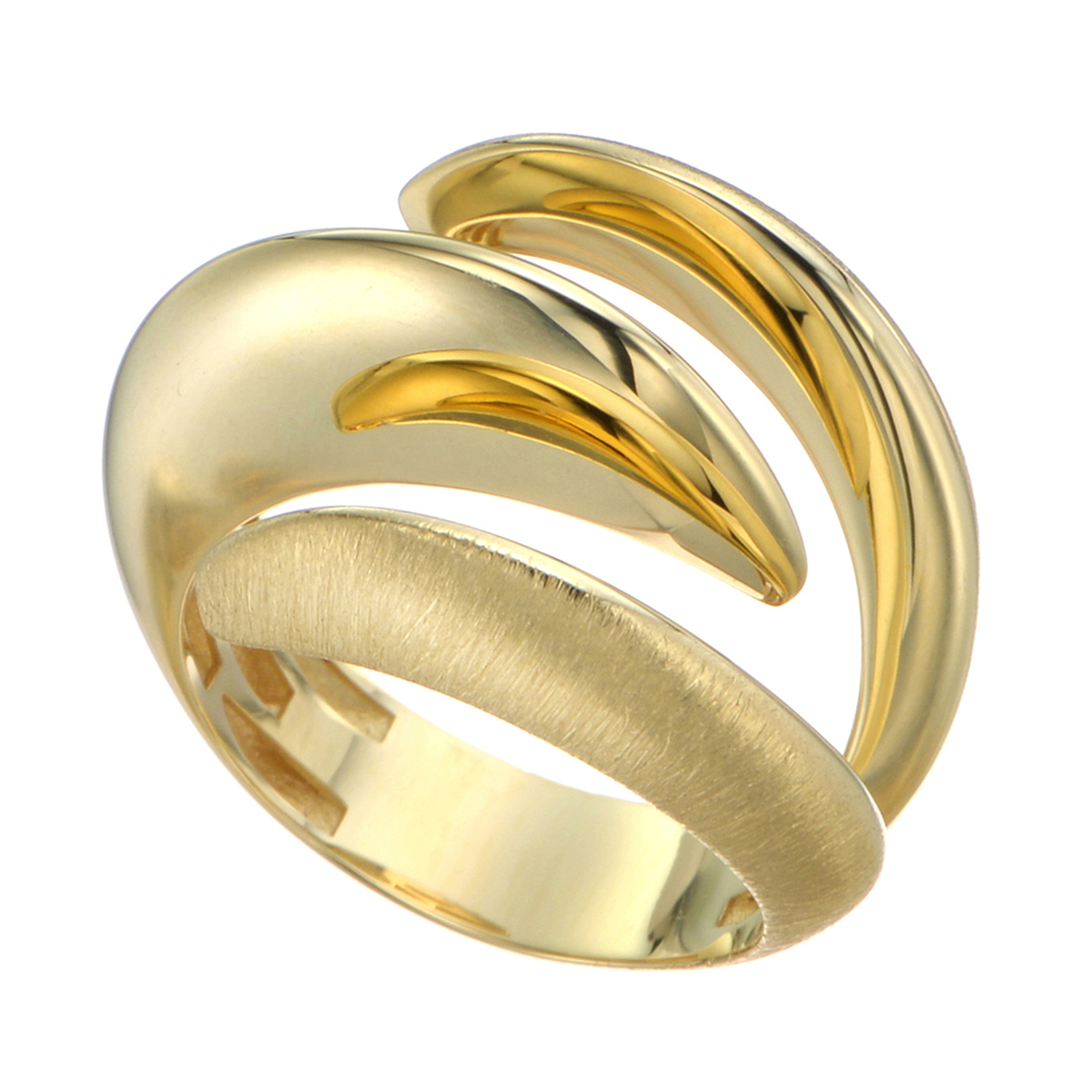 イタリアならではのデザイン性と技術力が結集した、存在感たっぷりなリングです。流れるようなラインが美しく、鏡面とつや消しを施すことで、異なる輝きが華やかさを添えます
