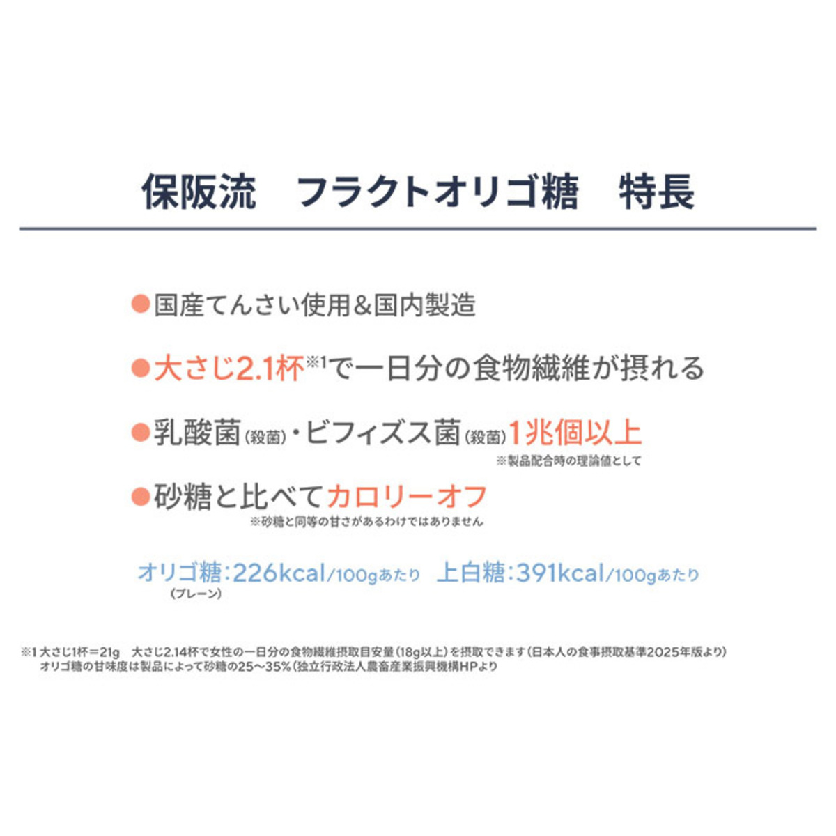 炒め物、煮物、和え物、デザート等、和洋問わず幅広くお使い頂ける、フラクトオリゴ糖。ほどよい甘みが特長です。1本500gあたりの推定値として約1兆個以上の乳酸菌(殺菌)・ビフィズス菌(殺菌)が配合されています*