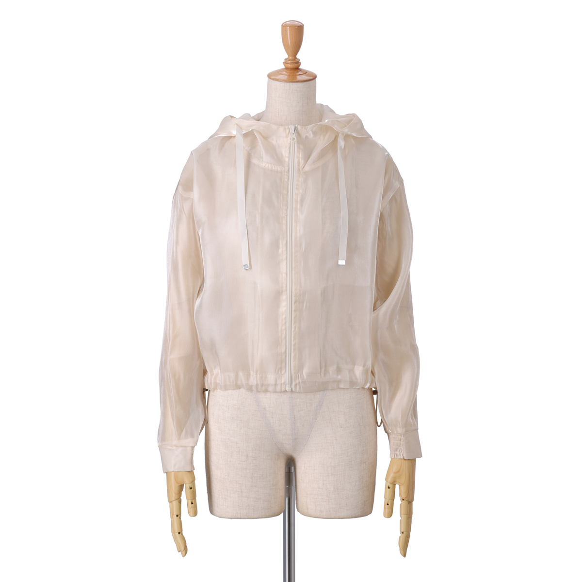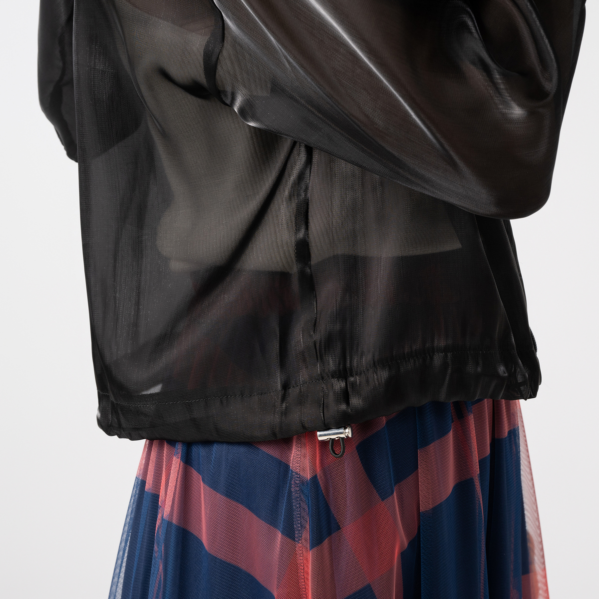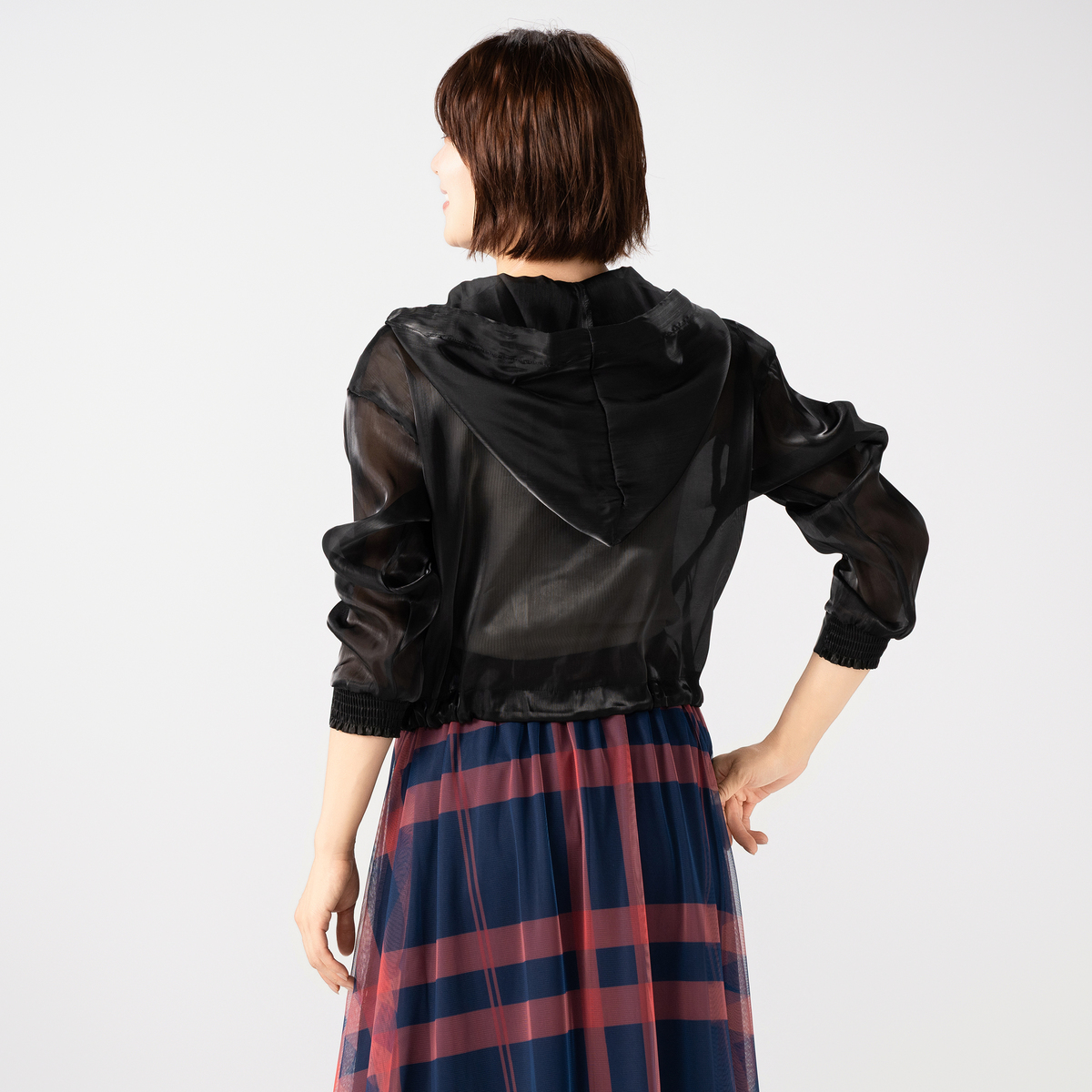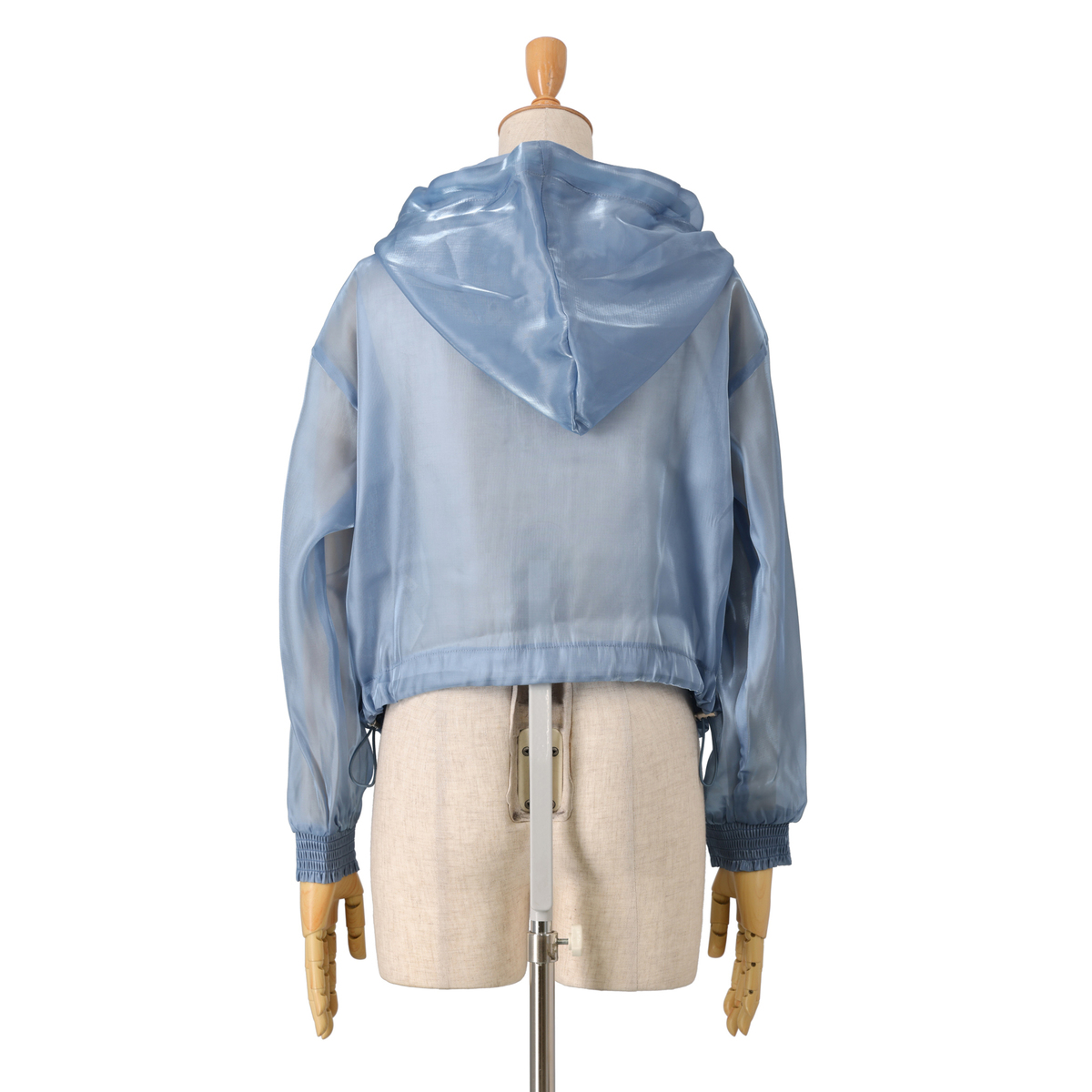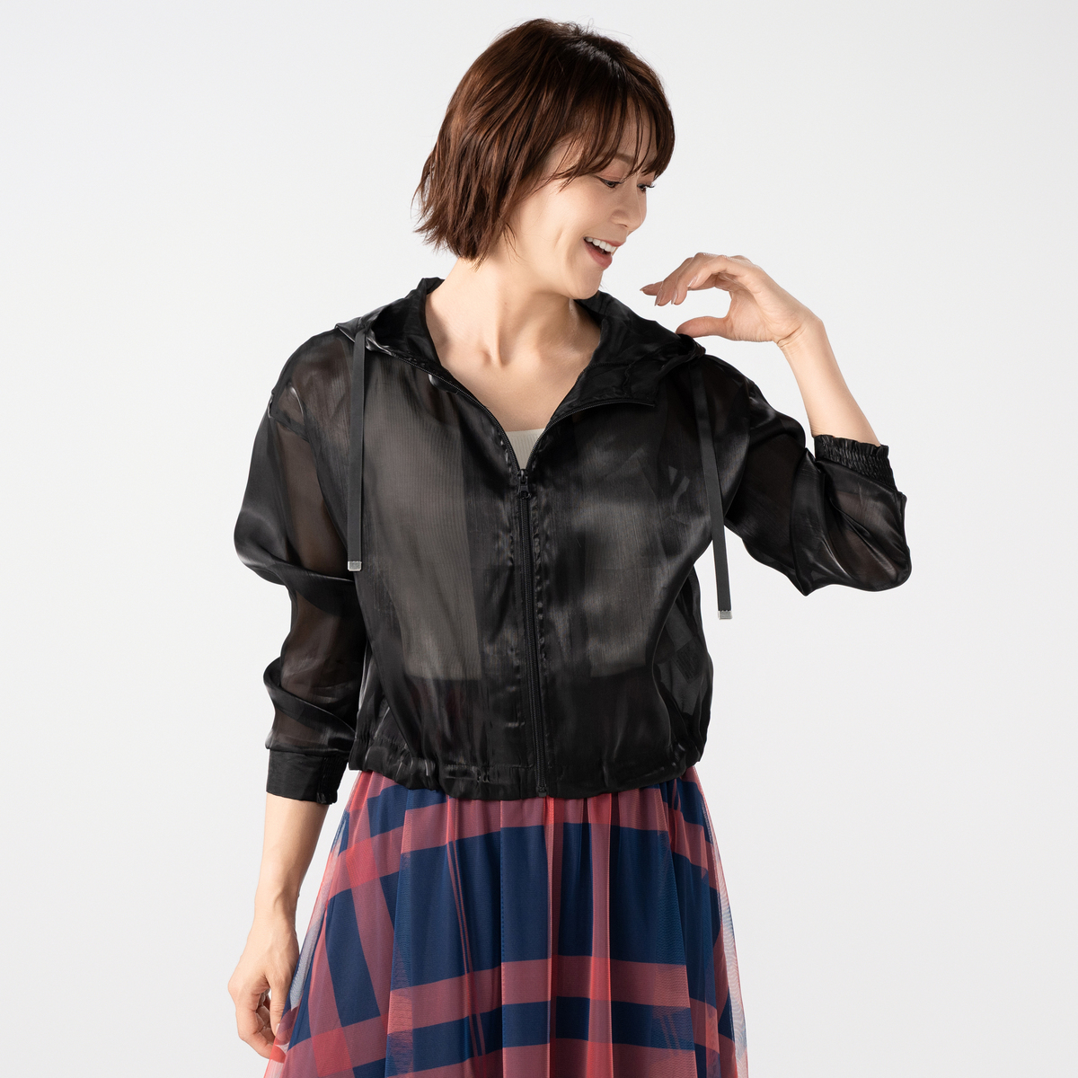 光沢感と透け感のあるフーディジャケット。本体の素材は薄手で軽量であり、程よいハリとコシがあって、形状を保ちます。また、素材特有の光沢がスタイリッシュな印象を与え、サラサラとした肌触りと程良い透け感があるので、見た目も涼しげです