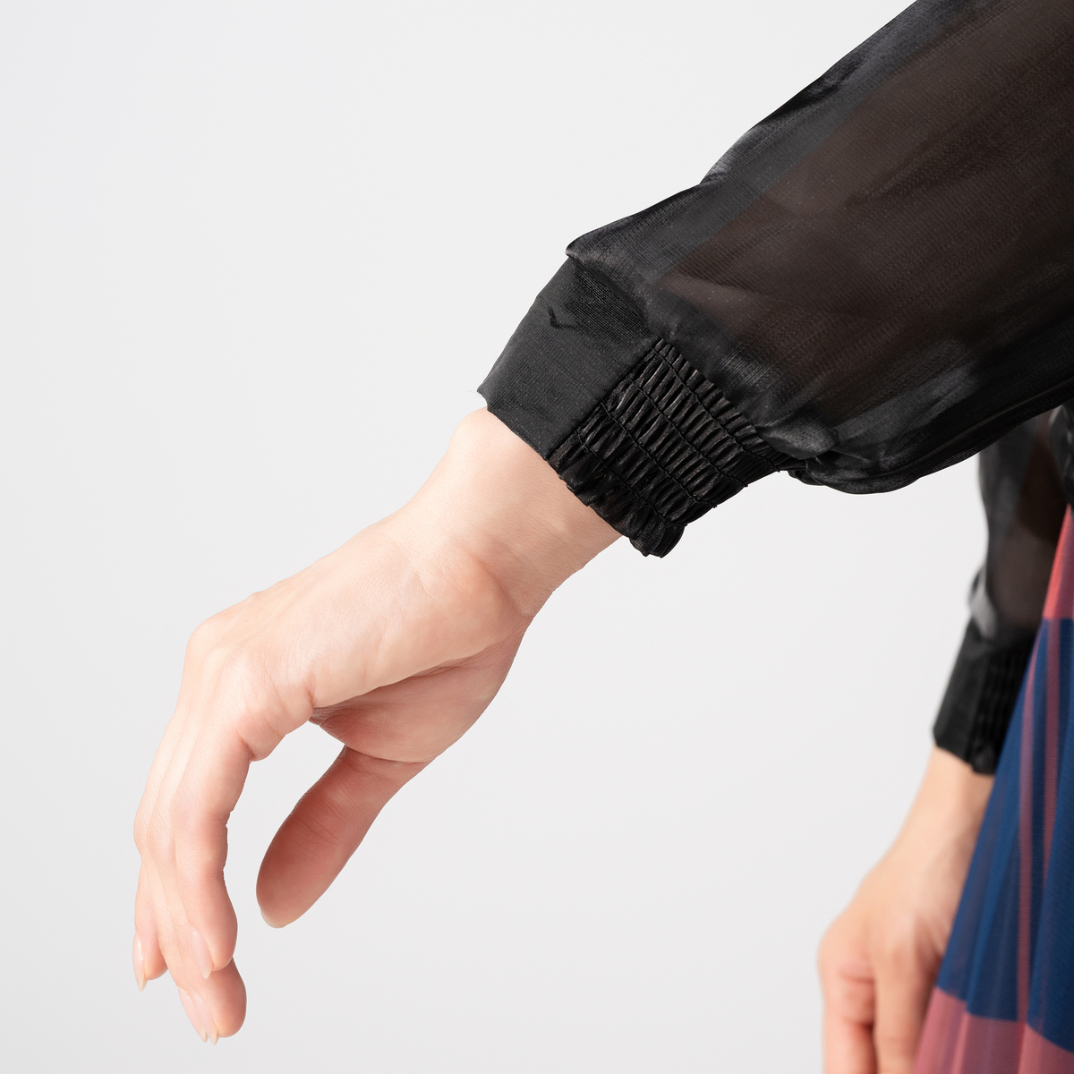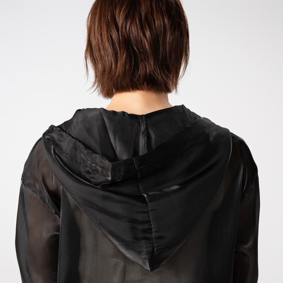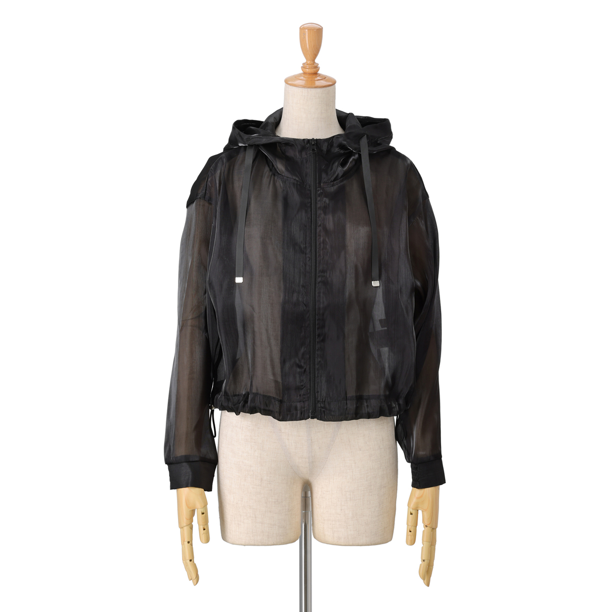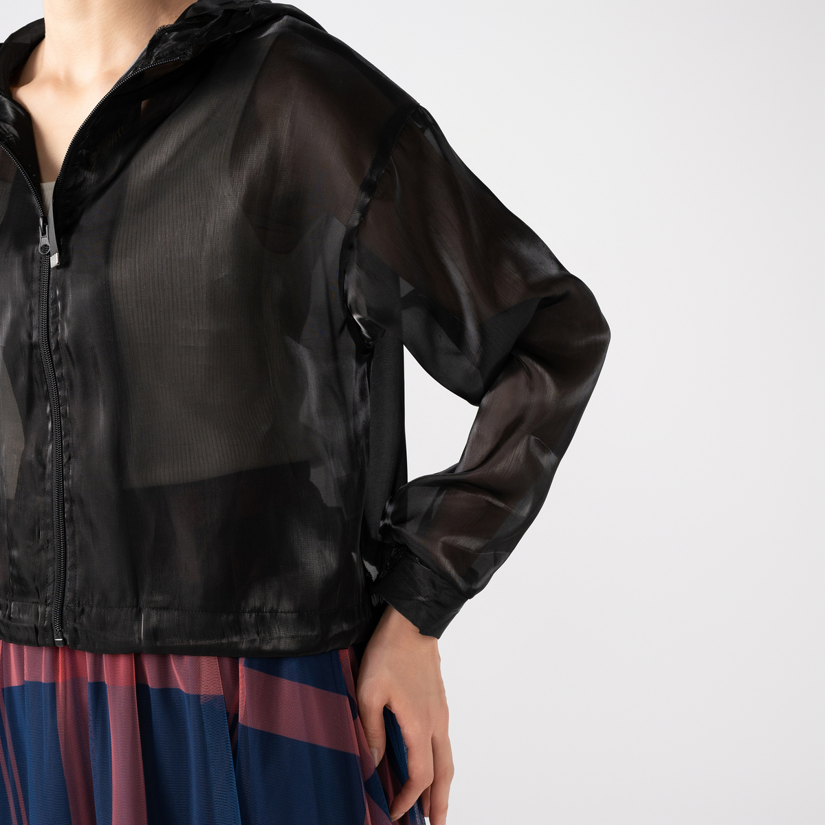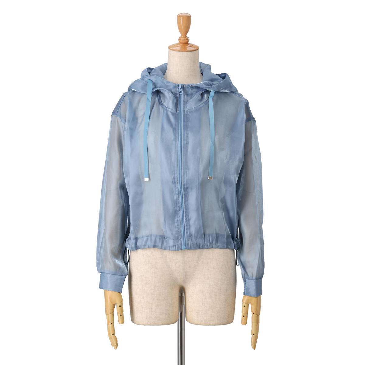 光沢感と透け感のあるフーディジャケット。本体の素材は薄手で軽量であり、程よいハリとコシがあって、形状を保ちます。また、素材特有の光沢がスタイリッシュな印象を与え、サラサラとした肌触りと程良い透け感があるので、見た目も涼しげです