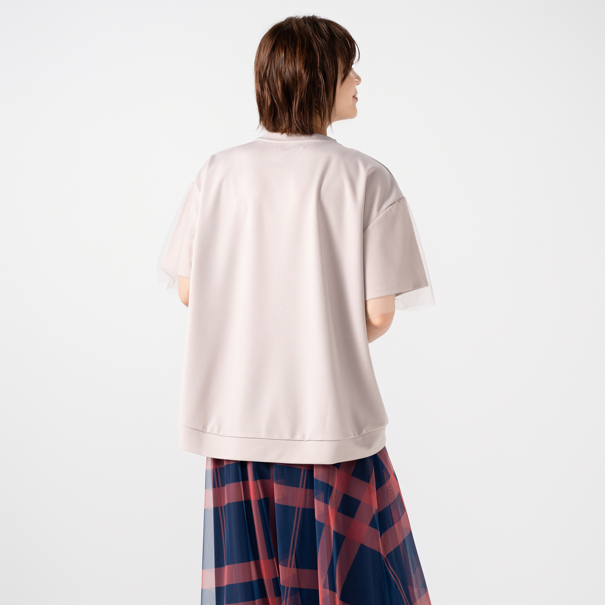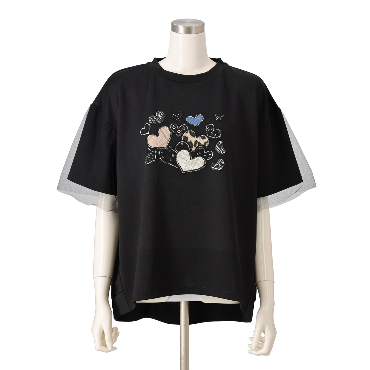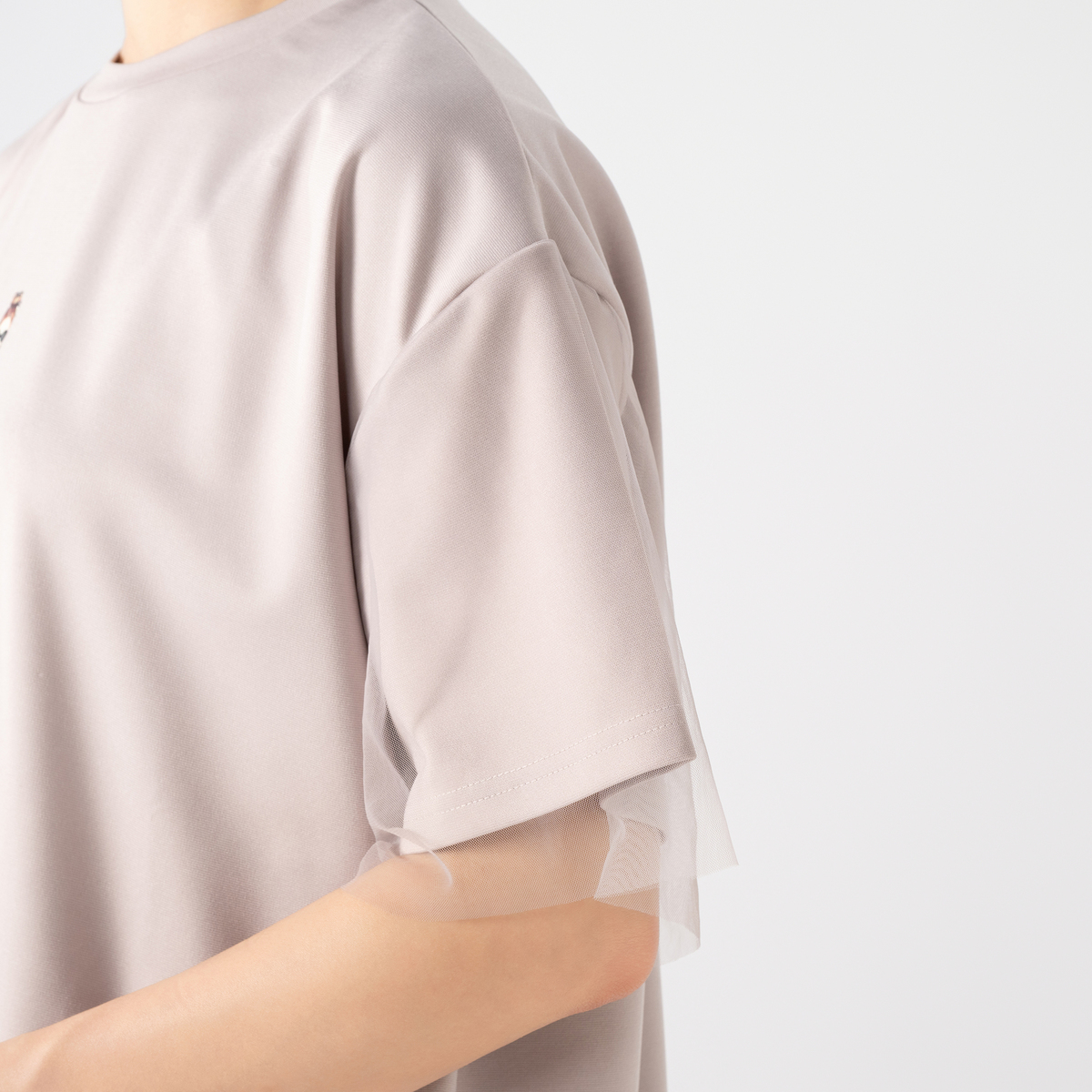 異なる印象のデザインを用いたプルオーバー。胸元に施したデコレーションが大人可愛さを添え、袖に被せたチュールレースが涼しげで上品な印象を与えます