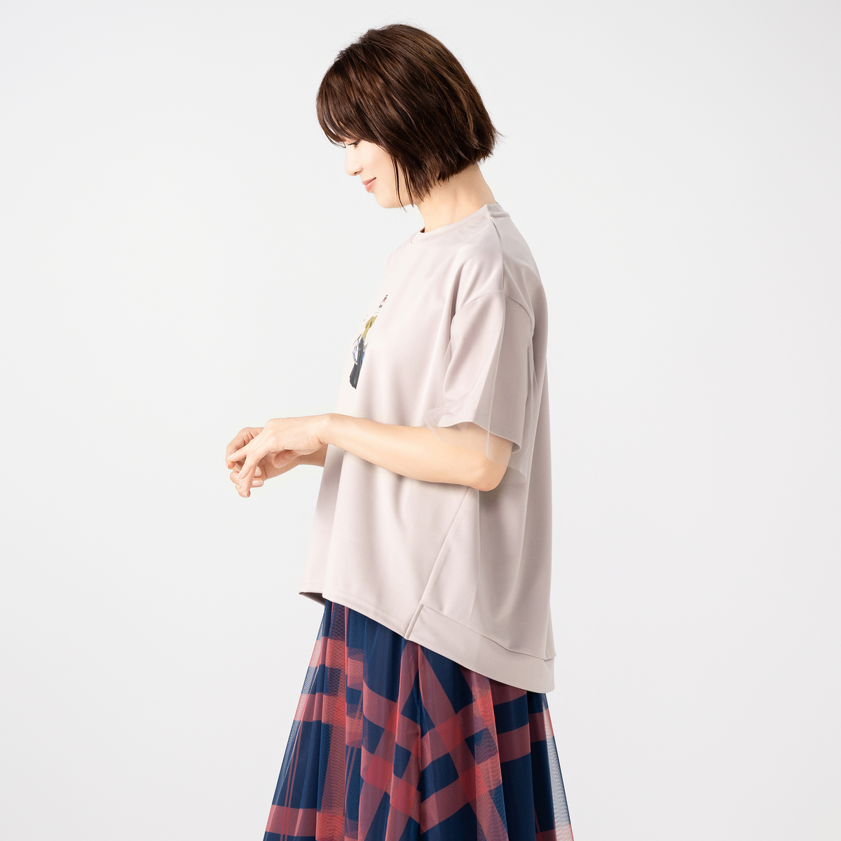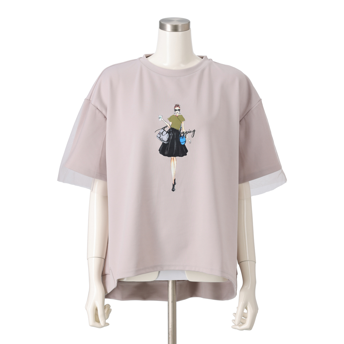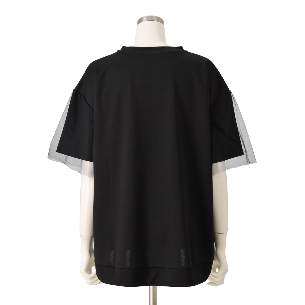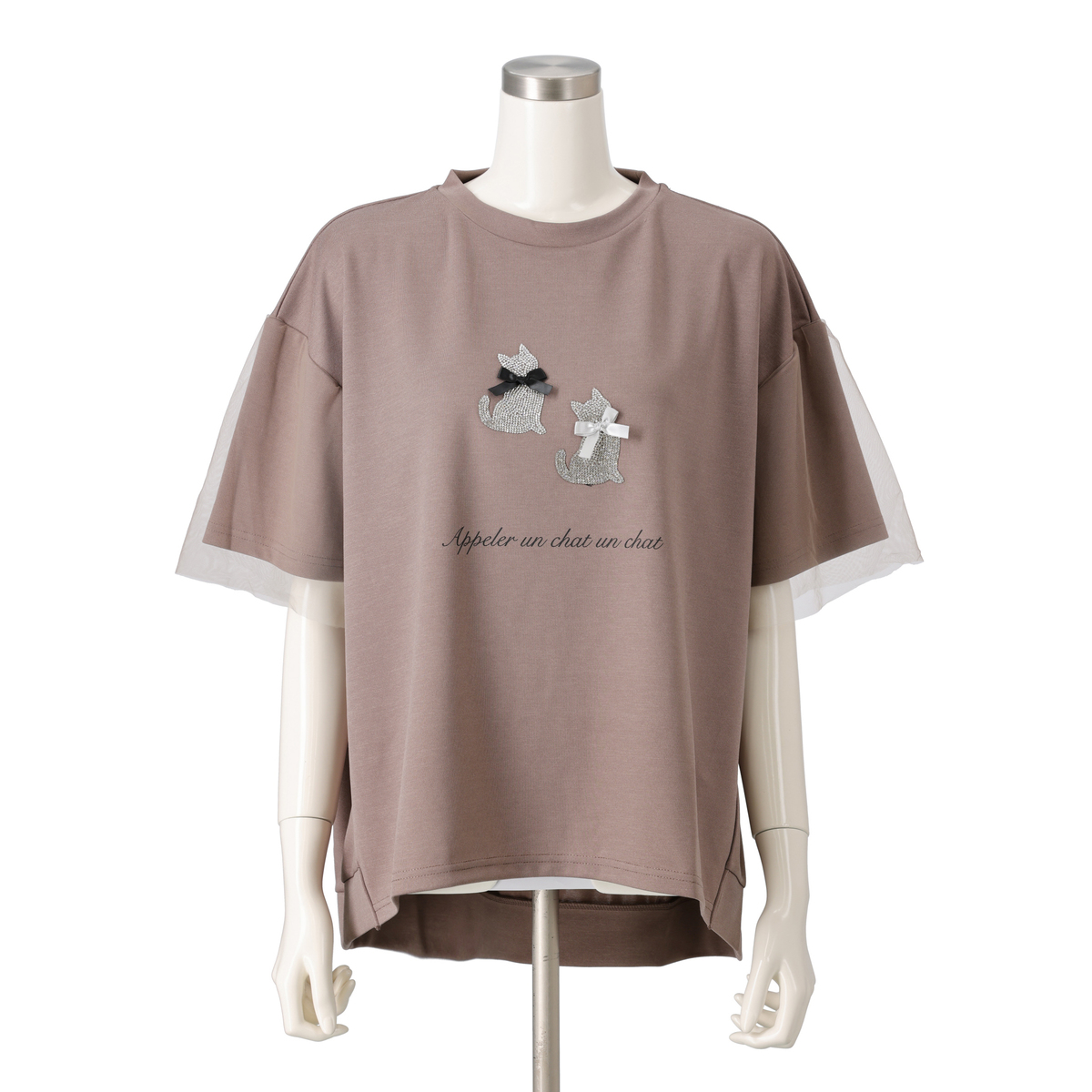 異なる印象のデザインを用いたプルオーバー。胸元に施したデコレーションが大人可愛さを添え、袖に被せたチュールレースが涼しげで上品な印象を与えます