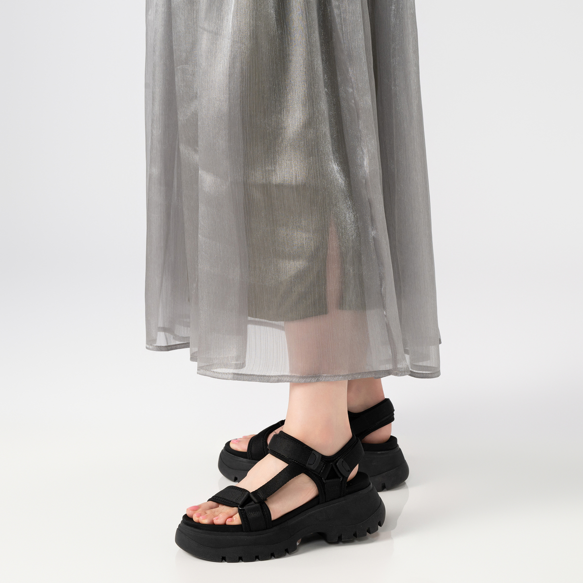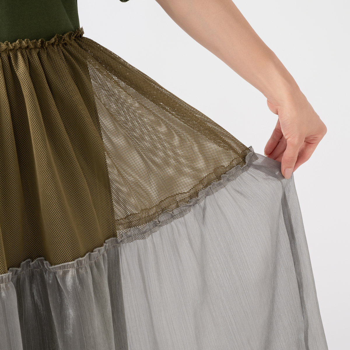 顔周りの生地には、素肌に心地よいポンチ素材を使用。中央の生地は、程良い透け感のあるメッシュ素材です。裾の生地はチュール素材で、足元にふわっと広がるシルエットが動くたびに揺れ、軽やかで涼しげです