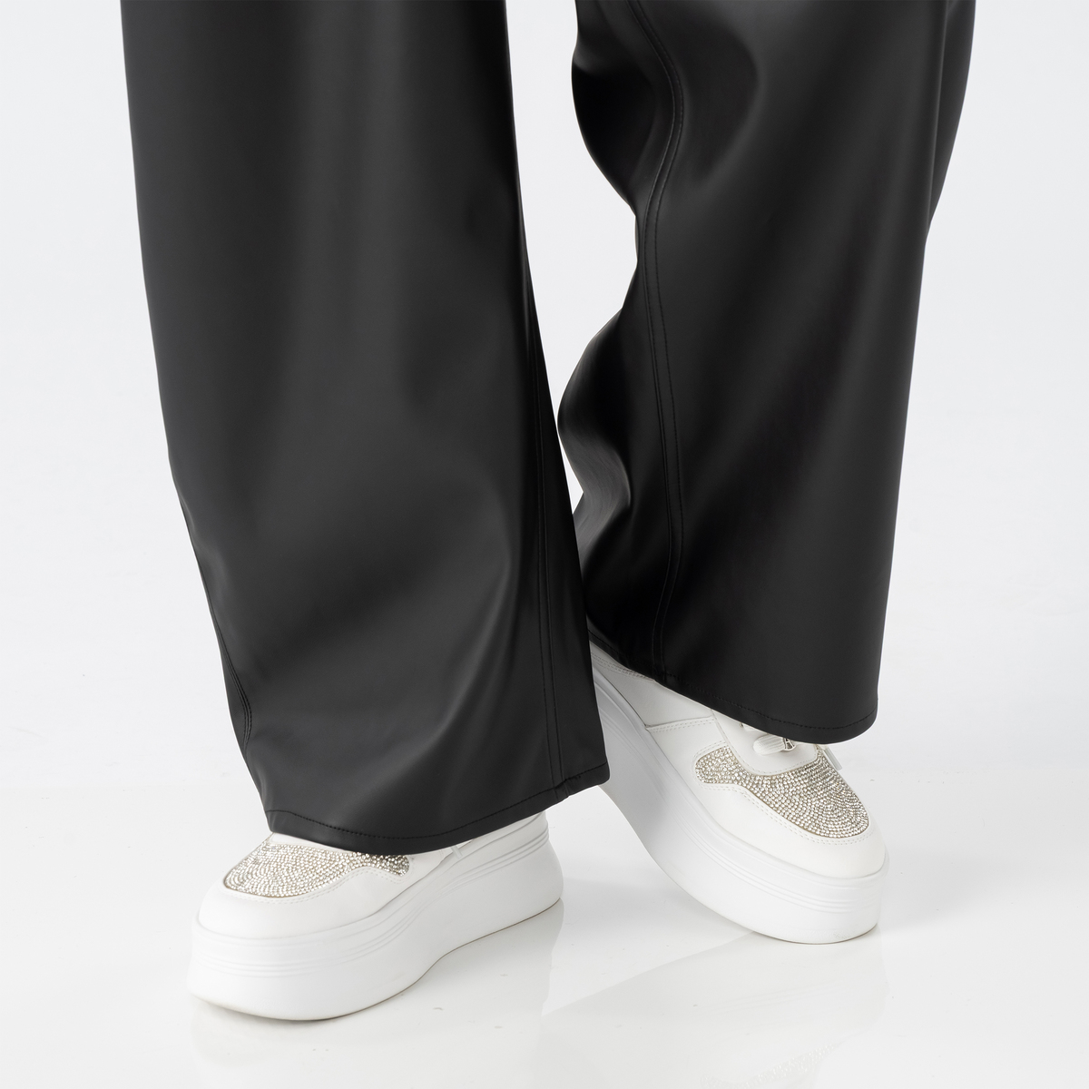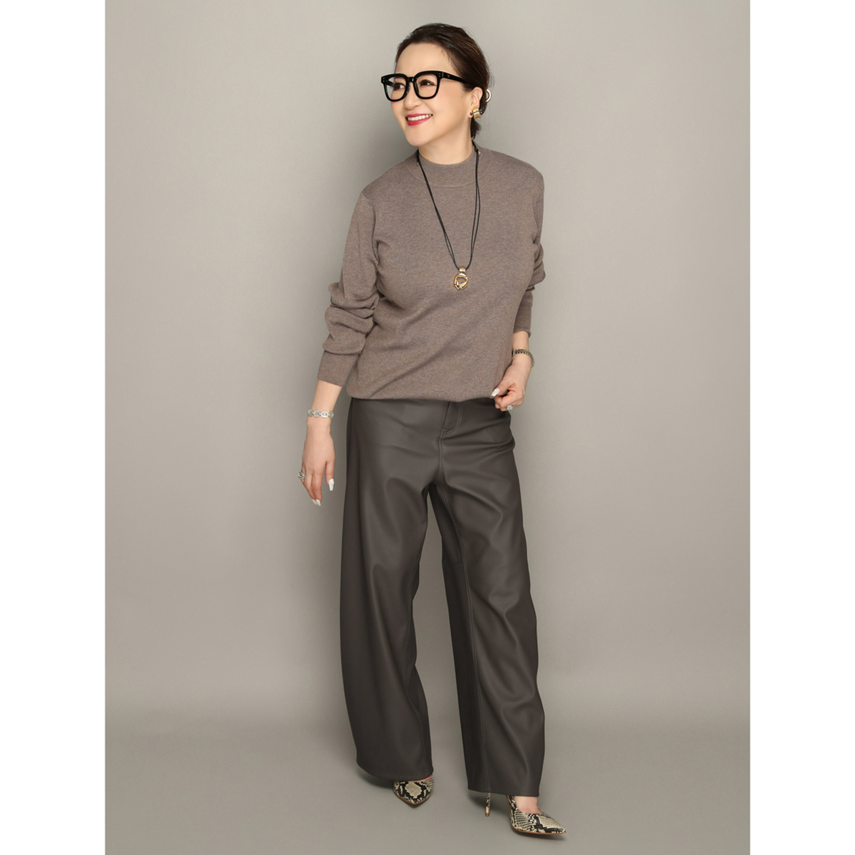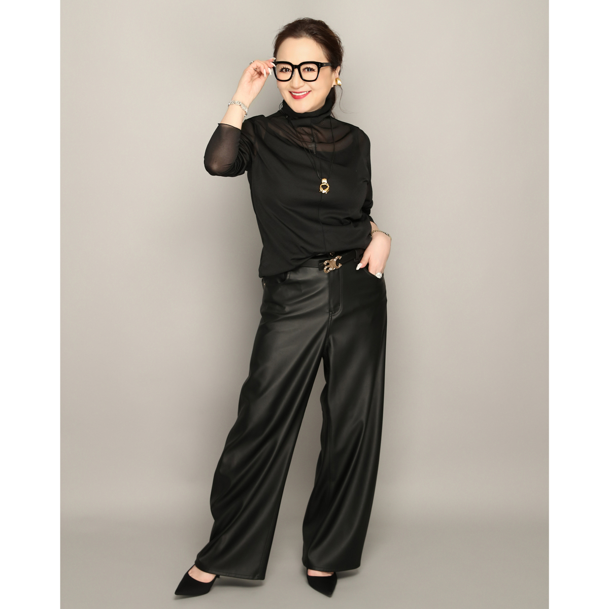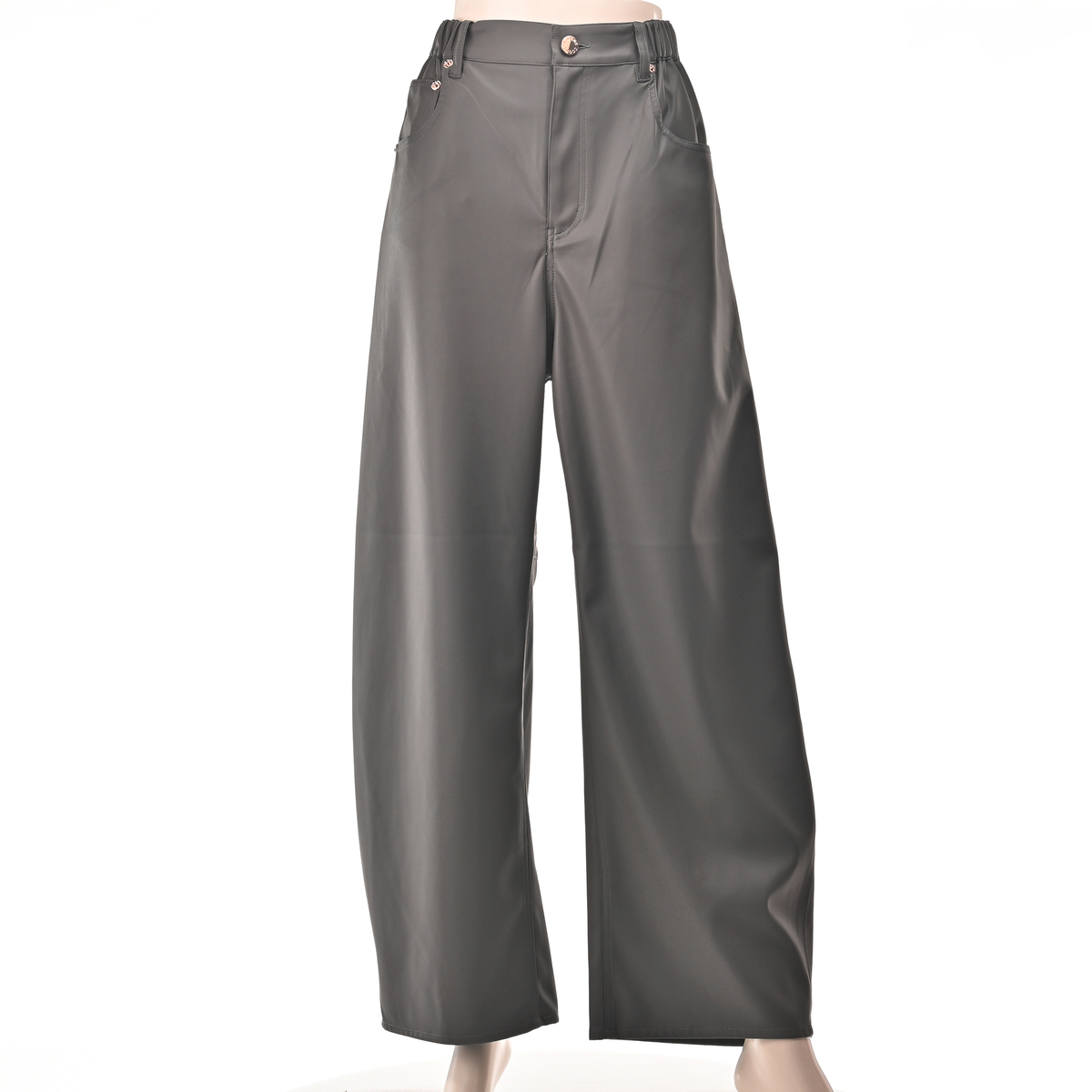 柔らかで伸び感のある、着心地の良いレザーライク素材を使用。さらに、両脇ウエストは平ゴム入りで、穿き心地良く仕上げました