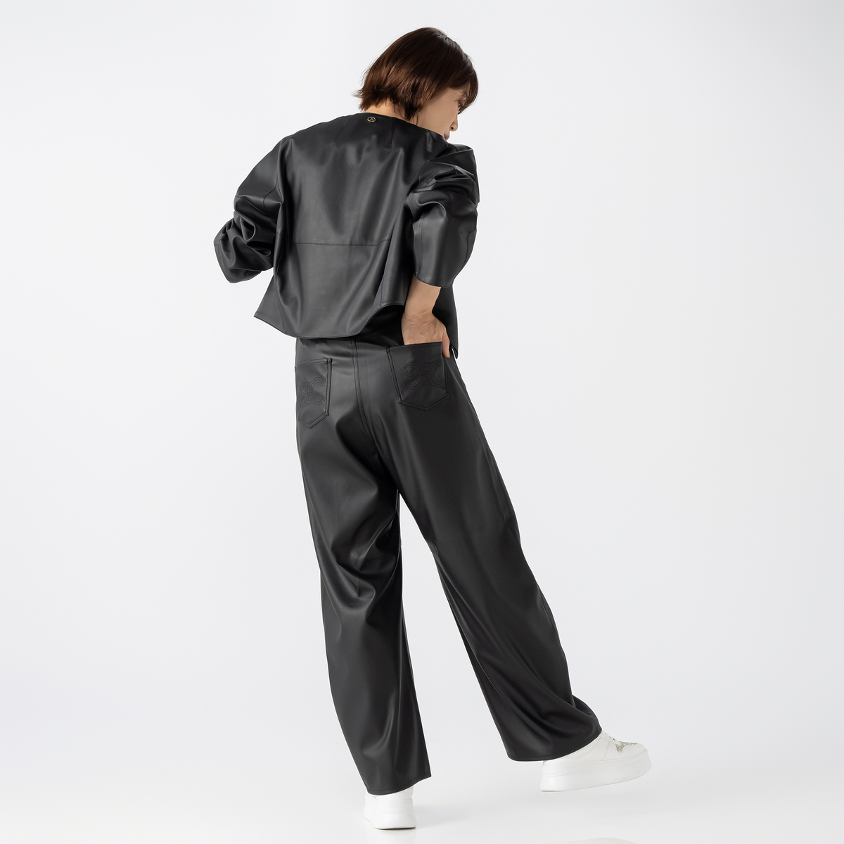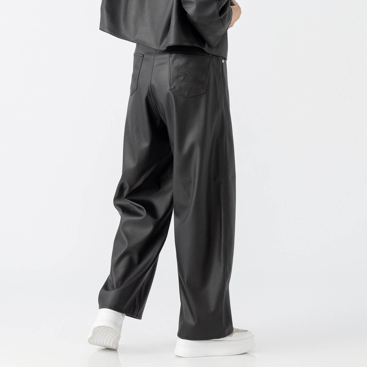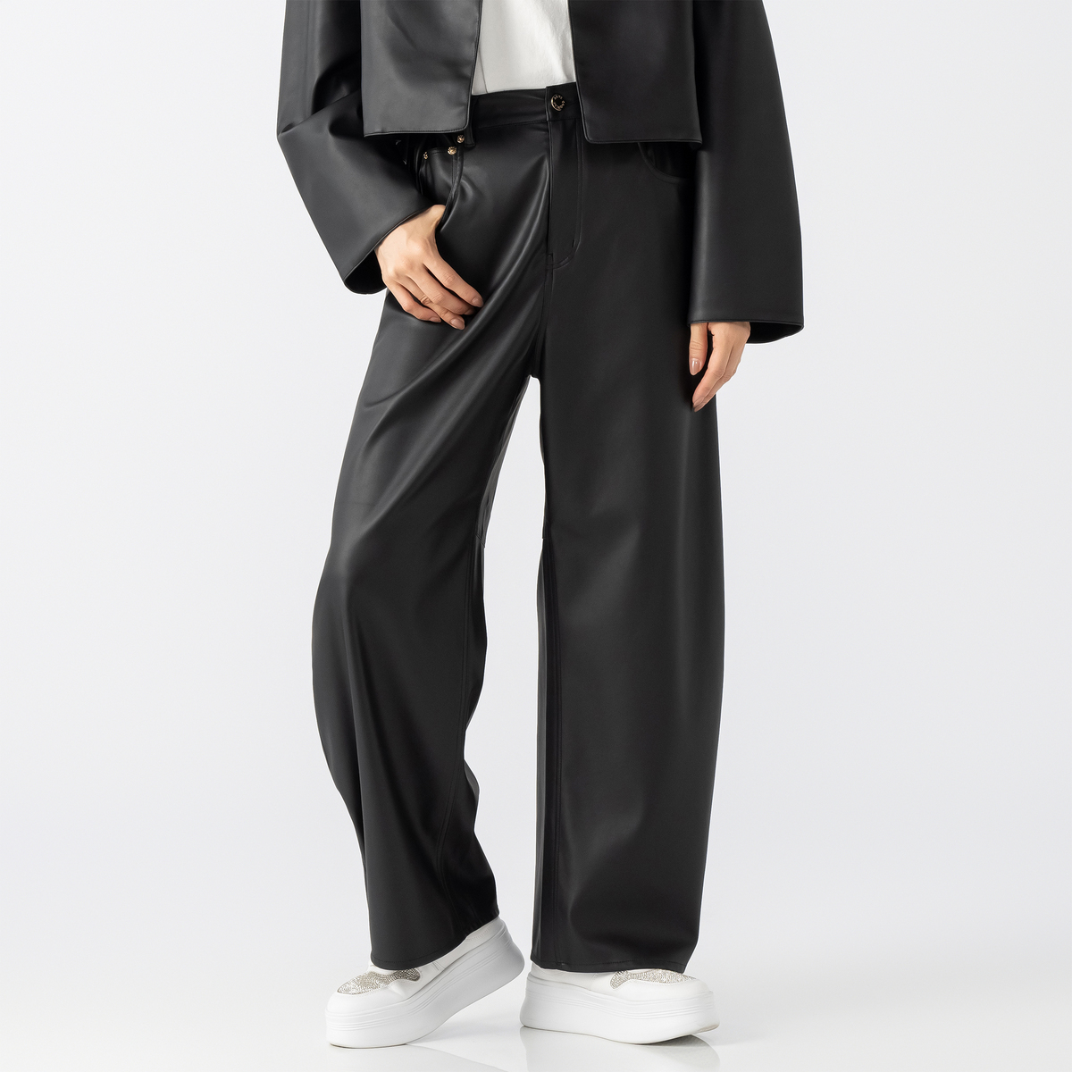 レザーライク素材を使用したパンツ。バレルシルエットでトレンド感があり、幅広いスタイリングに活躍してくれます