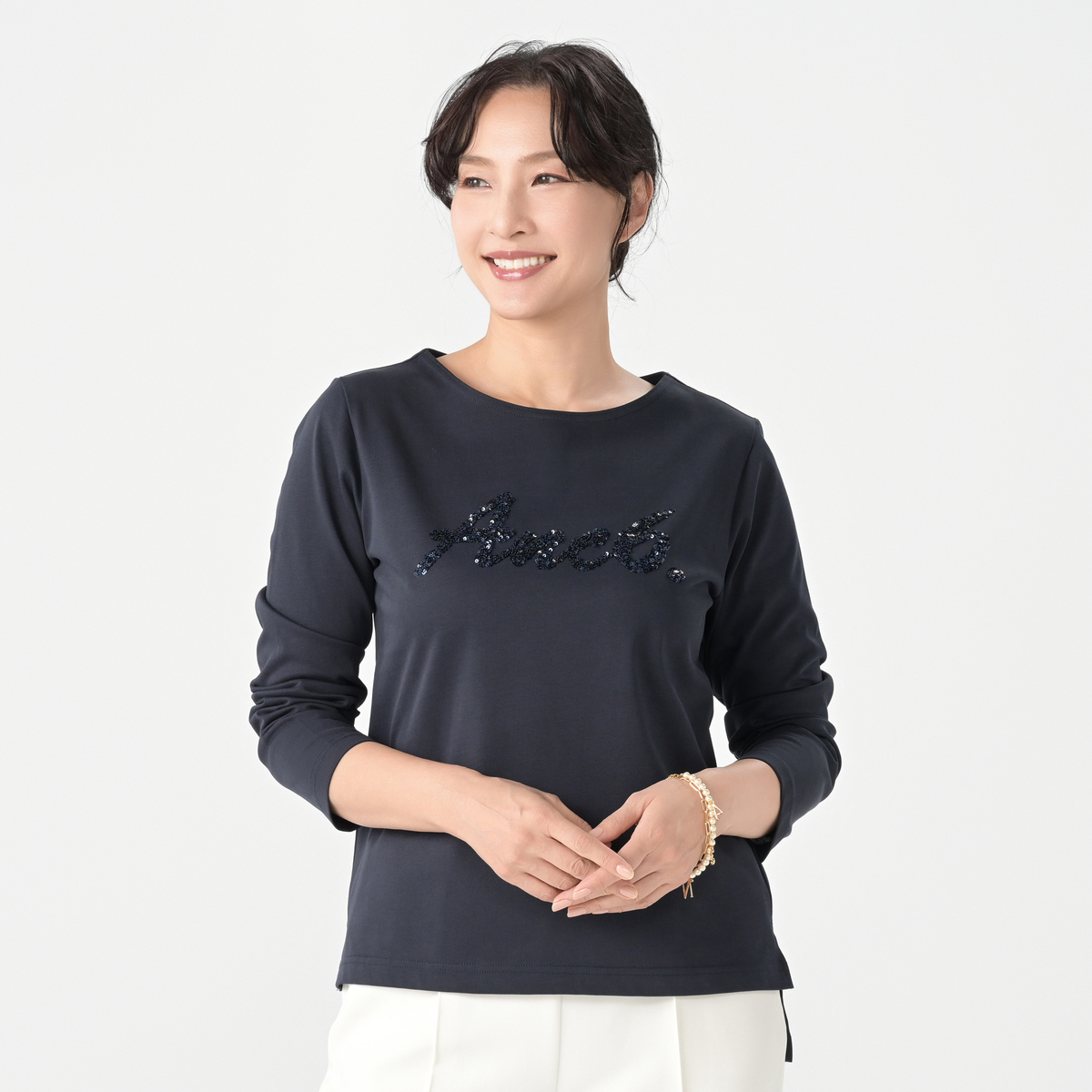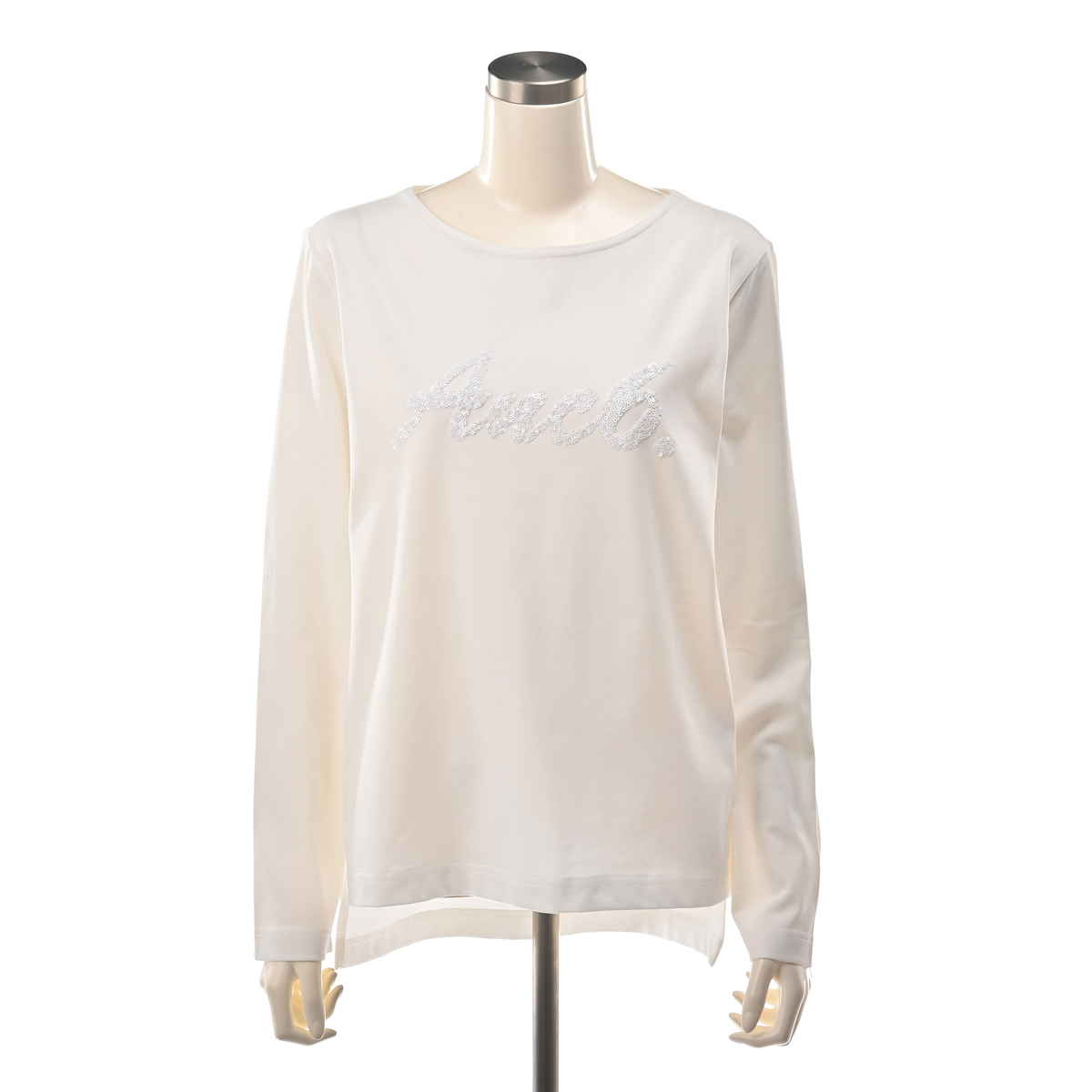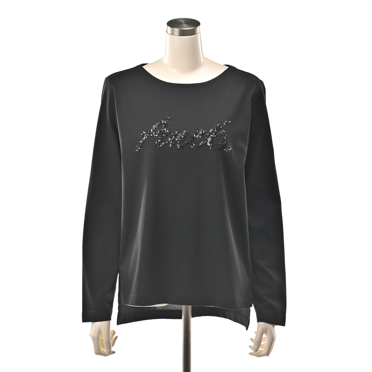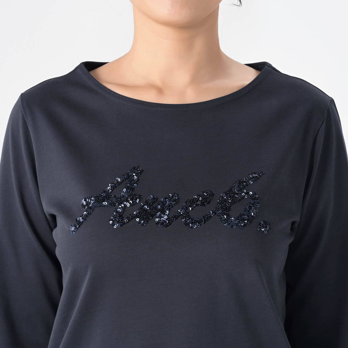 ボートネックのロングスリーブTシャツ。抗菌防臭加工を施したしっかりとしたカットソー素材を使っています。デコラティブなスパンコール刺繍をあしらった、オリジナルロゴが映えるデザインです