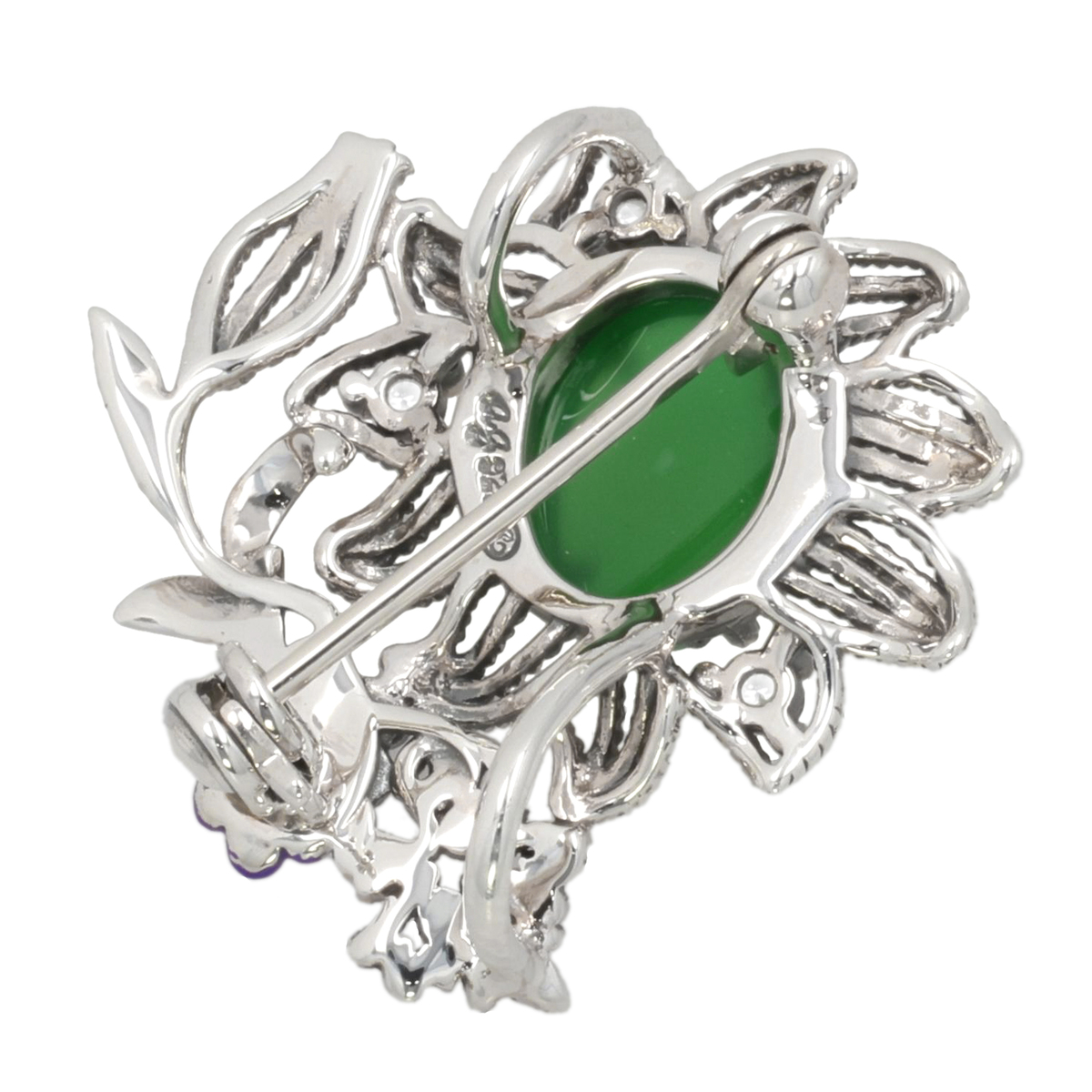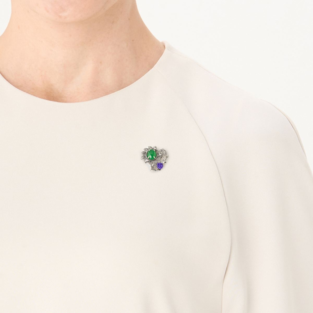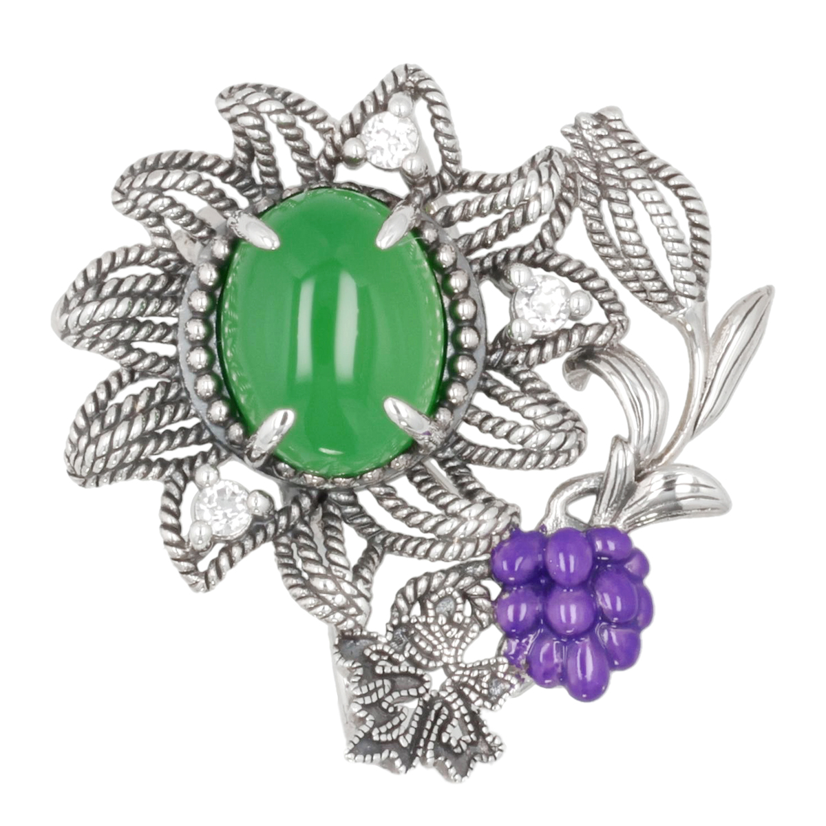 深く艶やかな紫色のエナメルで彩られた葡萄モチーフが、みずみずしいグリーンメノウの隣にあしらわれ、色彩の対比が美しく引き立つデザイン。程良い大きさなので、ペンダントヘッドやストール留めとしてもお使いいただけます
