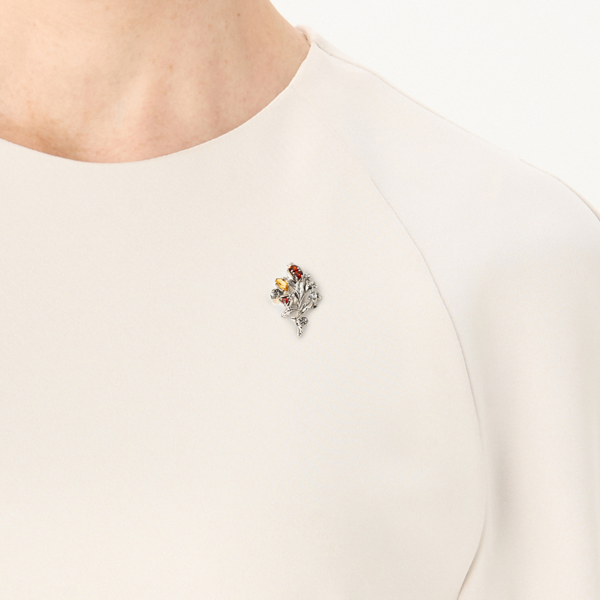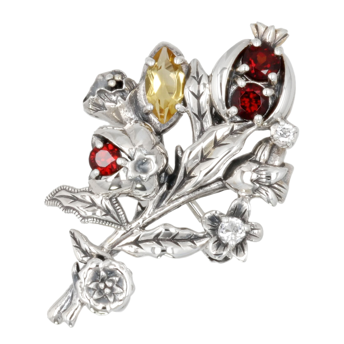 柘榴の果実を柘榴石と呼ばれるガーネットで、レモンの部分をマーキスカットのシトリンで表現。繊細な植物模様の重なりがブーケのようにも見えるデザインです
