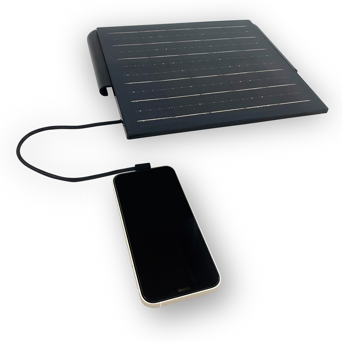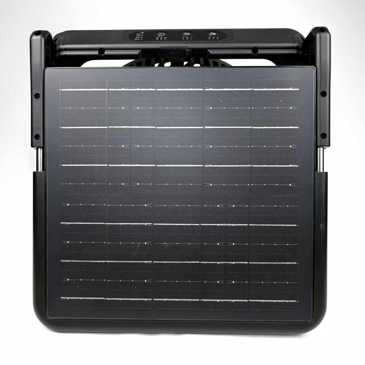 背面には取り外し可能なソーラーパネル付き。本体からスマホやUSB接続機器の充電や、ソーラーパネルを取り外して単体で直接充電も可能で、アウトドアや災害時にも役立ちます
