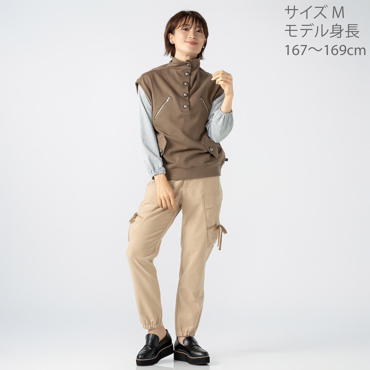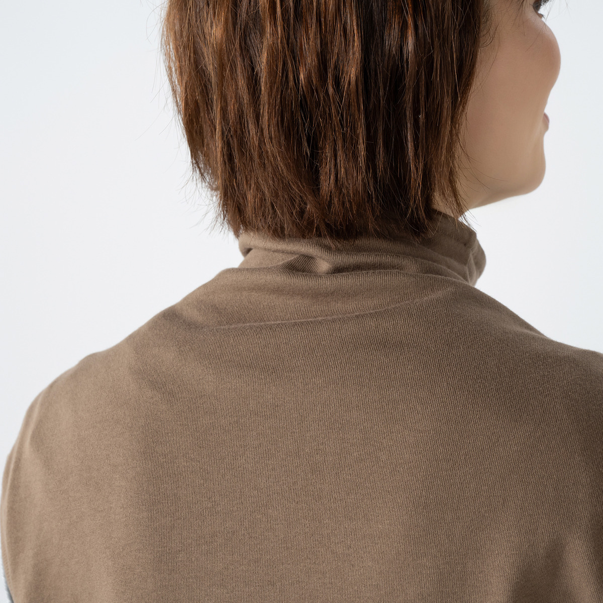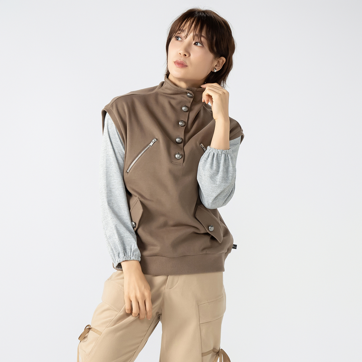 デザイン性のあるボトルネックベストです。中にインナーを入れても着用いただけるデザインで、ロングシーズン活躍します