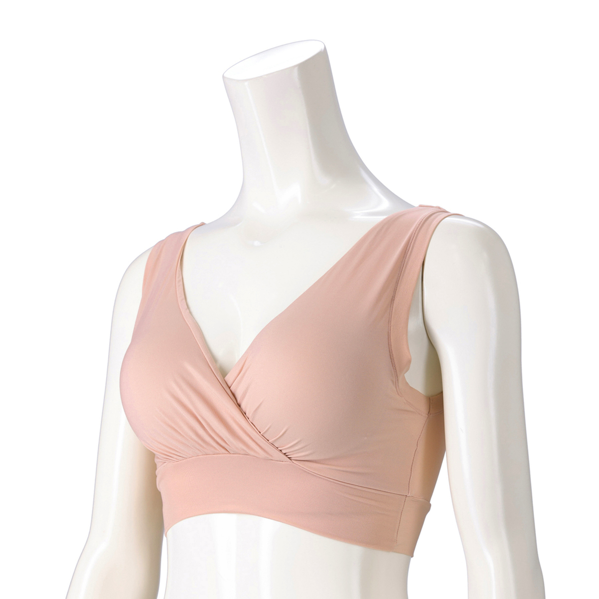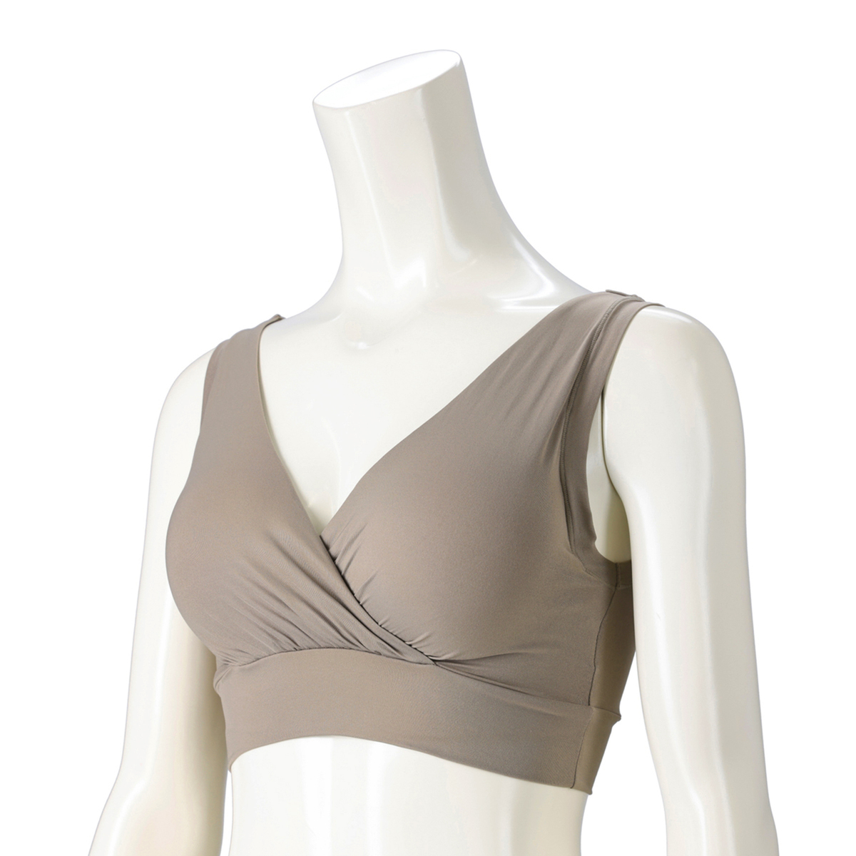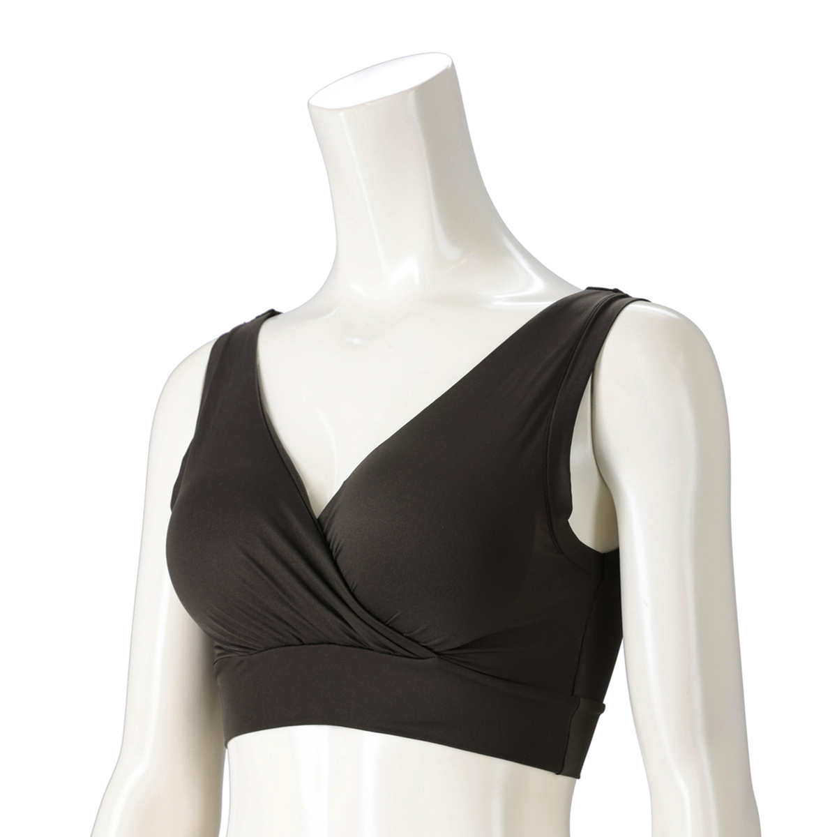 よく伸びる素材でM〜LLサイズまで対応。品のあるカシュクールデザインです。アンダー部分にゴムを使わず、わさ仕様のラクな着用感。締め付け感がなく段差ができにくく。取り外し可能なパッド入りです