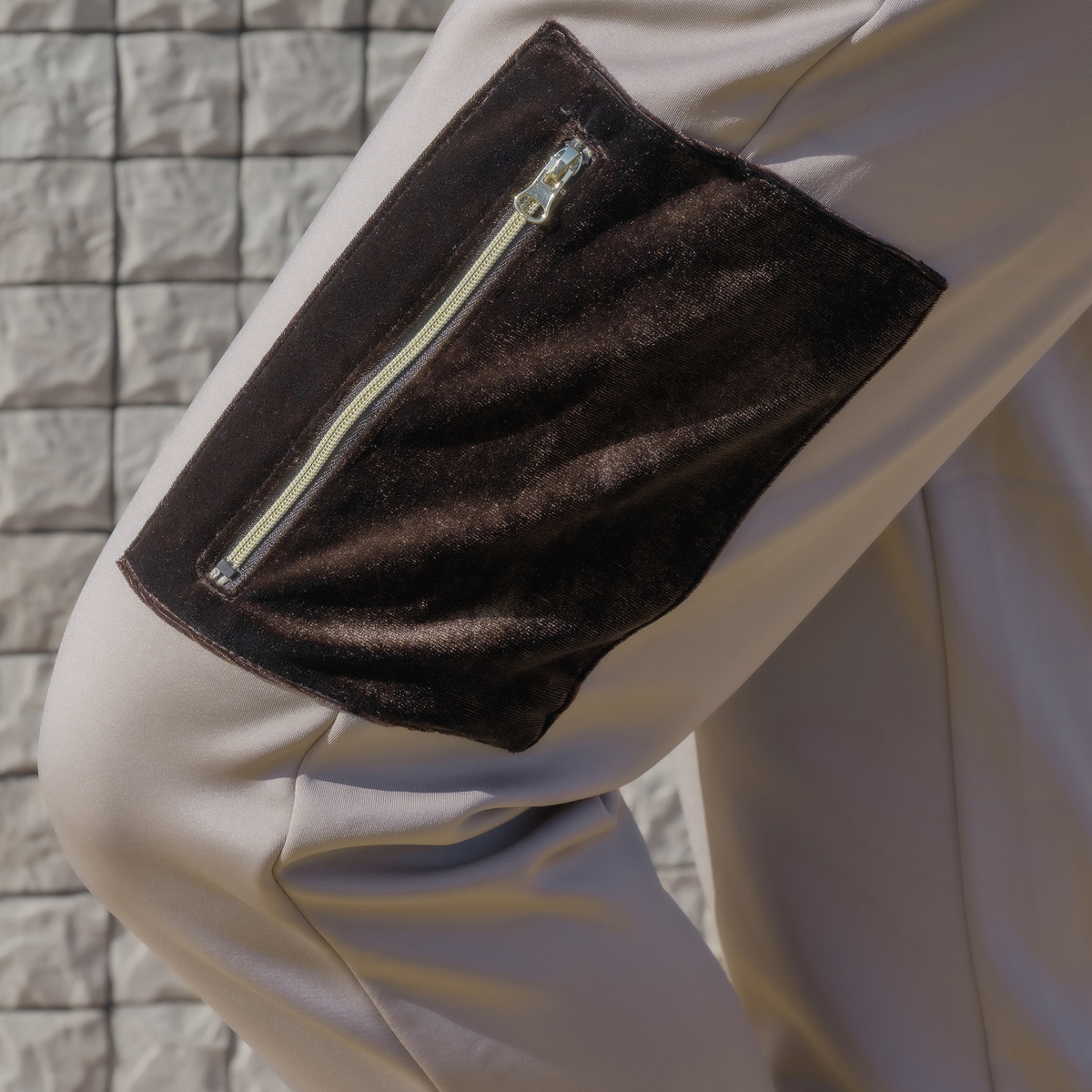 季節感を演出するアクセントとして、左側にベロア素材を使用したカーゴポケットをあしらいました