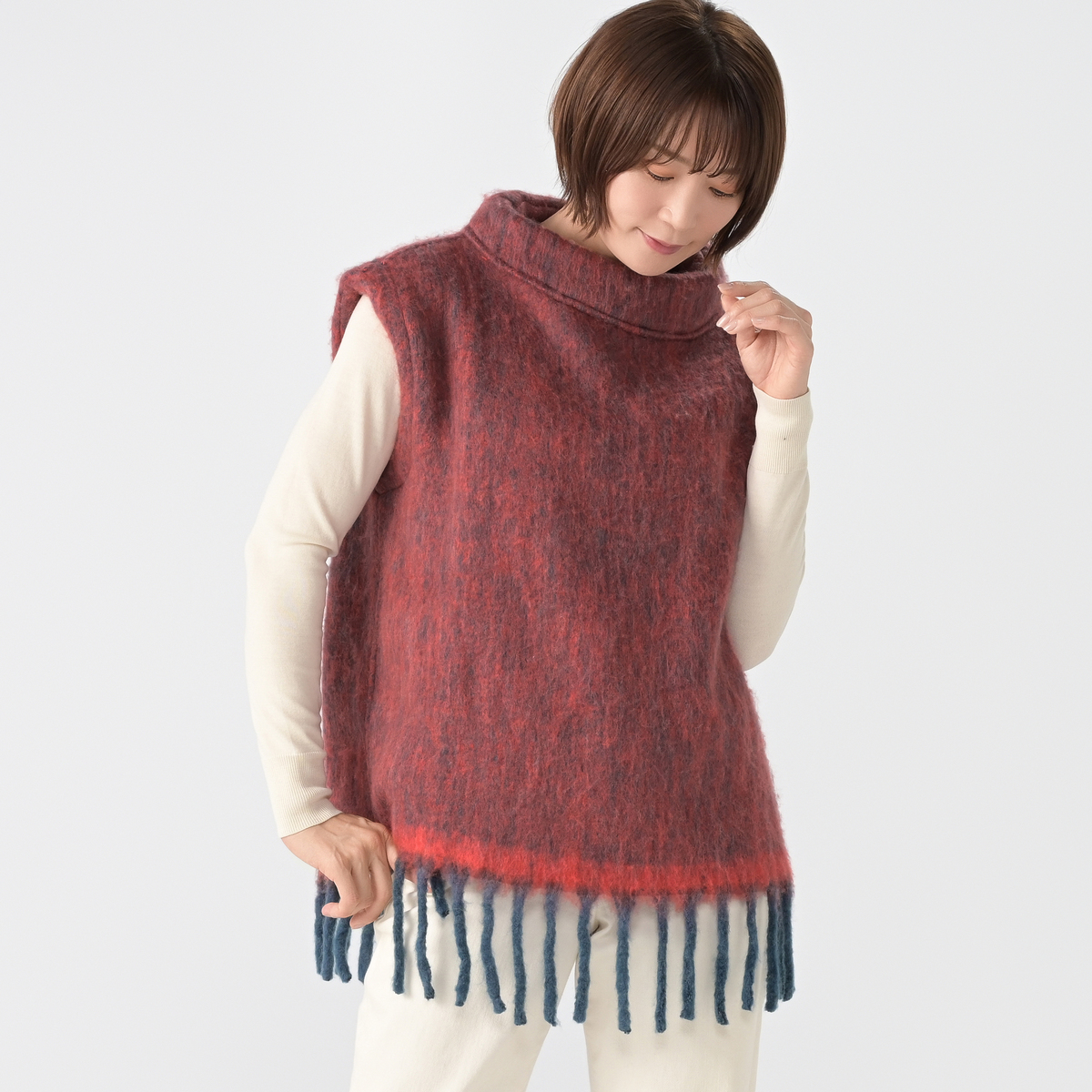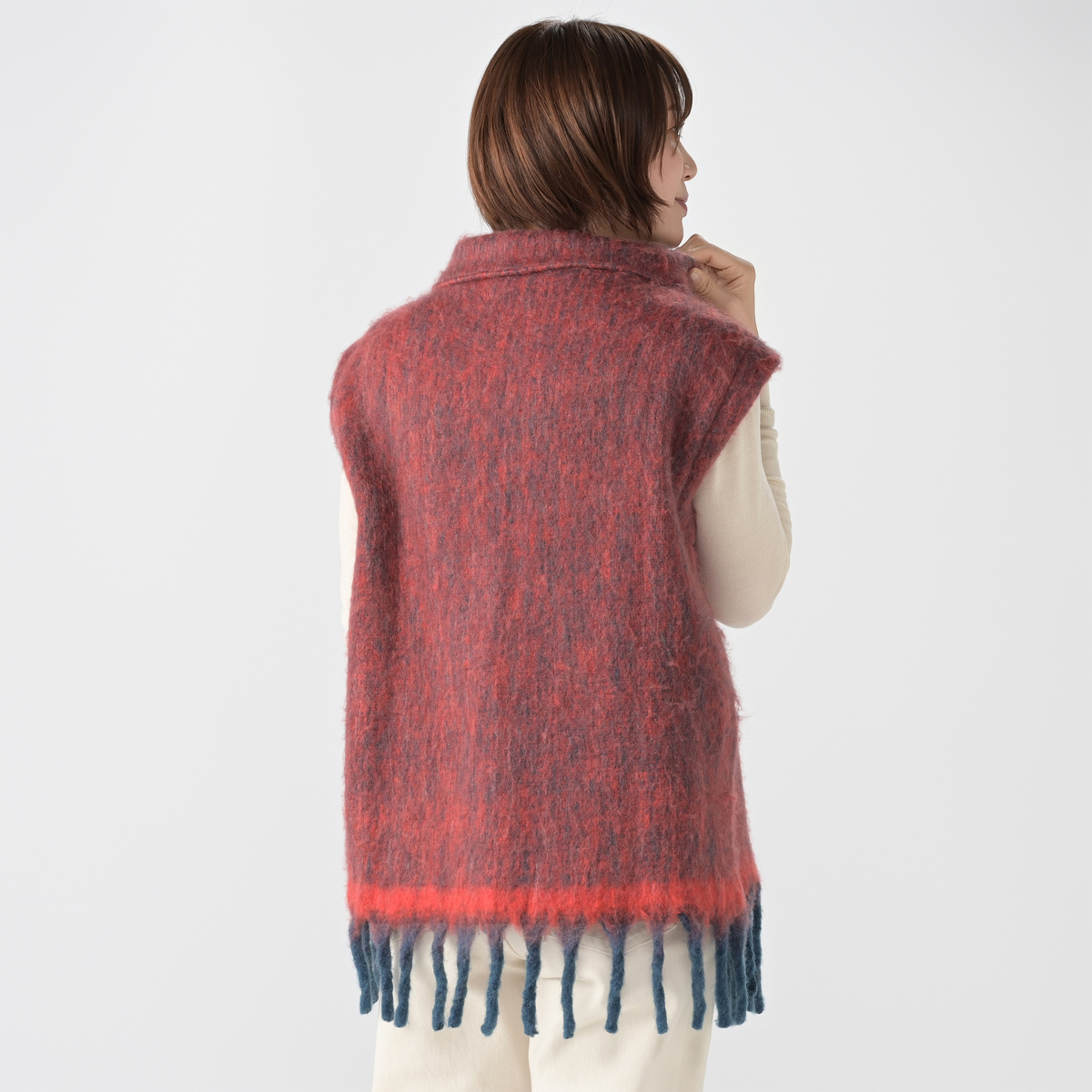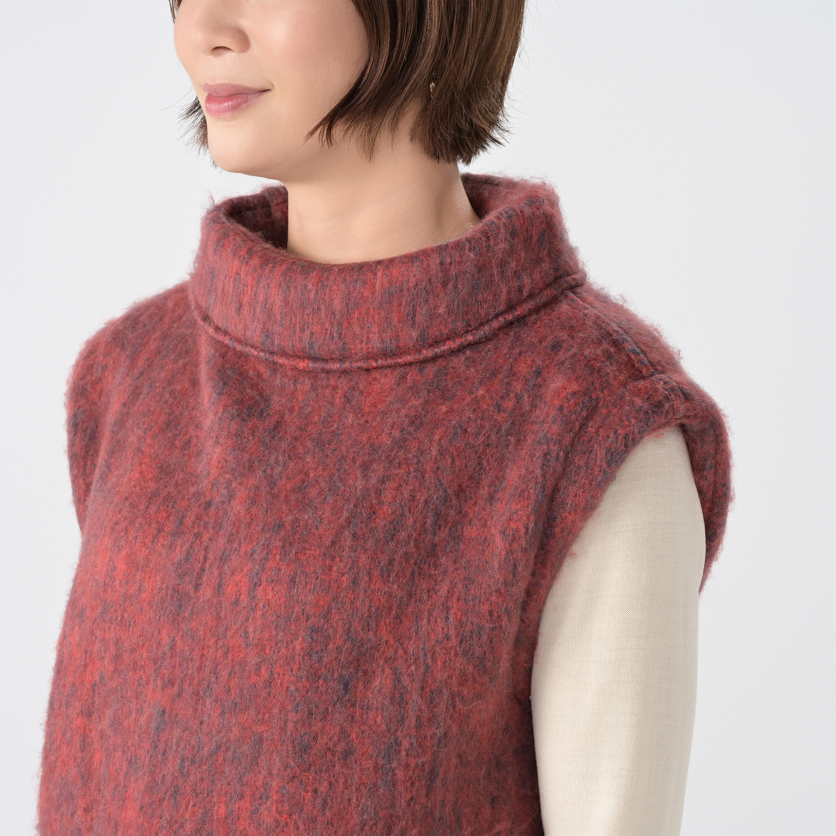 ウール混生地を使用し、軽やかで暖かな着心地のベスト。ワイドなシルエットとたっぷりのアームホールで重ね着しやすく、ふわっと着ていただけます