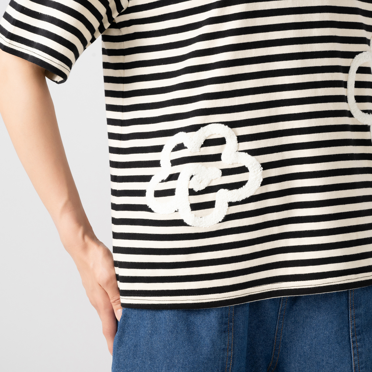 サガラ刺繍のアジアンフラワーが目を引くプルオーバー。本体生地は綿素材で、風通しが良く、さらっと着用できます。独特な素材感や光沢があり、程よくストレッチするのでアクティブなシーンでも心地よくお召しいただけます