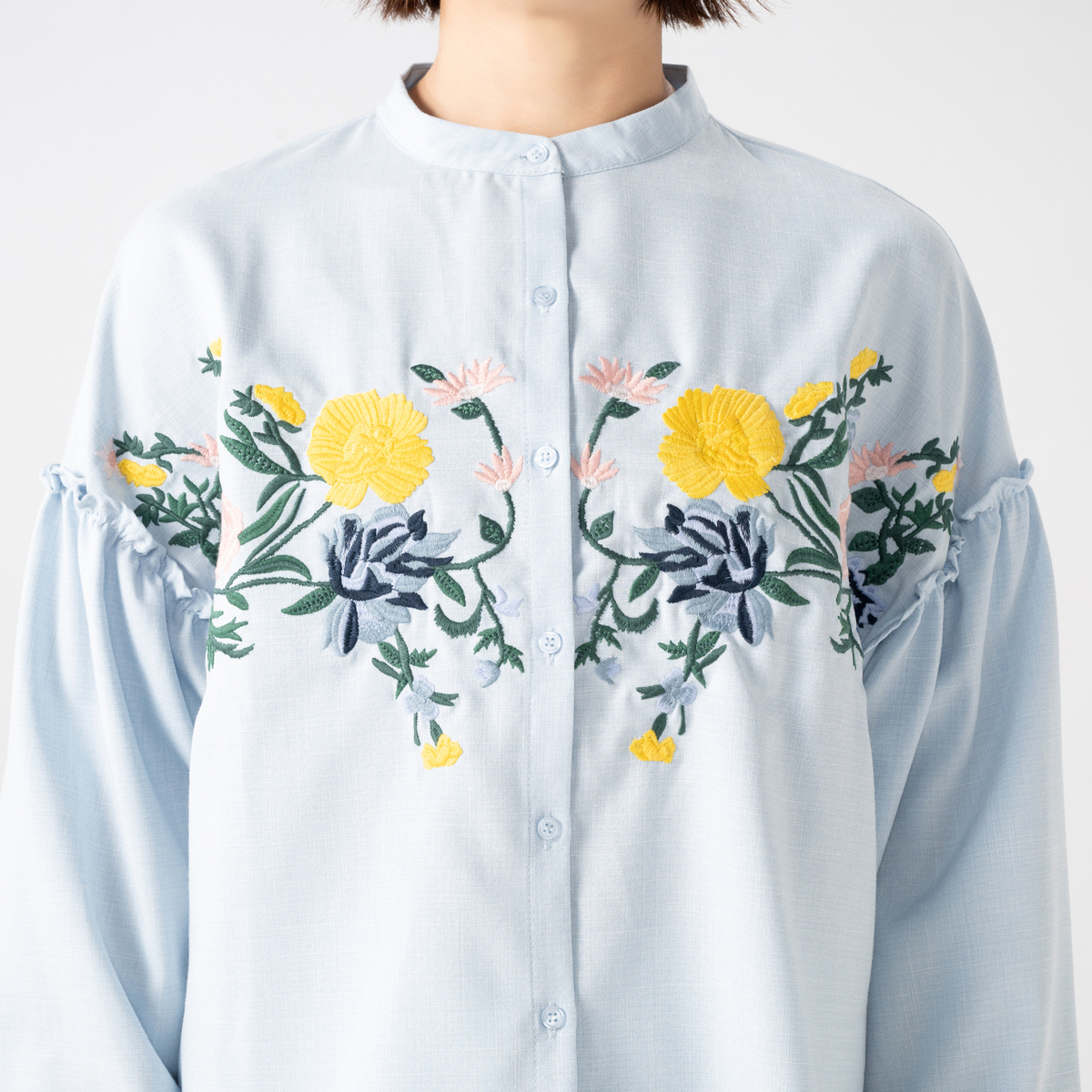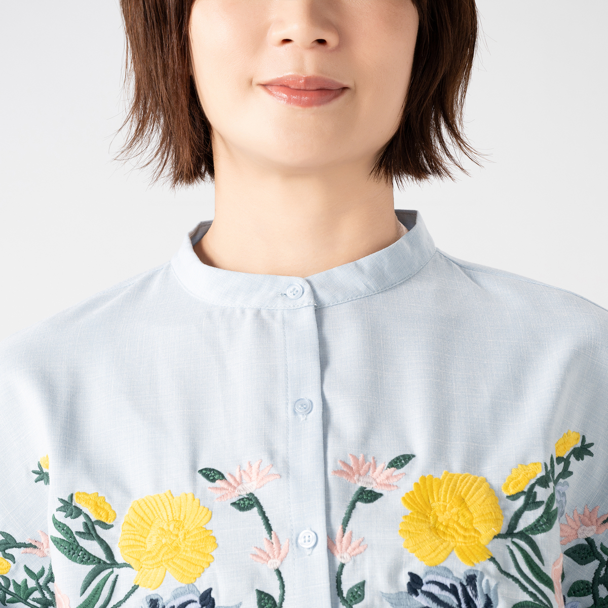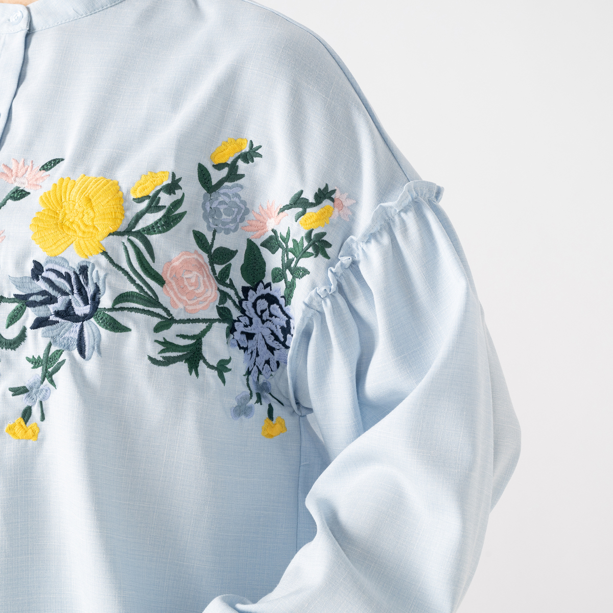 繊細なボタニカル柄刺繍が目を引く上品なブラウスです。しなやかな素材で肌触りがよく、ほどよい光沢感と落ち感が、柔らかな印象を引き立てます。自宅でのお手入れもしやすい素材なので、日常使いにもおすすめです