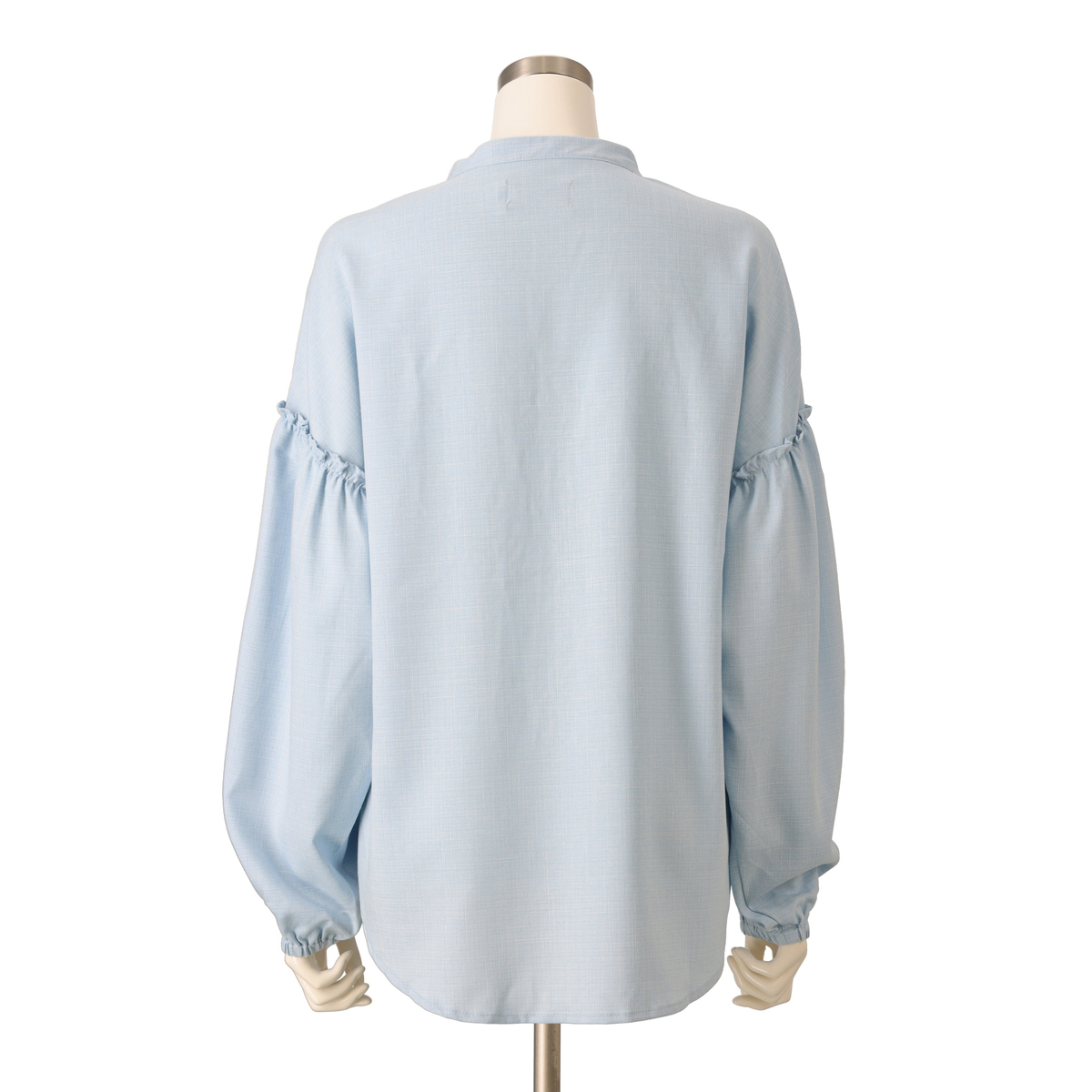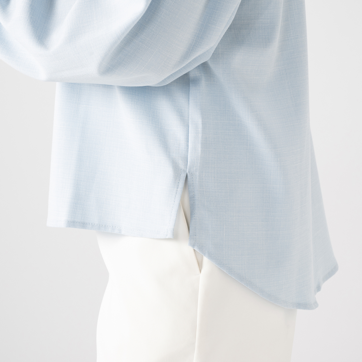 ノーカラーでお顔まわりがすっきり見え、袖は総ゴム仕様で腕をまくってアレンジも楽しめます。後ろ裾の前後差やフロント刺繍が、羽織りとして着用した時にもスタイリッシュな存在感を演出します