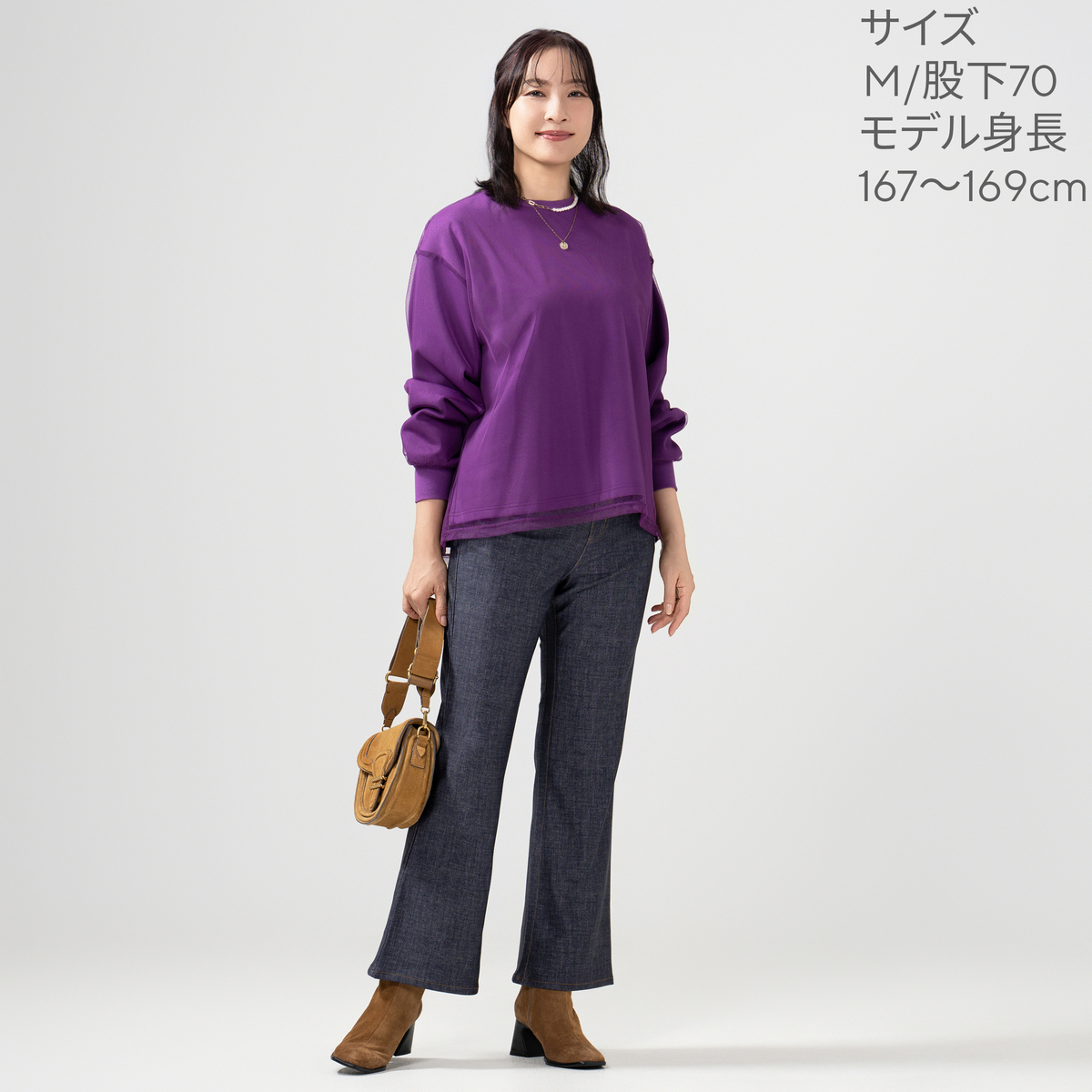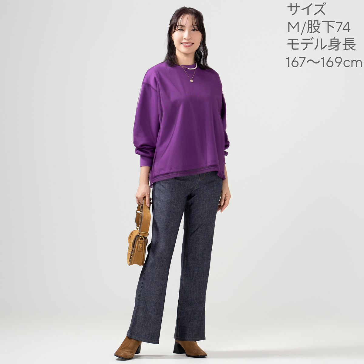 いつものMサイズで股下66。股下もバッチリで、短い脚もきれいに見えます。軽くて動きやすく伸縮性が良いです。 ボブソンのこれと同じストレートを持っていて、やはりベルボトムの方がスタイル良く穿けます。 真冬には穿かないけど、春から秋まで穿けるのでお安くなったタイミングで買えて良かったです。