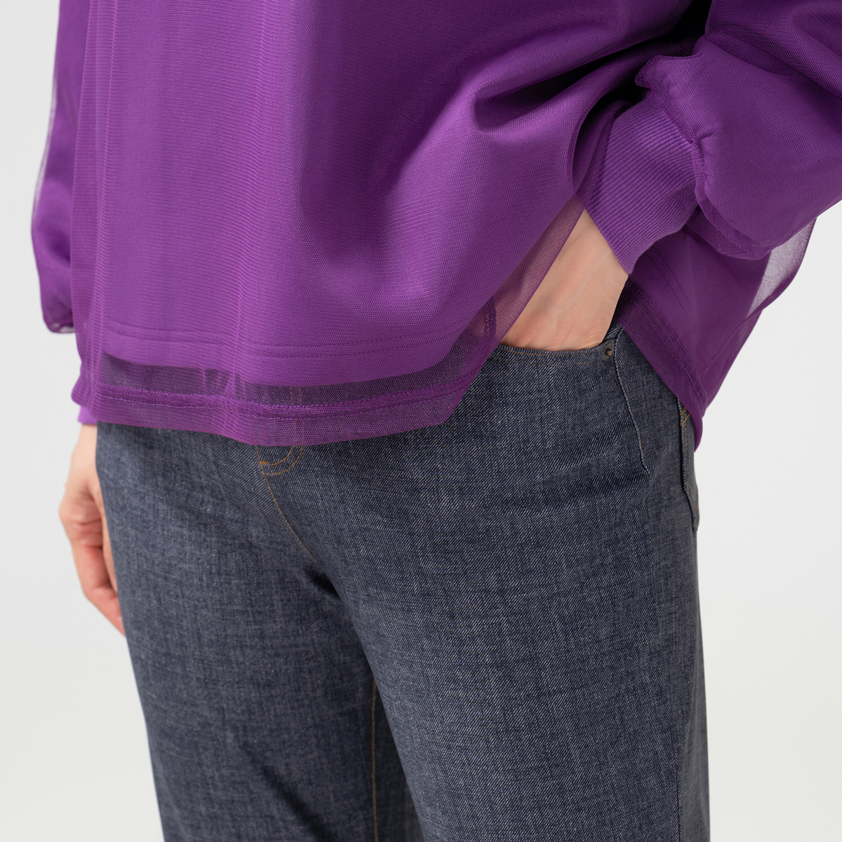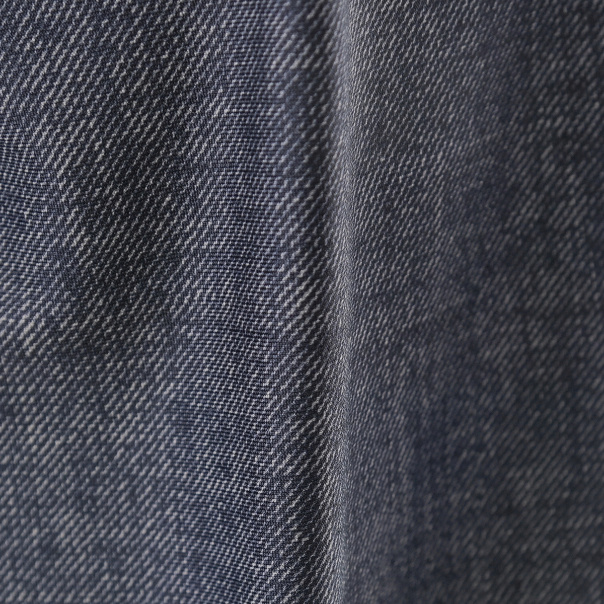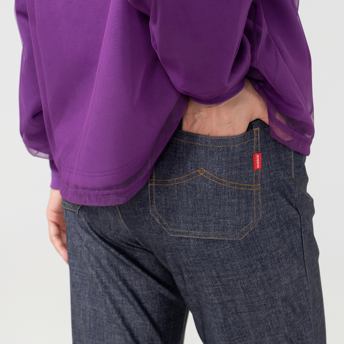 ストレッチ性のあるタテ編みタイプのハイテンションニットを使用した快適な穿き心地。また、リアルなデニム見えを追求するため、原料を先に染めてベースカラーを作り、その上に転写プリントをしました。吸水速乾・UVカット・防シワ性の機能があり、摩擦等によるピリングができにくい素材です