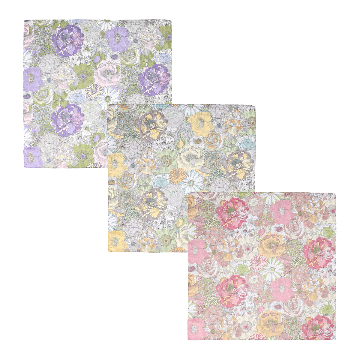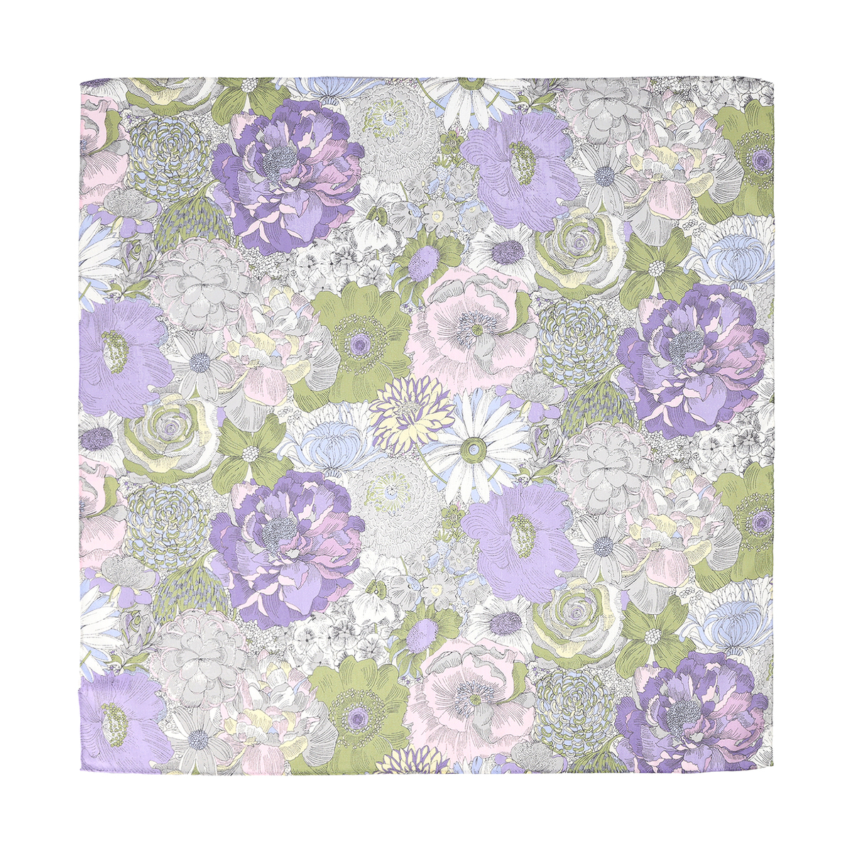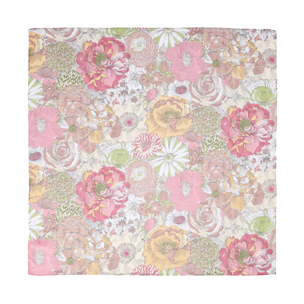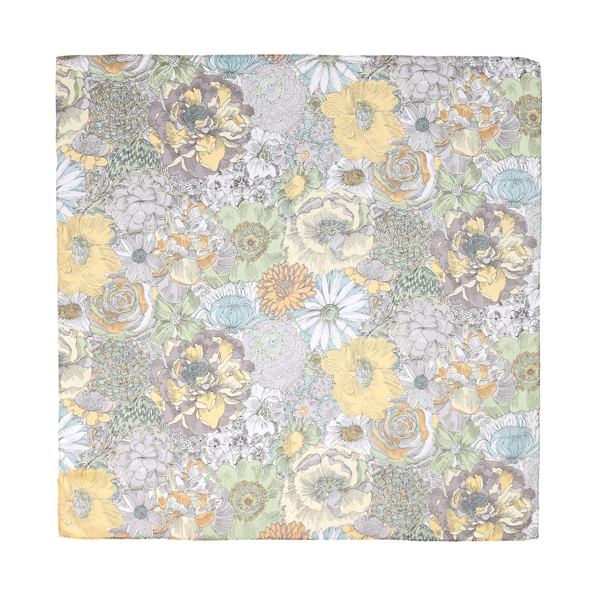 繊細な柄が素敵なハンカチ。グラファイト鉛筆で描かれたオリジナルのスケッチ画をもとに描かれた花柄をいくつも組合せ、リピートをつけてアレンジし、ファーバーカステルの色鉛筆で色づけした柄です