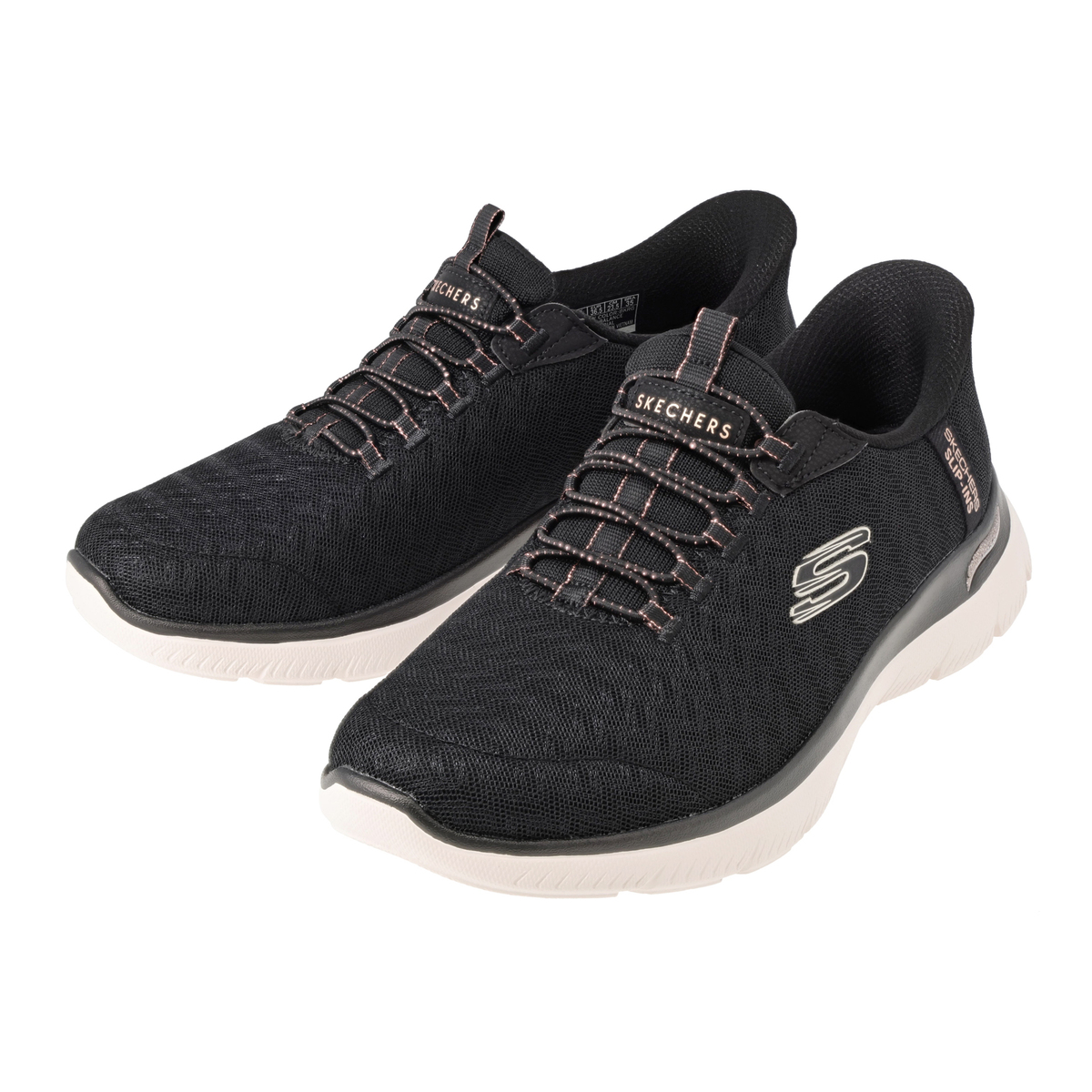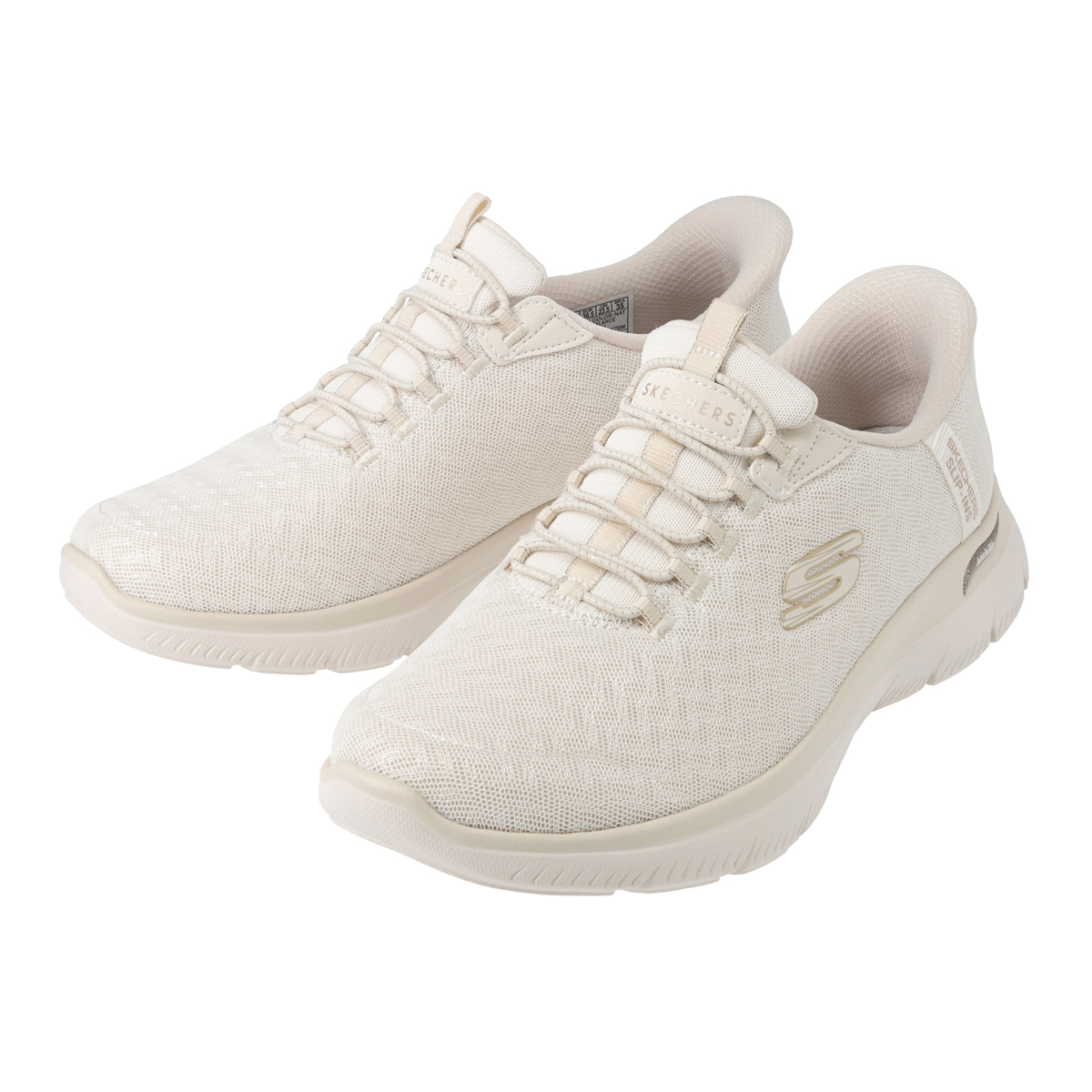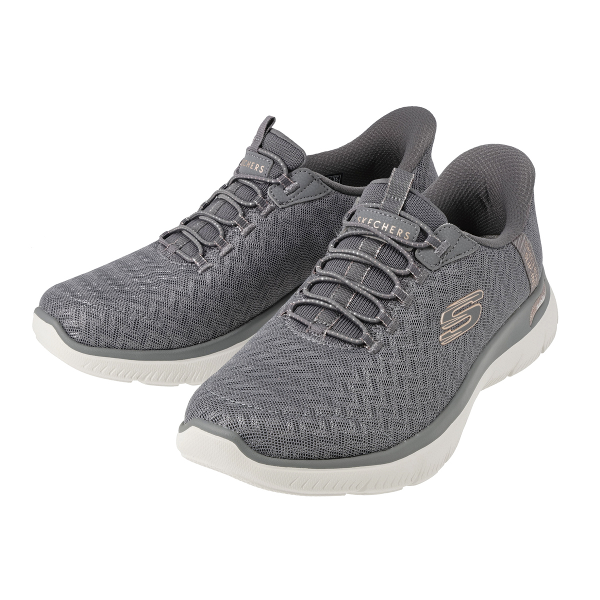 アッパーに伸縮性のあるゴム紐を搭載し、靴ひもを結ぶ必要がないスケッチャーズノータイフィット。細かい編み目のデザインに、メタリック素材をさりげなく混ぜ込むことで、単色にはない立体感が生まれ、上品で高級感のある1足に仕上げています