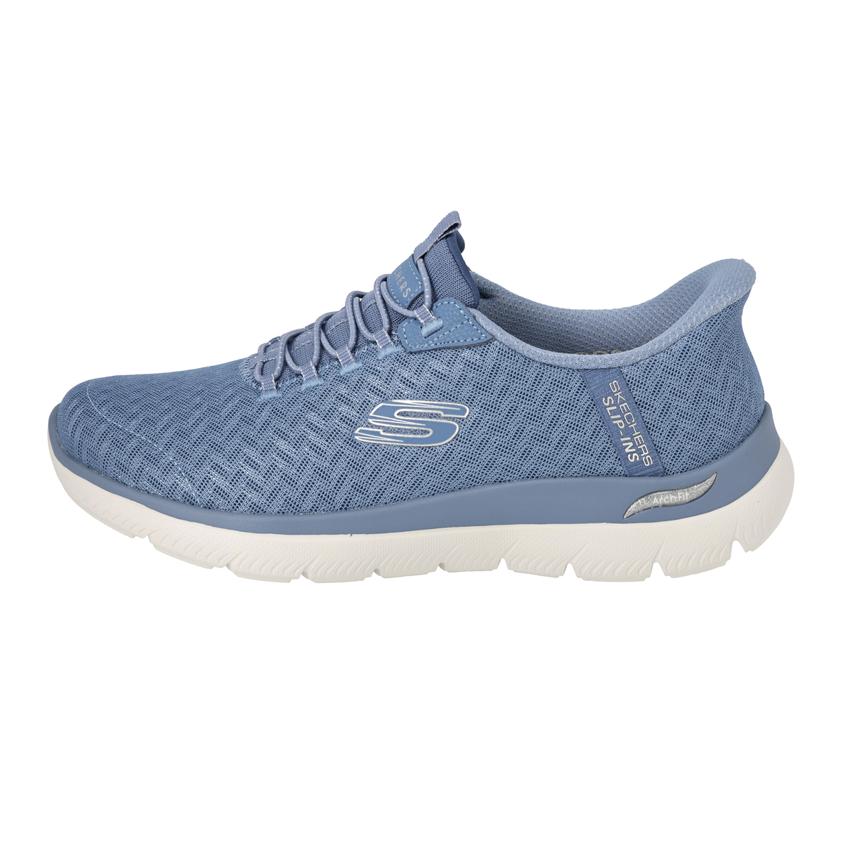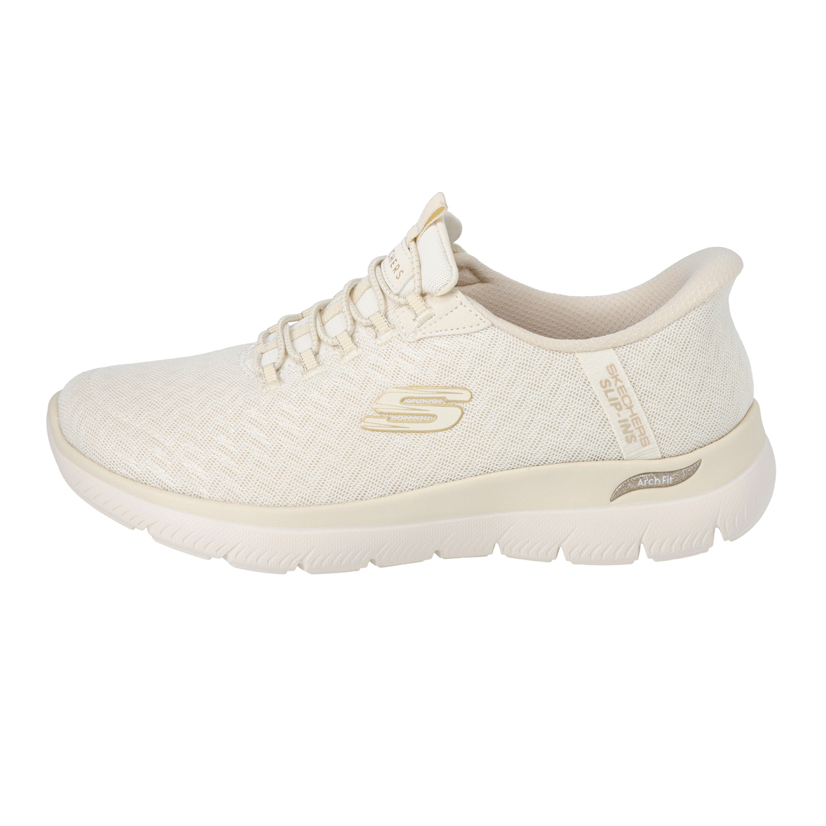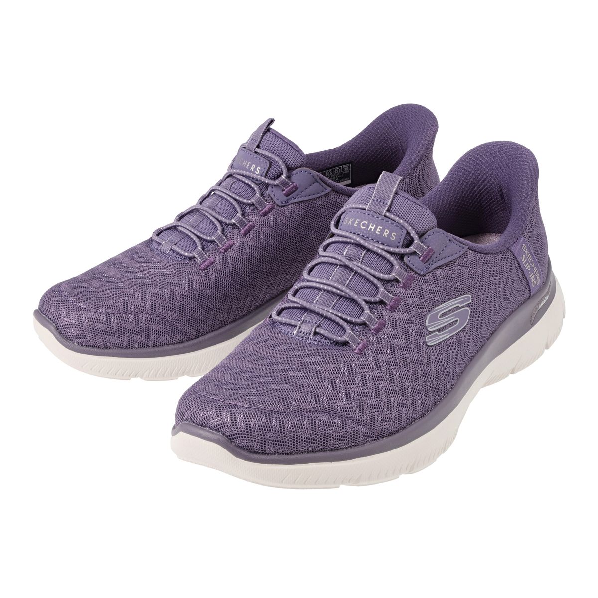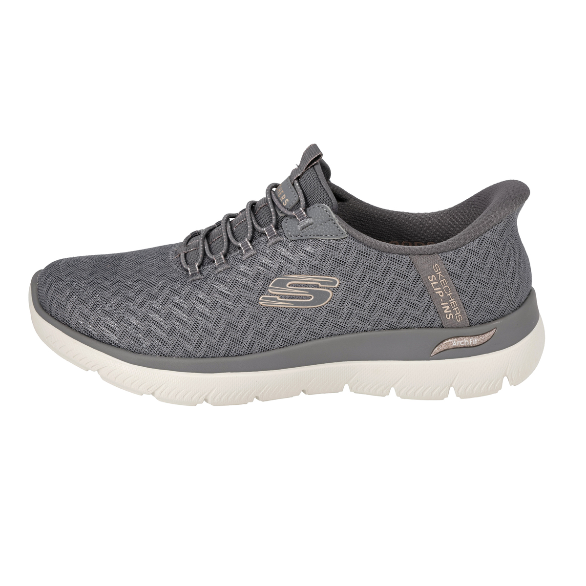 アッパーに伸縮性のあるゴム紐を搭載し、靴ひもを結ぶ必要がないスケッチャーズノータイフィット。細かい編み目のデザインに、メタリック素材をさりげなく混ぜ込むことで、単色にはない立体感が生まれ、上品で高級感のある1足に仕上げています