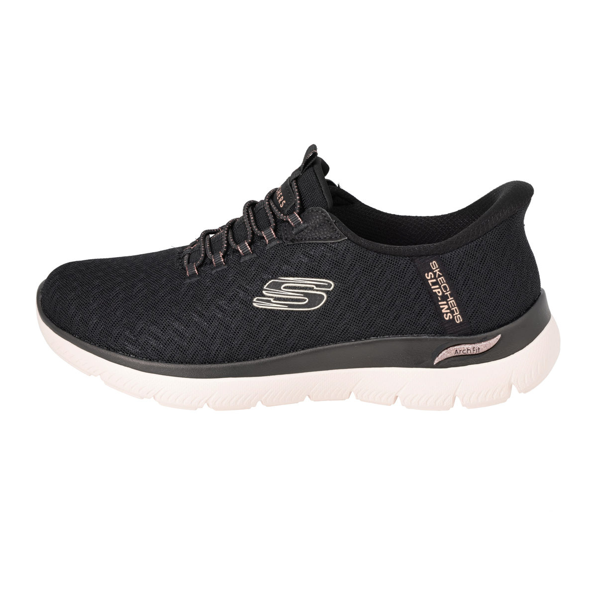 踵部分には手を使わずにハンズフリーで着脱可能なスケッチャーズハンズフリースリップインズ機能を搭載。靴ベラのようなヒールピローの形状により、スムーズに足入れができ脱げにくくなっています