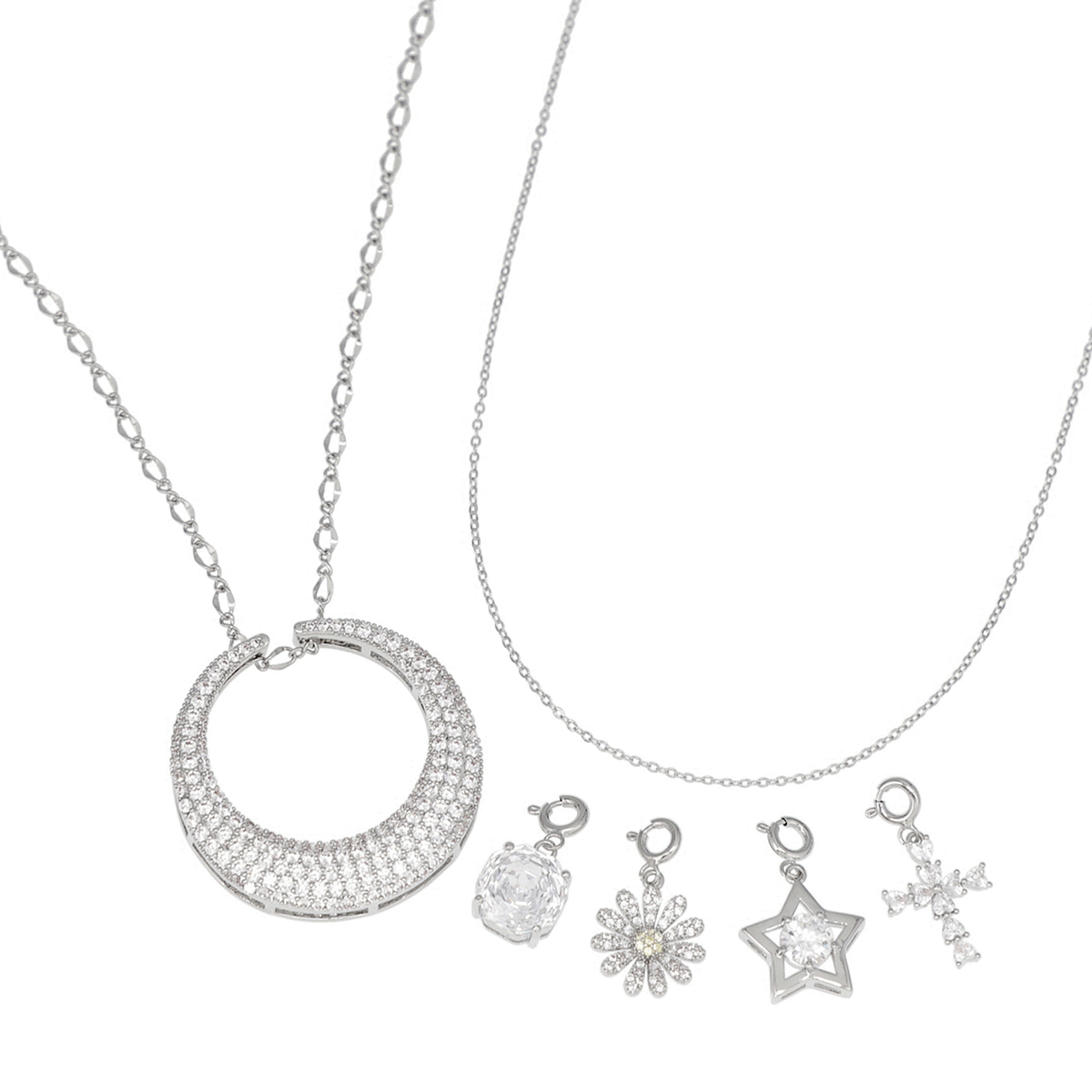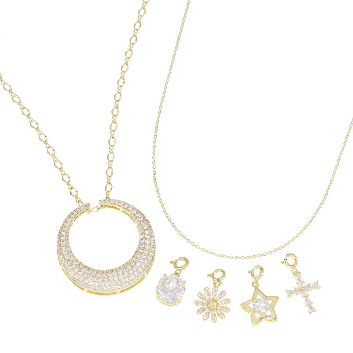 お月様のネックレスだけでもかなり高見えします。これ1つのお値段でもお得です。チェーンの通し方で更に印象も変わります。星1つマイナスは、チャームの付けはずしがやりにくい、特に、薔薇のチャームがやりにくいです。慣れれば大丈夫かな?あと、今まで開閉式のチャームをいくつか集めているんだけど、それが利用出来ればなお、良かったです。あと、ちょっとだけ内径があれば、チャームを使えたのにスッゴく残念です・・後は、どのチャームも素敵です。ホントにお得なセットです。ジンカ様の素敵な発想力、お財布に優しいお値段、ついつい、ポチってしまいます。毎日付け替えても足りない位コレクションさせて頂いています。