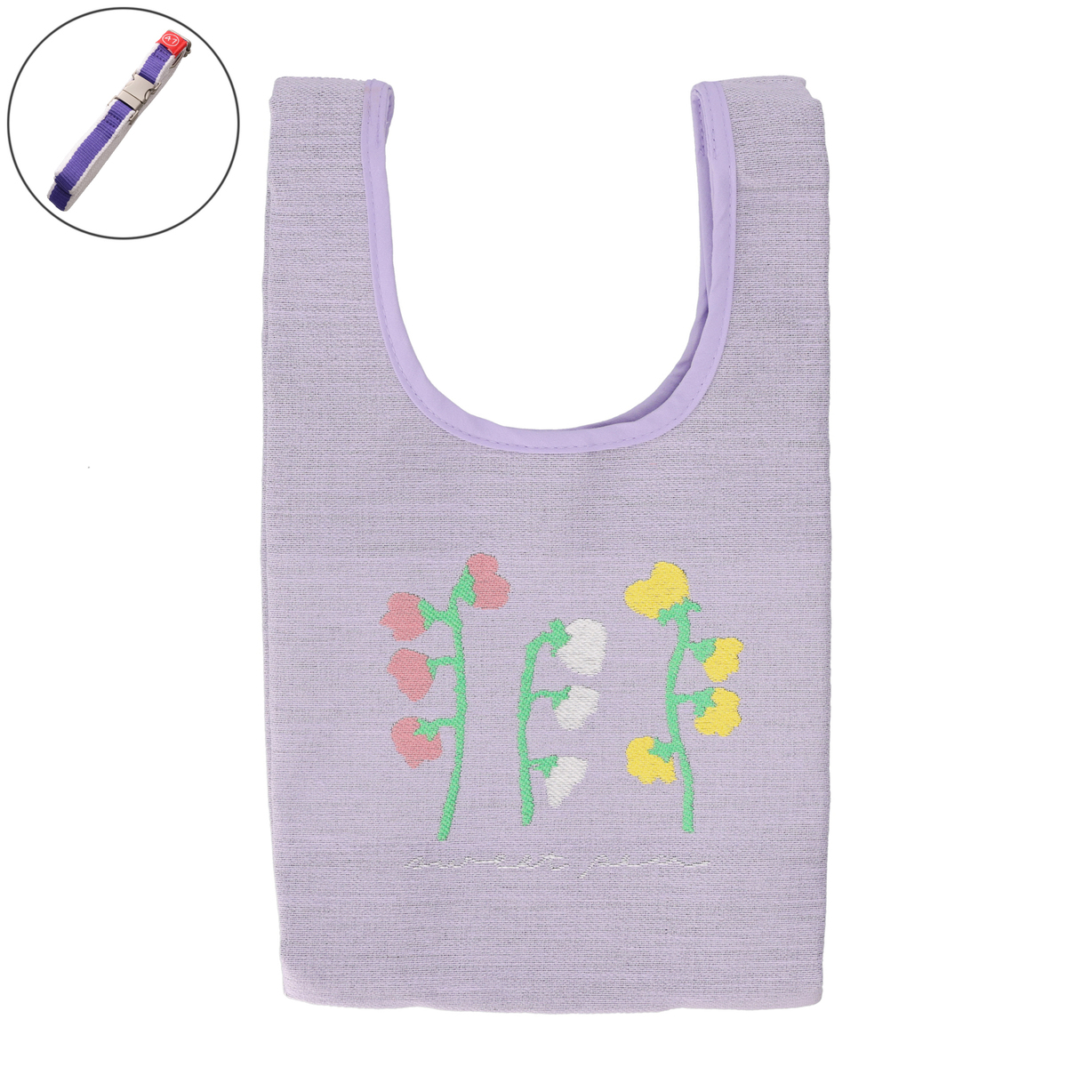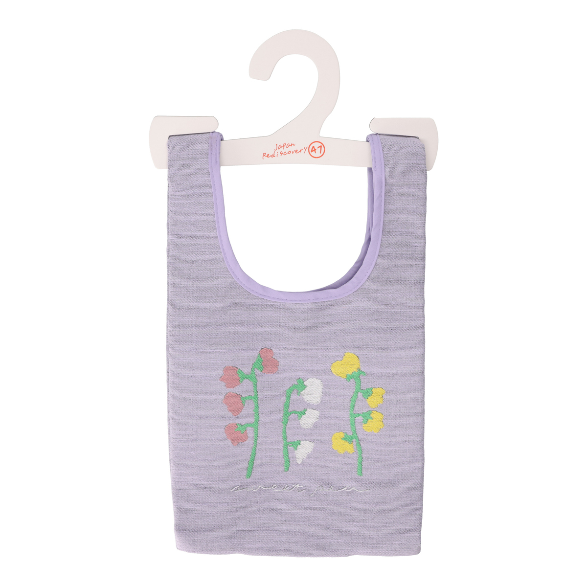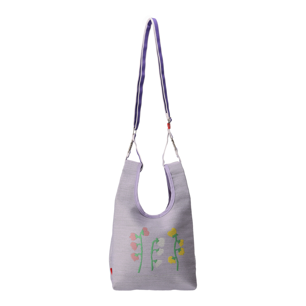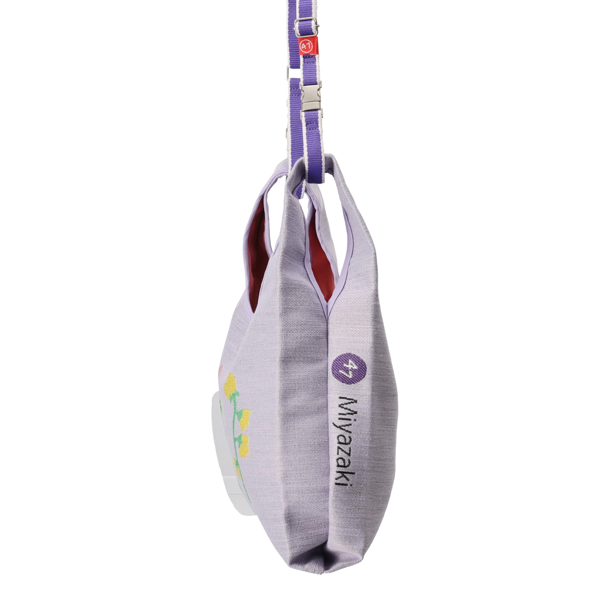 宮崎を表すモチーフとして「スイートピー」をデザインしたバッグ。ジャカード織りならではの立体感とあたたかみがあり、デザインに豊かな表情と奥行きを感じさせます。コンパクトなサイズ感ですが500mlのペットボトルも入り、内側に吊り下げポケットが一つ付いているので、鍵などの小物も収納可能です
